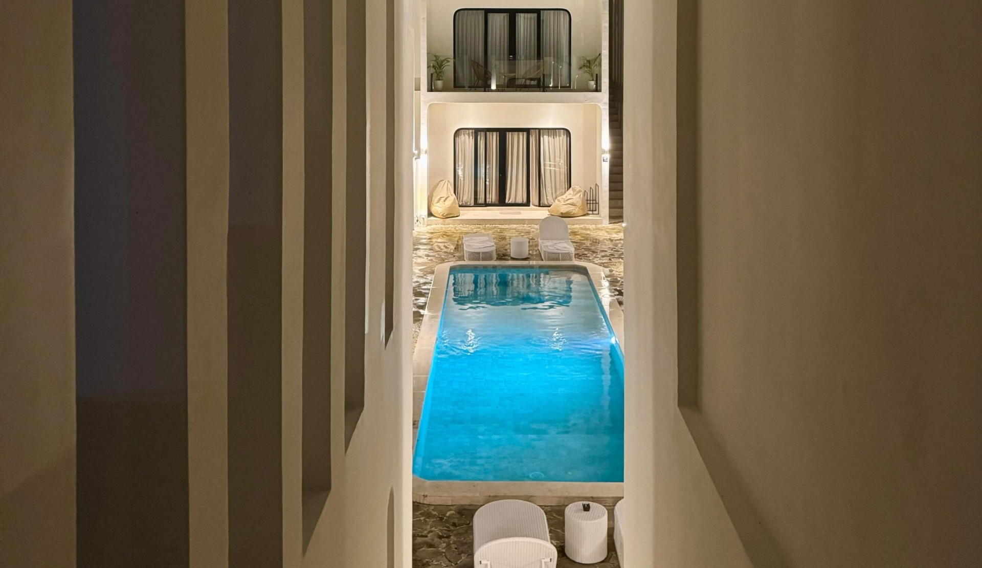 L’architecture s’inspire de l’esthétique tropicale minimaliste, avec des courbes douces, de larges fenêtres cintrées et des tons doux. De grands panneaux de verre apportent de la lumière naturelle, mettent en valeur l’espace et créent une atmosphère fraîche et aérée. Les balcons donnent sur la piscine commune, encadrée par des façades blanches modernes qui donnent au complexe une ambiance méditerranéenne contemporaine.
