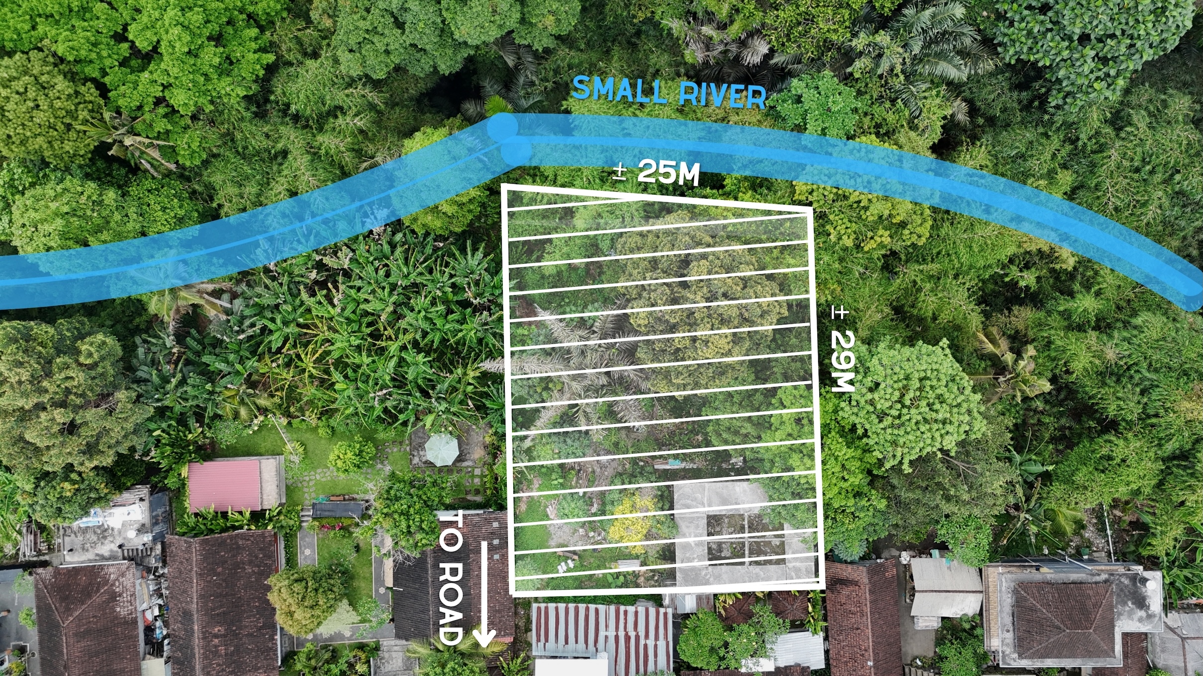 Le terrain s’étend sur environ 25 mètres le long de la rivière avec une pente douce qui encadre naturellement le paysage tropical environnant. Sa forme rectangulaire et son accès en voiture de 3,5 mètres assurent une conception pratique et une flexibilité de développement, tandis que la zone touristique rose (ITR disponible) permet un large éventail d’utilisations résidentielles ou hôtelières. Avec la demande de villas de luxe à Ubud qui ne cesse d’augmenter, cet emplacement offre un équilibre exceptionnel entre intimité, accessibilité et potentiel d’investissement.