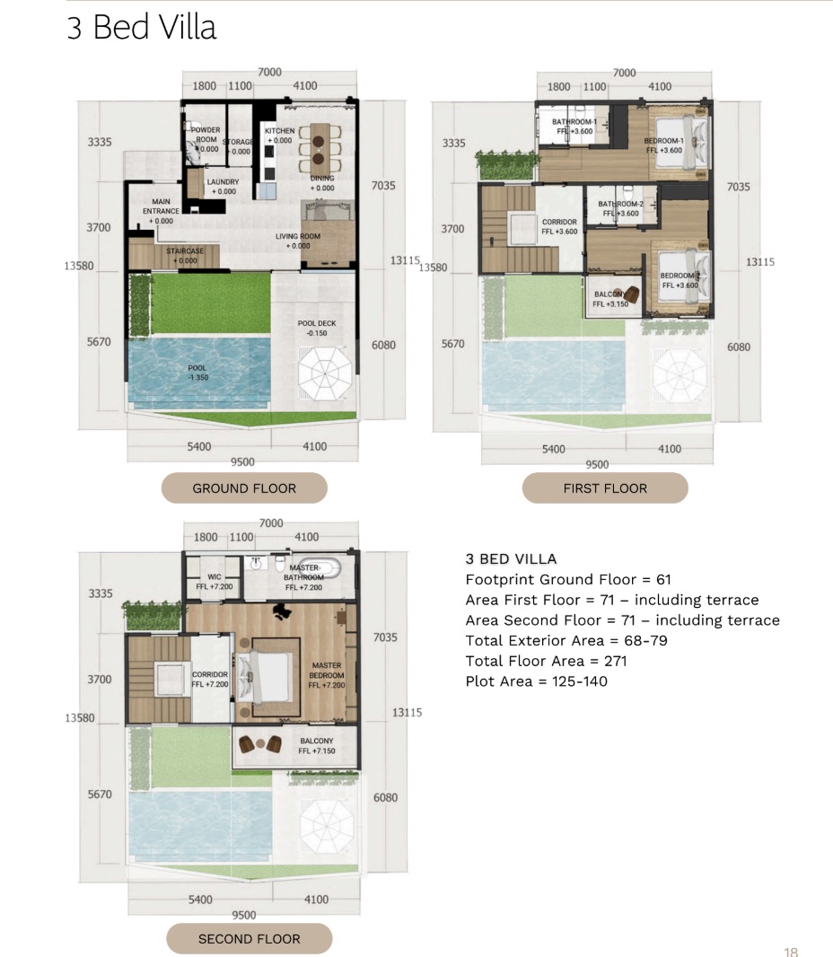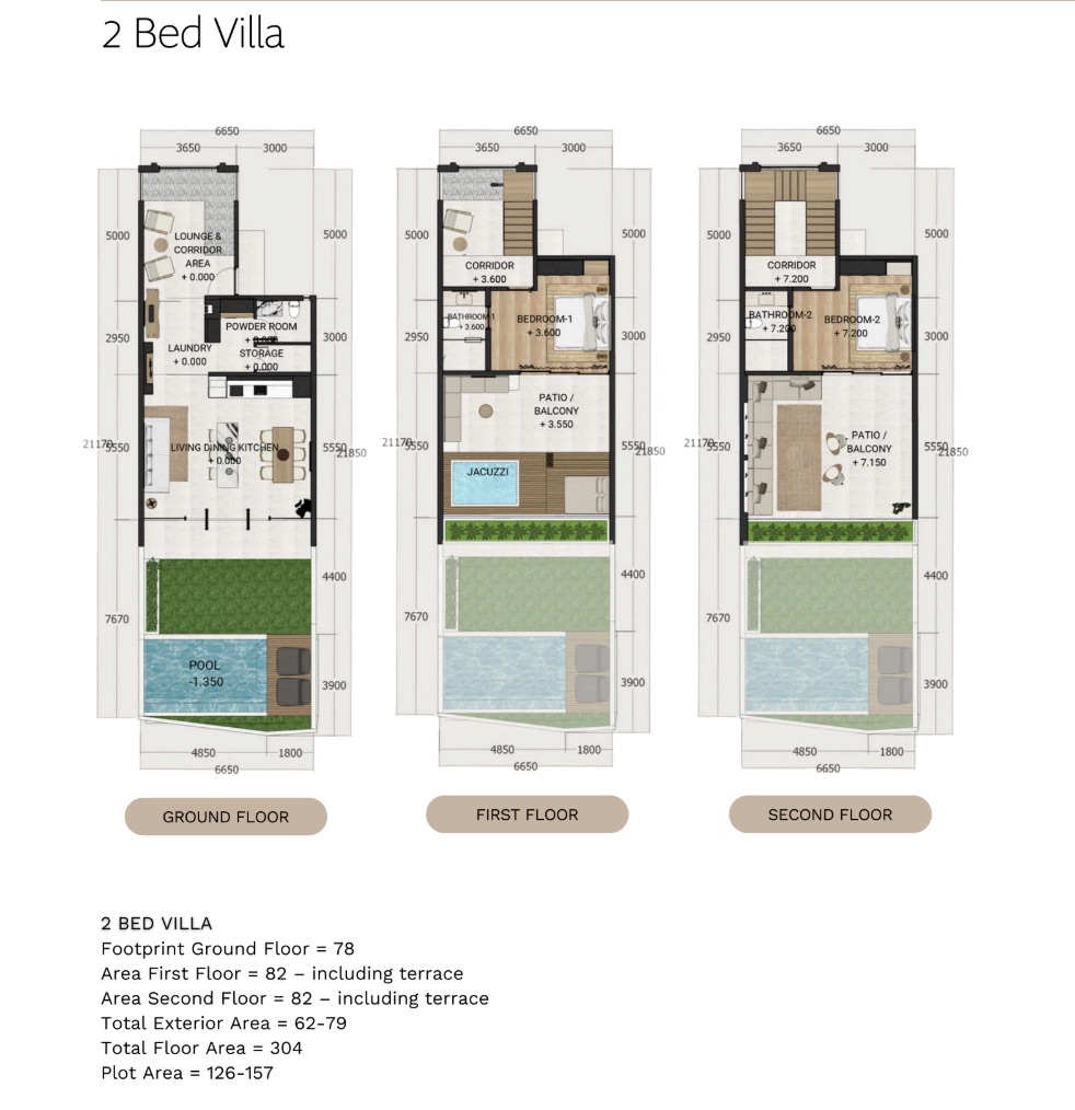 Les unités offrent des surfaces au sol généreuses : 304 m² pour les 2 chambres et 271 m² pour les 3 chambres, toutes dotées d’une piscine privée, de plusieurs terrasses et d’une vue sur le coucher du soleil. Chaque propriété comprend un parking dédié pour une voiture et des scooters, une exigence essentielle pour Berawa.