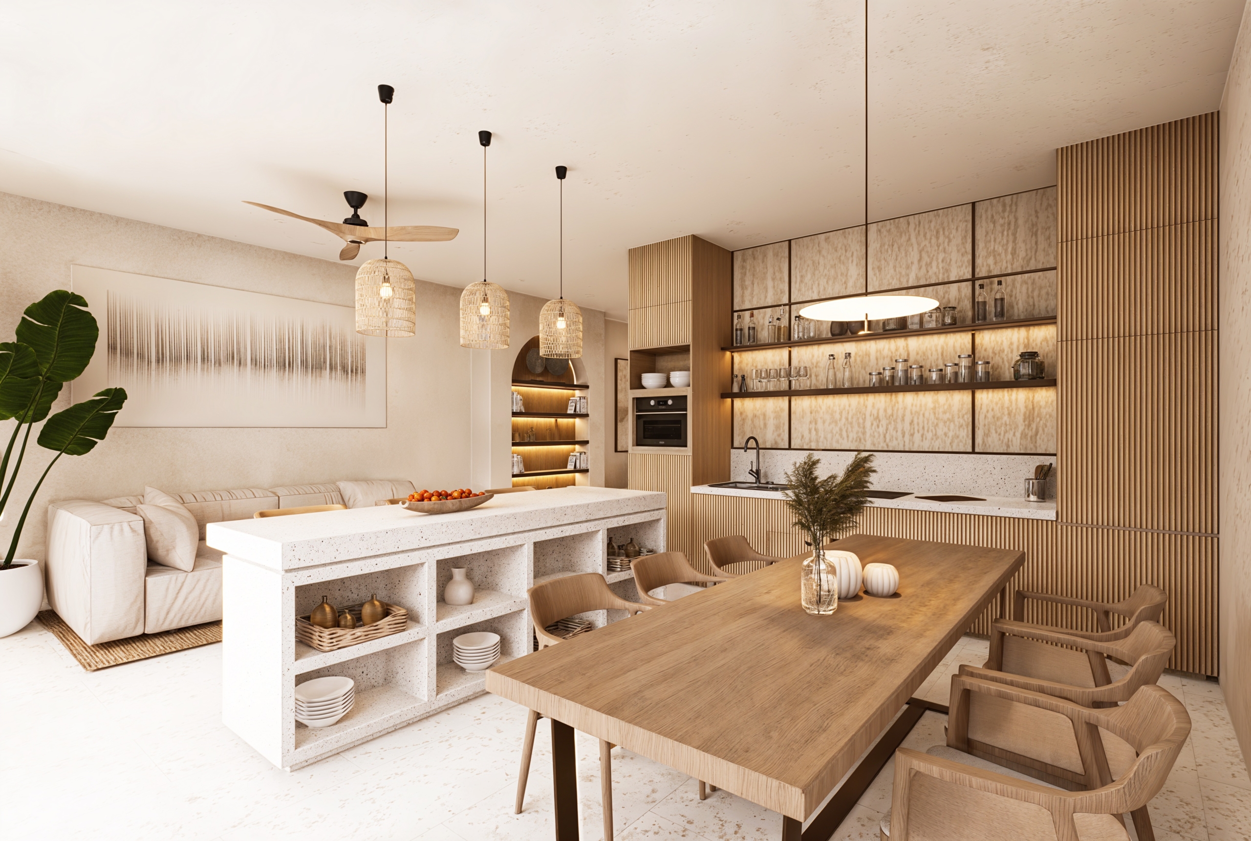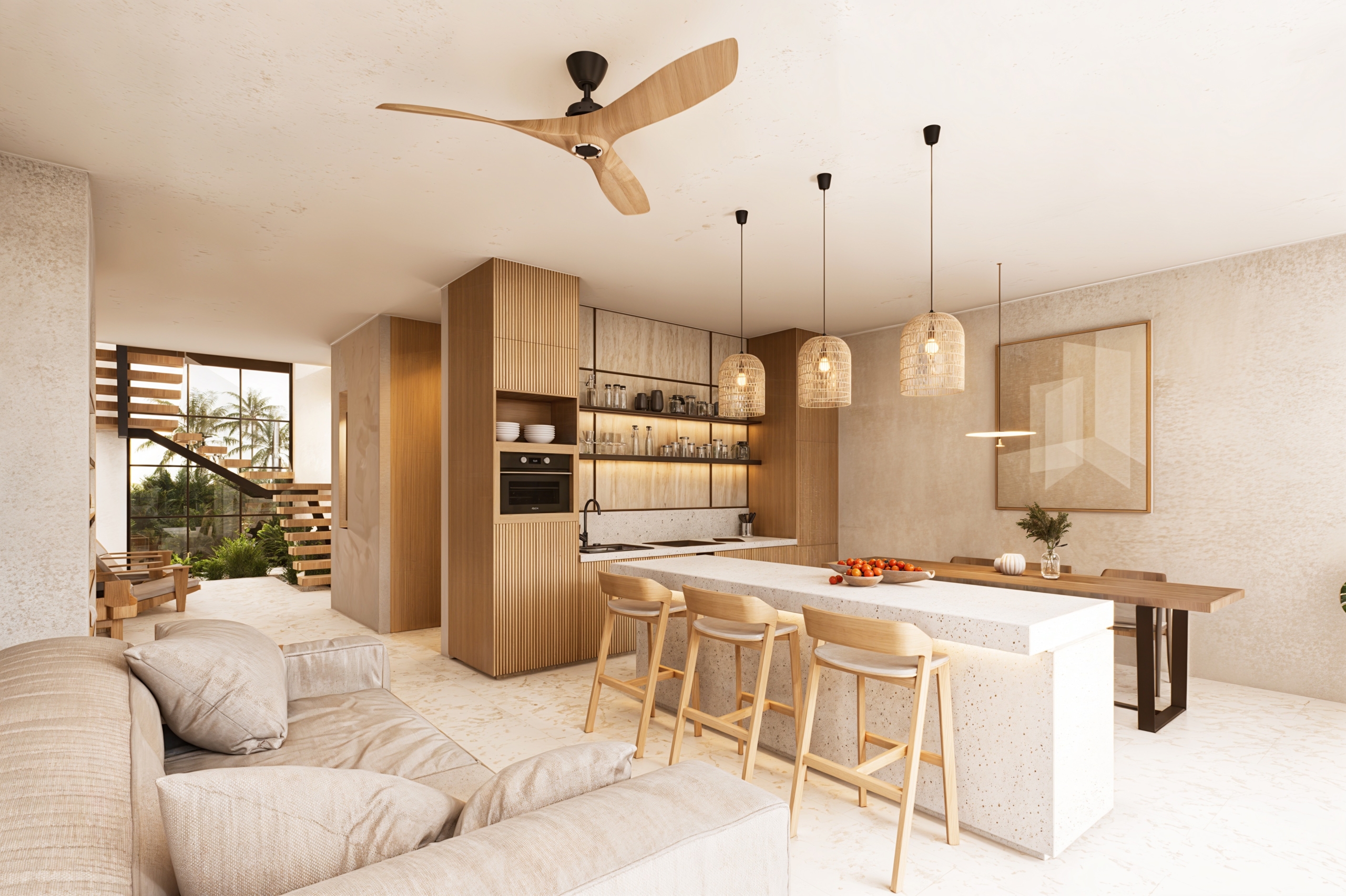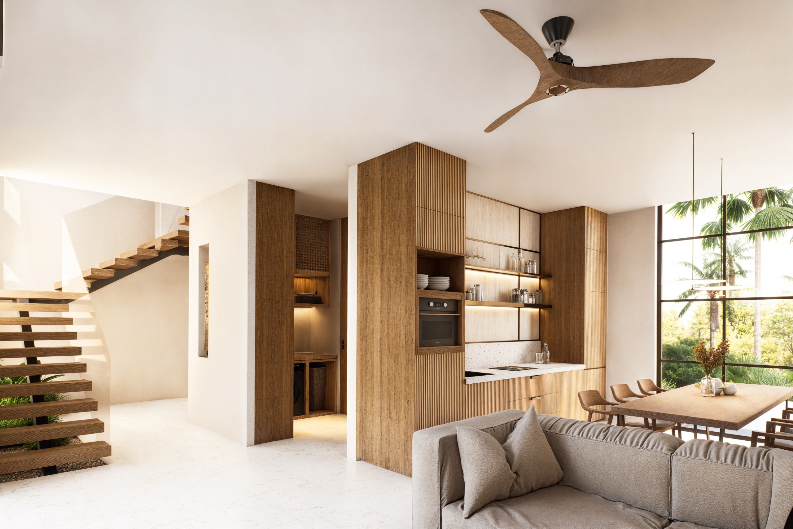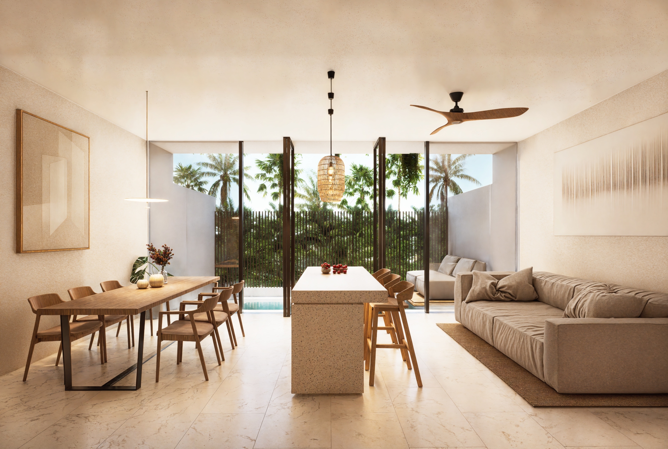 De grandes fenêtres apportent la brise des rizières et la lumière naturelle, et la palette de matériaux comprend de la pierre de Palimana, du terrazzo, de la crème de travertin, des lattes de bois et des détails en rotin-bronze, donnant à l’intérieur une sensation chaleureuse et de villégiature.