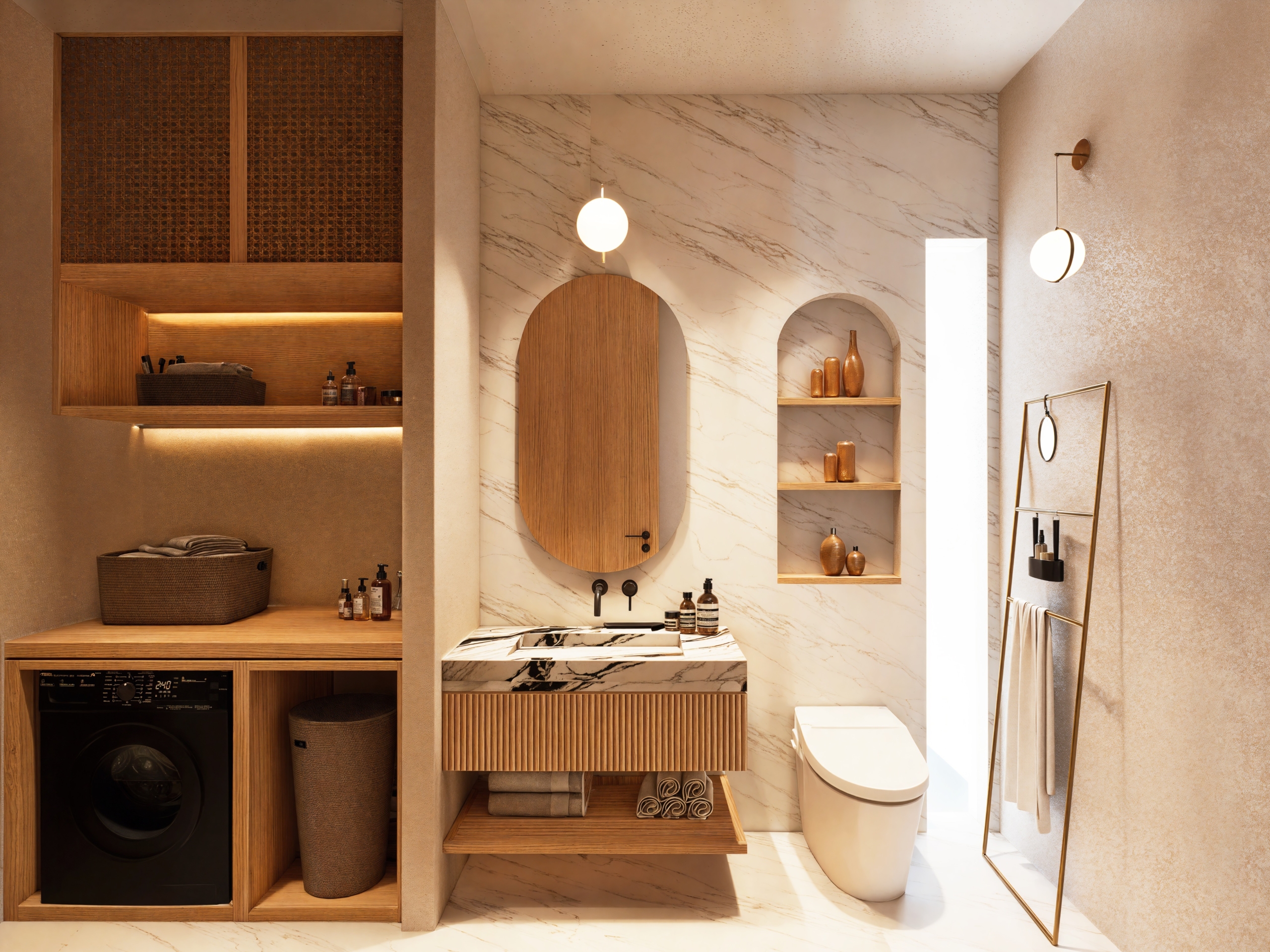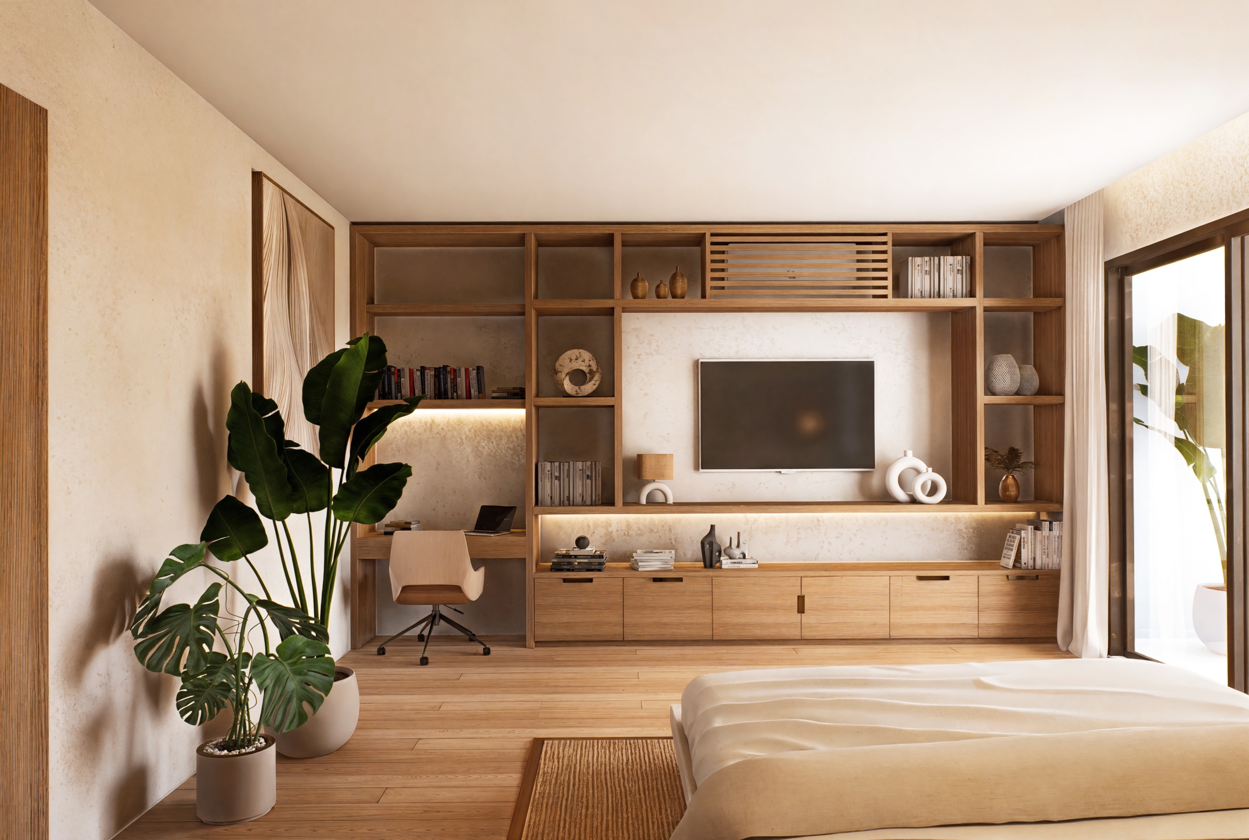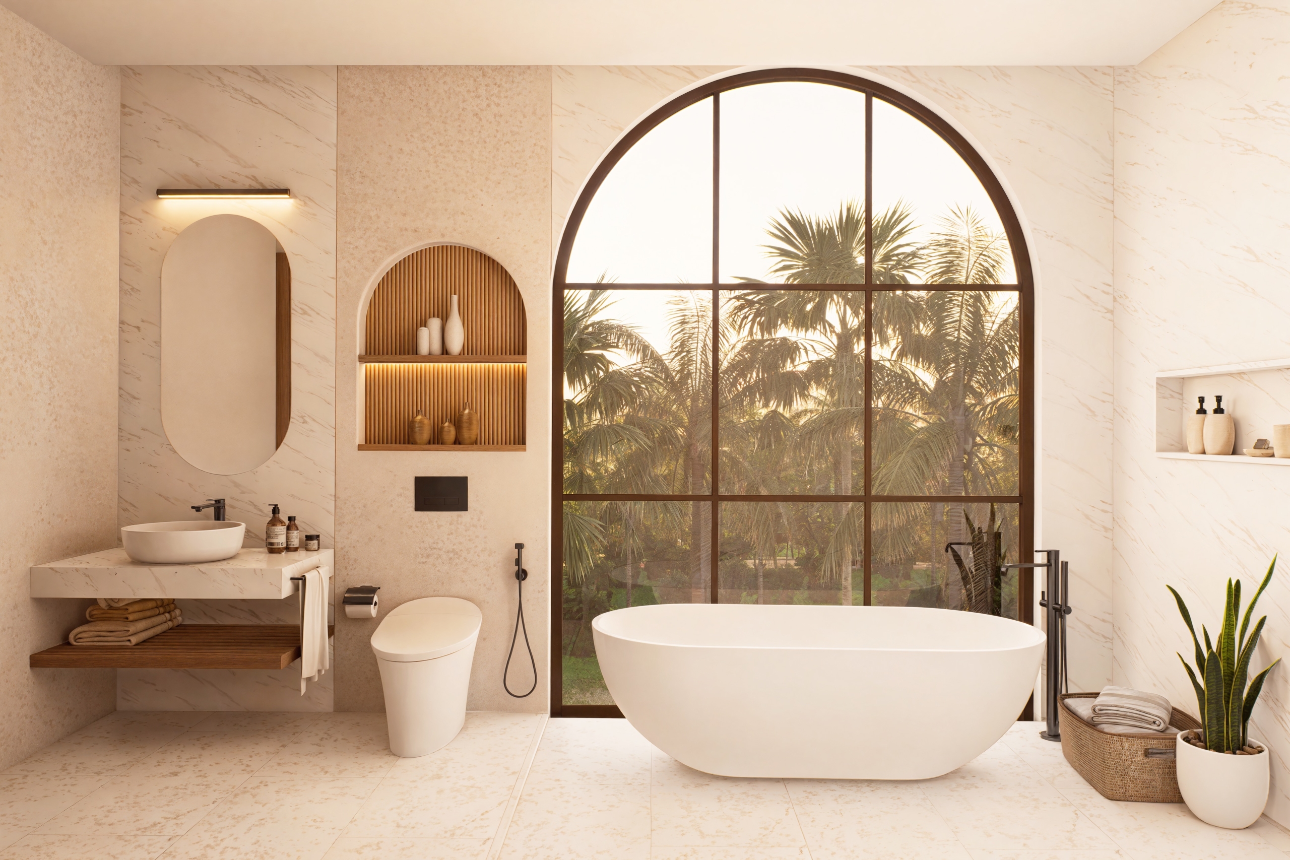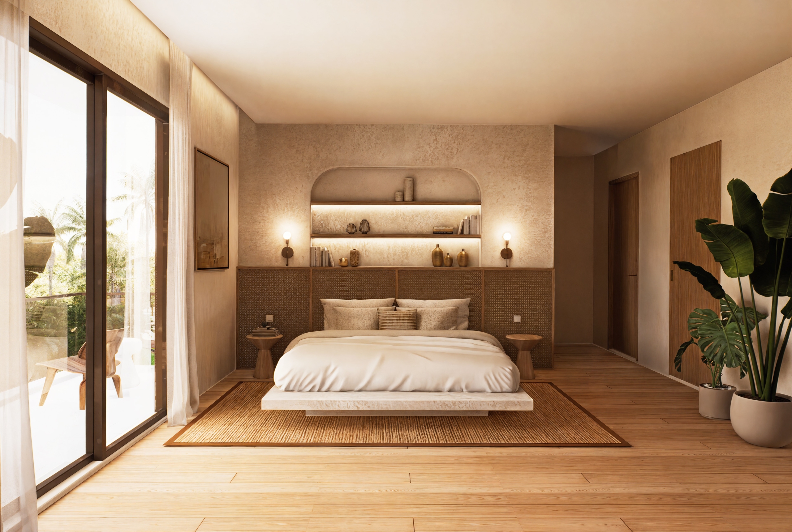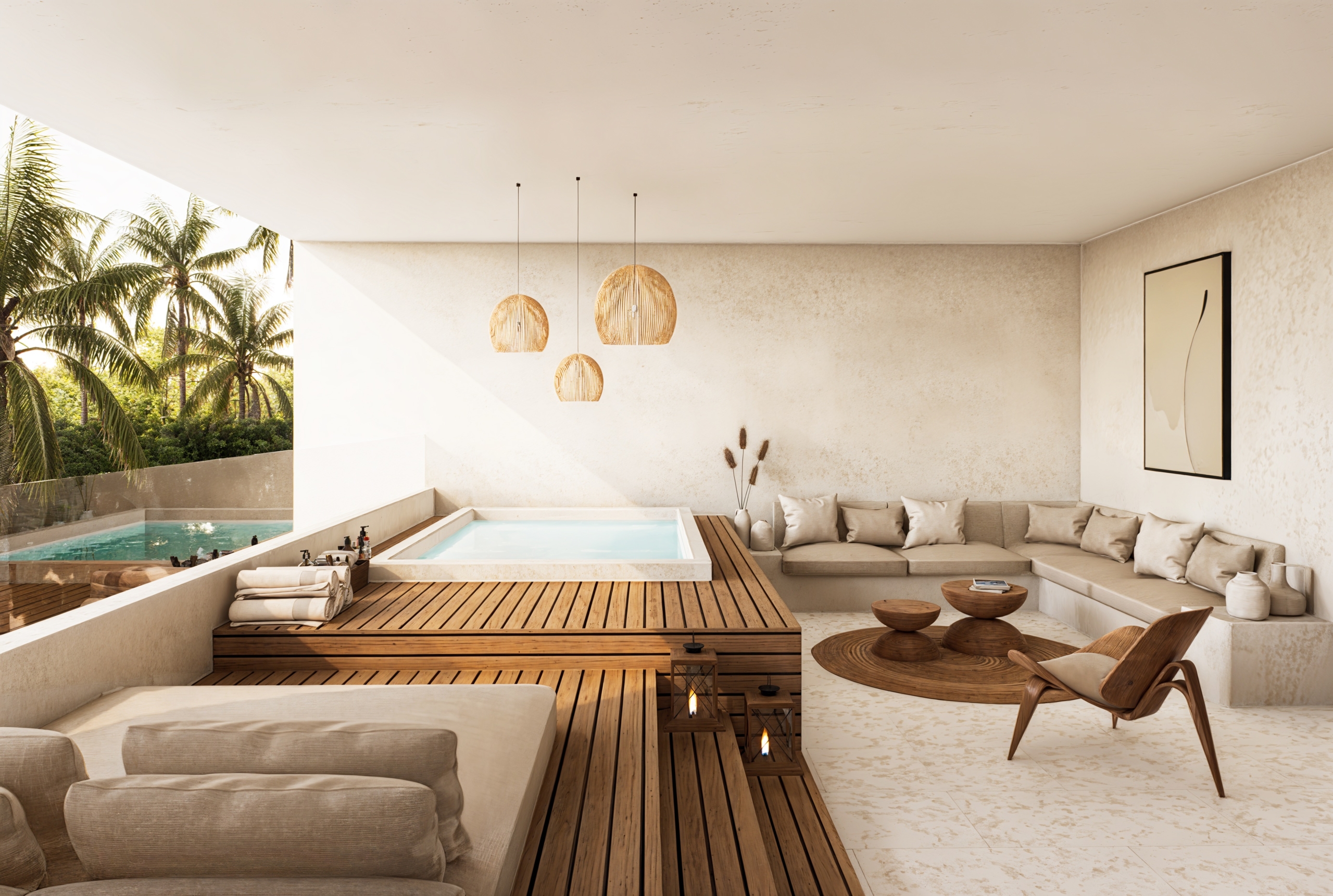 De grandes fenêtres apportent la brise des rizières et la lumière naturelle, et la palette de matériaux comprend de la pierre de Palimana, du terrazzo, de la crème de travertin, des lattes de bois et des détails en rotin-bronze, donnant à l’intérieur une sensation chaleureuse et de villégiature.