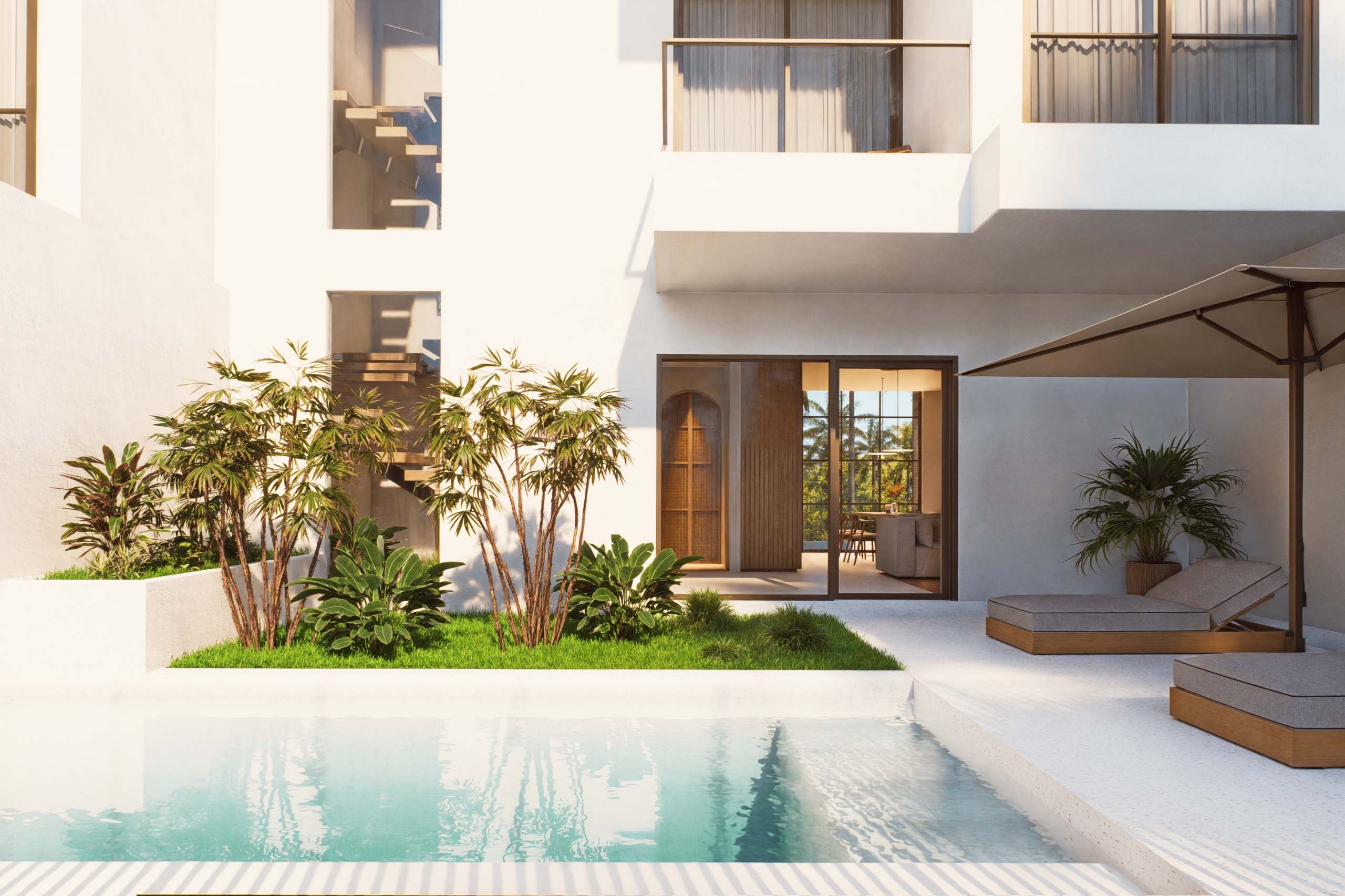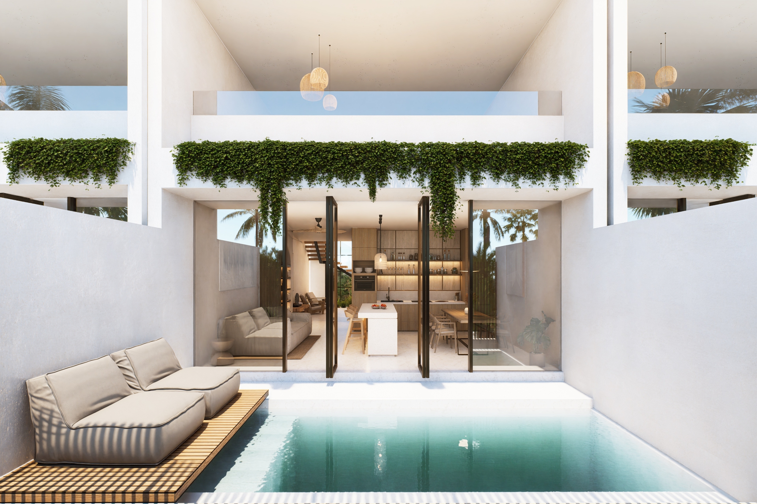Ces villas de ville spacieuses et élégantes se trouvent dans l’un des micro-emplacements les plus forts de Berawa, entourées de rizières ouvertes tout en restant au centre de l’action. Le design mélange des éléments méditerranéens et asiatiques, en utilisant des matériaux chaleureux, des textures naturelles et des aménagements intelligents sur trois niveaux. Le résultat est une maison raffinée, lumineuse et bien adaptée à la fois à la vie personnelle et aux locations à long terme très demandées.
