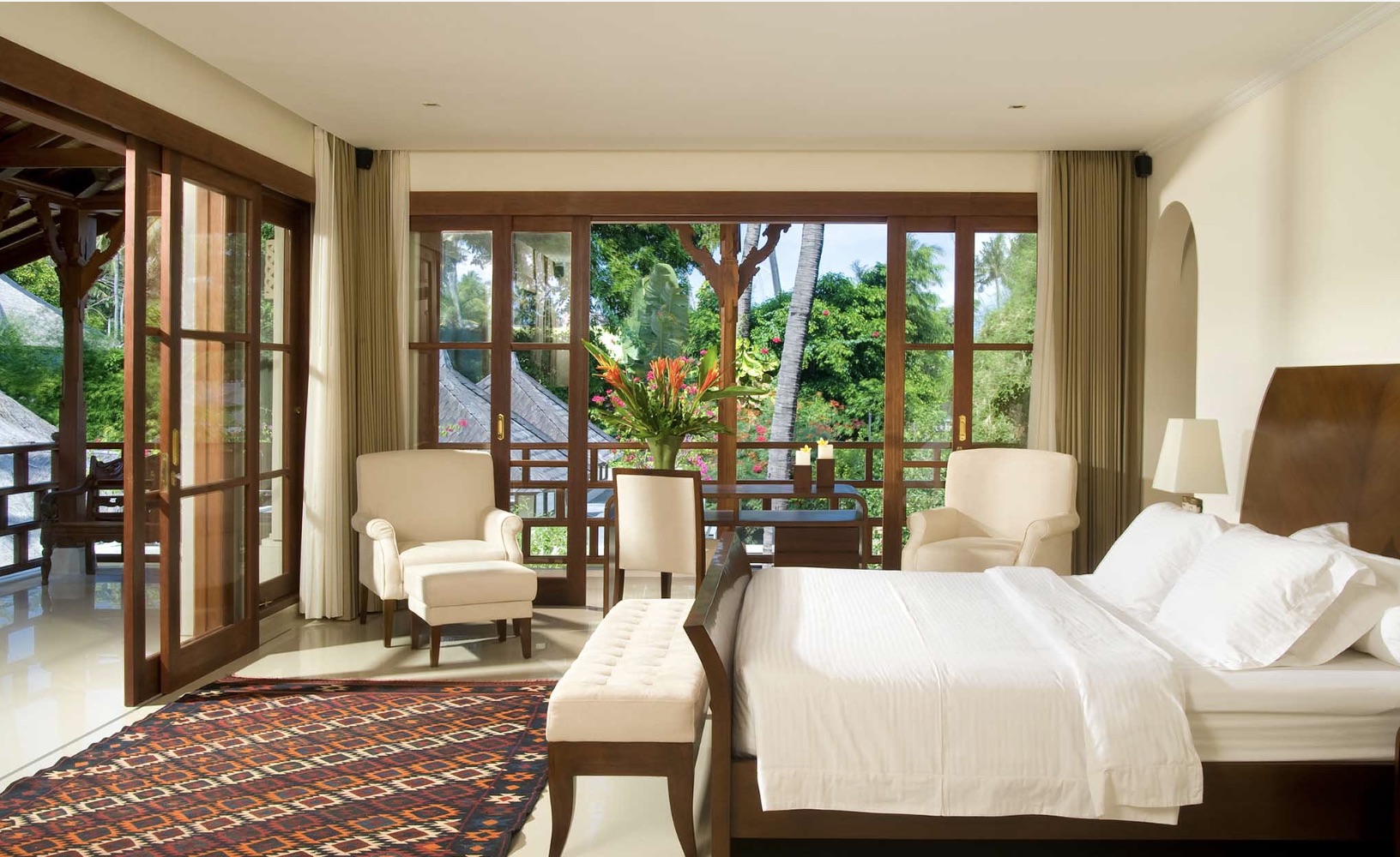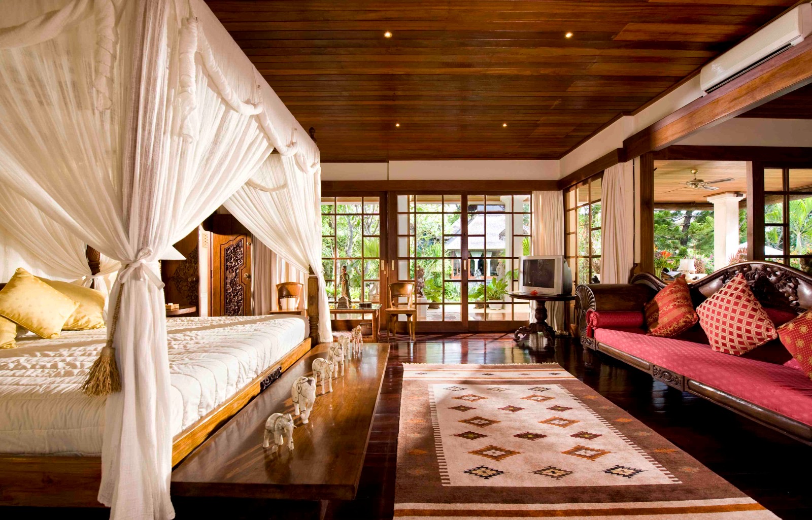 - Tempat tidur king, sofa daybed, ruang kerja, dan sistem suara surround.