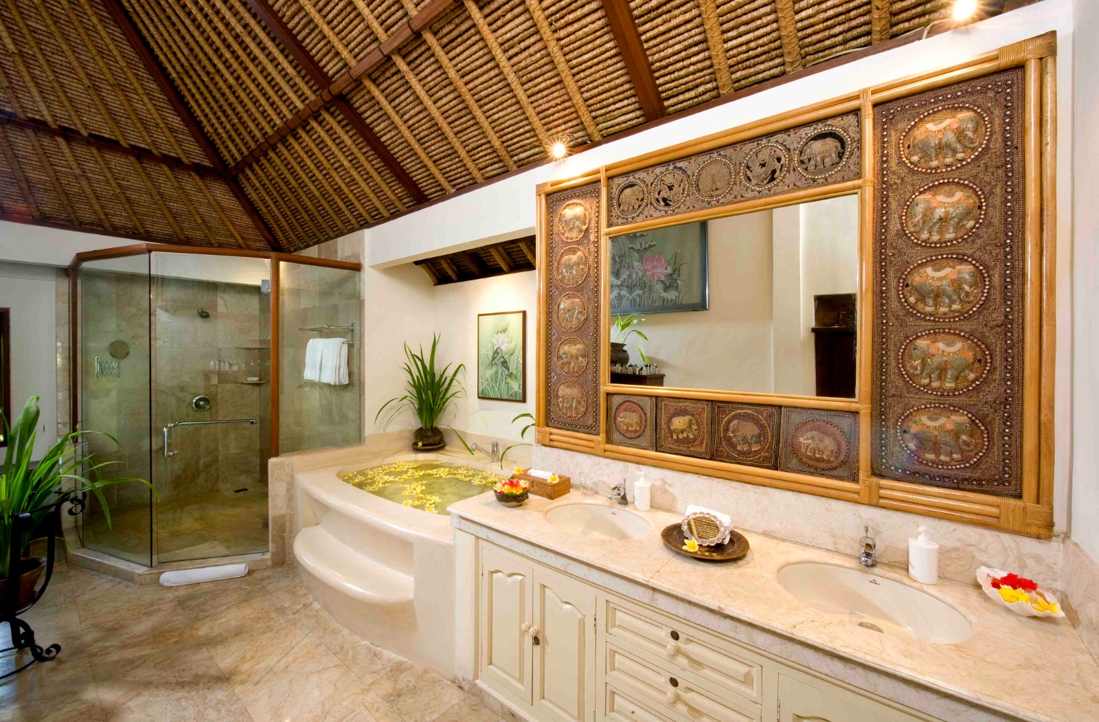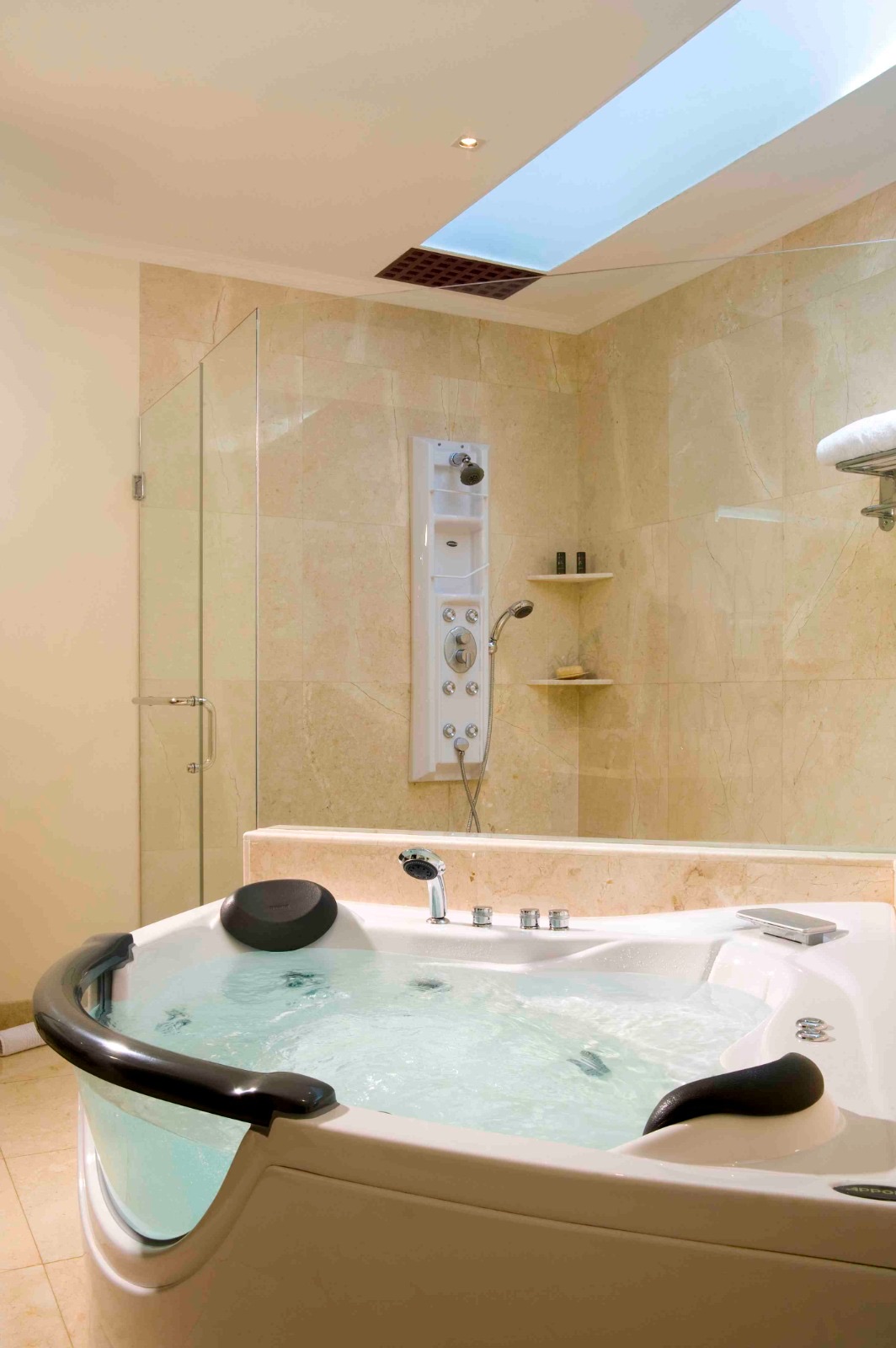 - Kamar mandi marmer krem mewah dengan bak jacuzzi, meja rias kembar, bidet, toilet, dan pancuran pijat Apollo dengan beberapa jet tubuh pijat hidro.