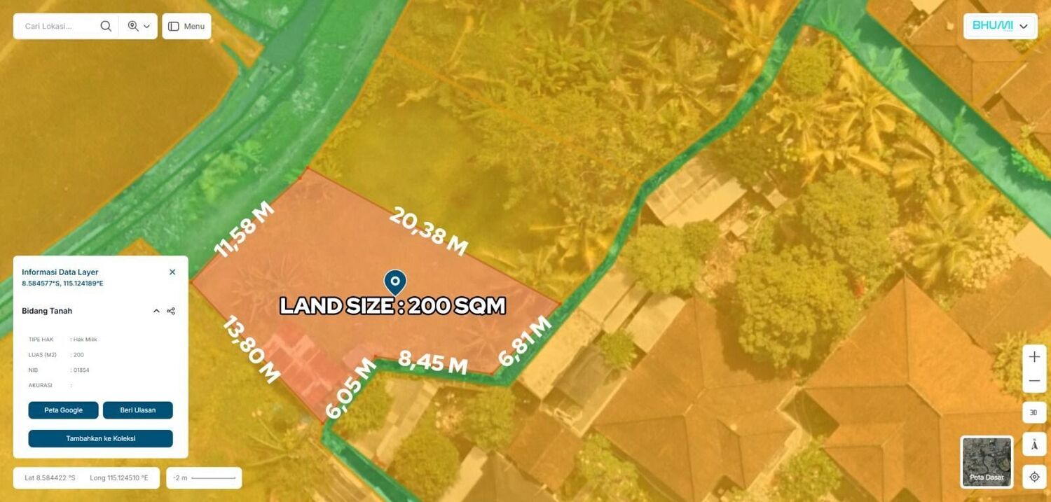 Dengan kepemilikan hak milik, zonasi di zona kuning, dan akses jalan termasuk, plot ini siap untuk dikembangkan. Daerah ini terkenal dengan keindahan alamnya, lingkungan yang tenang, dan kedekatan dengan destinasi gaya hidup yang paling diinginkan di Bali.