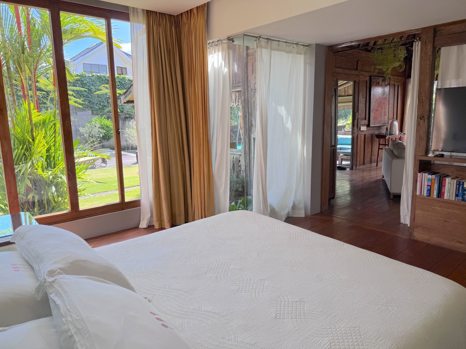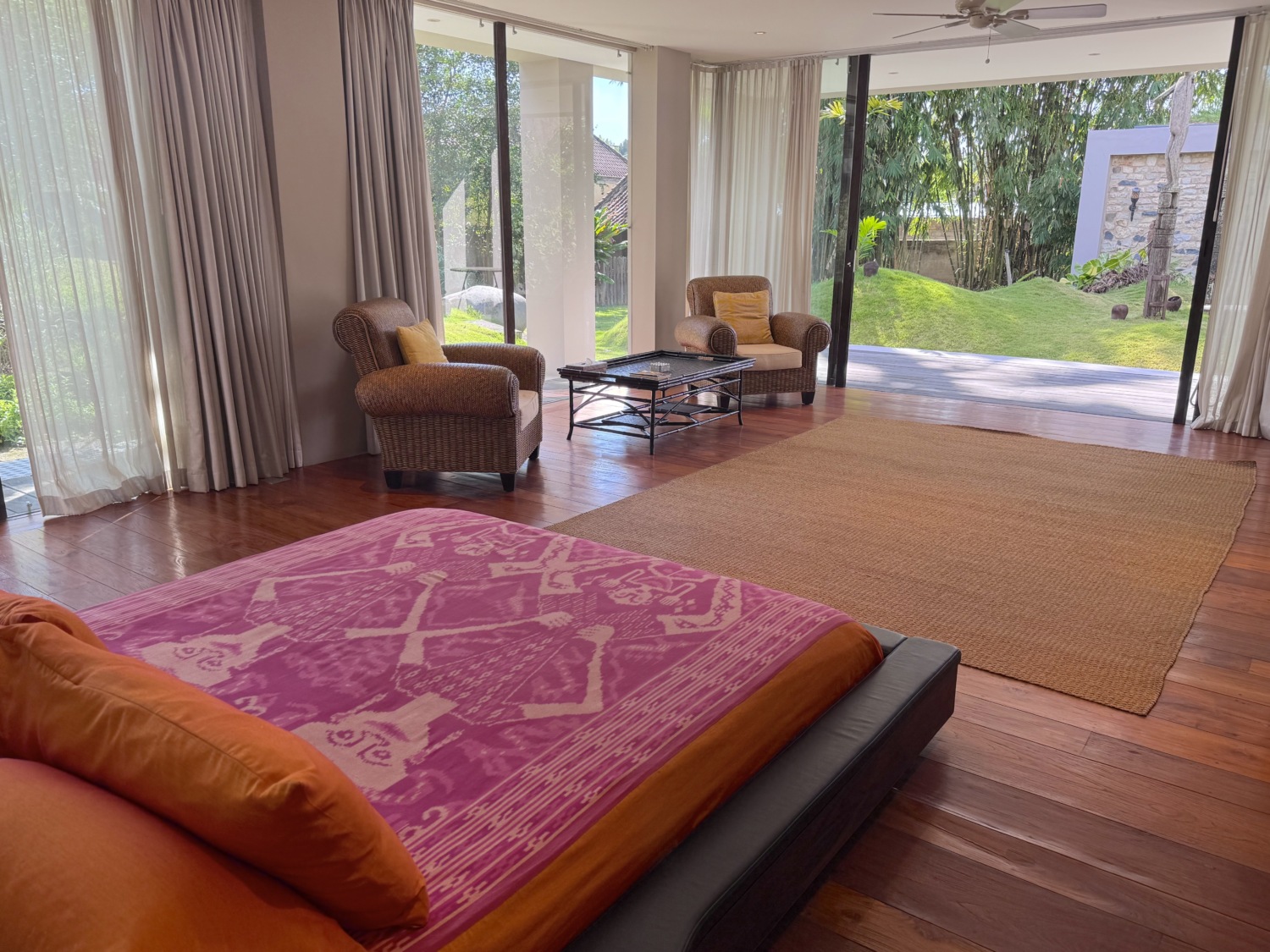 - Bangunan ketiga menggabungkan ruang tamu Joglo lainnya dengan juga dua kamar tidur: di lantai atas adalah suite utama dengan kamar mandi dalam-luar ruangan yang menakjubkan, walk-in closet, dan balkon pribadi yang menghadap ke taman. Di lantai bawah, kamar tidur ketiga berbagi pemandangan tenang yang sama.