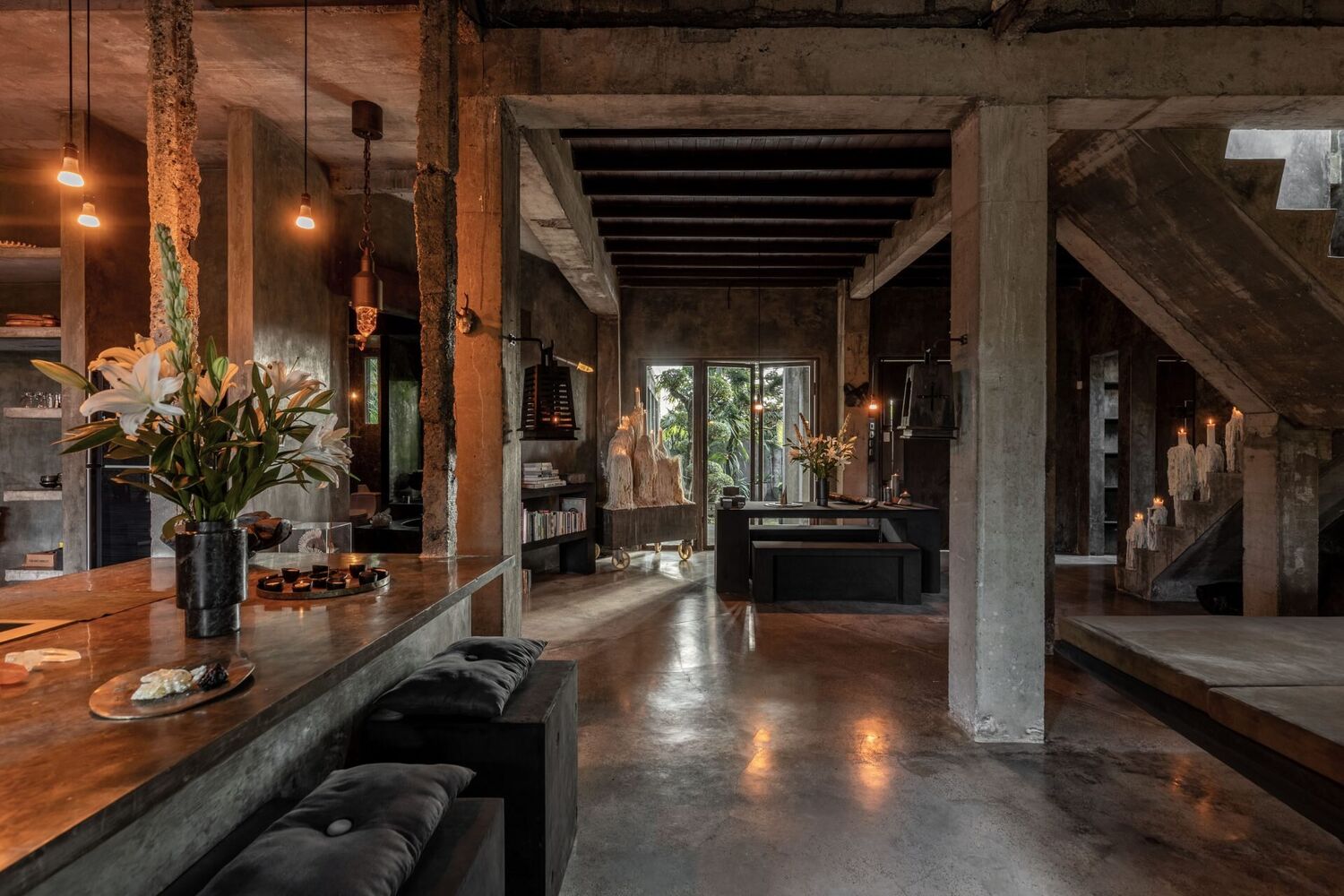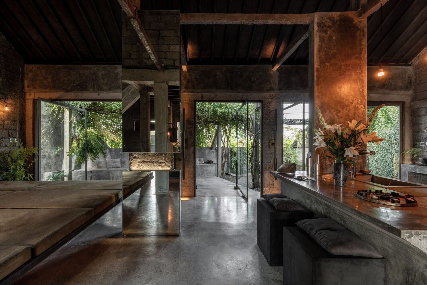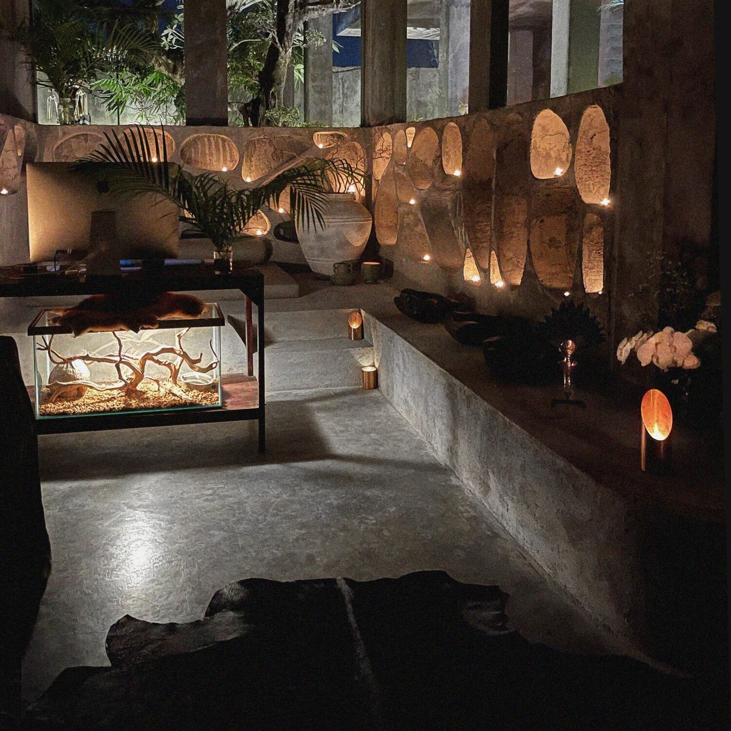 Beton bertemu kuningan, kayu keras tropis berpadu dengan kristal dari Brasil. Setiap elemen—furnitur, objek, pencahayaan—telah dirancang khusus. Tidak ada yang dibiarkan begitu saja. Suasana di siang hari adalah monastik dan membumi; Pada malam hari, cahaya lilin mengubah ruang menjadi sesuatu yang intim, hampir sakral.