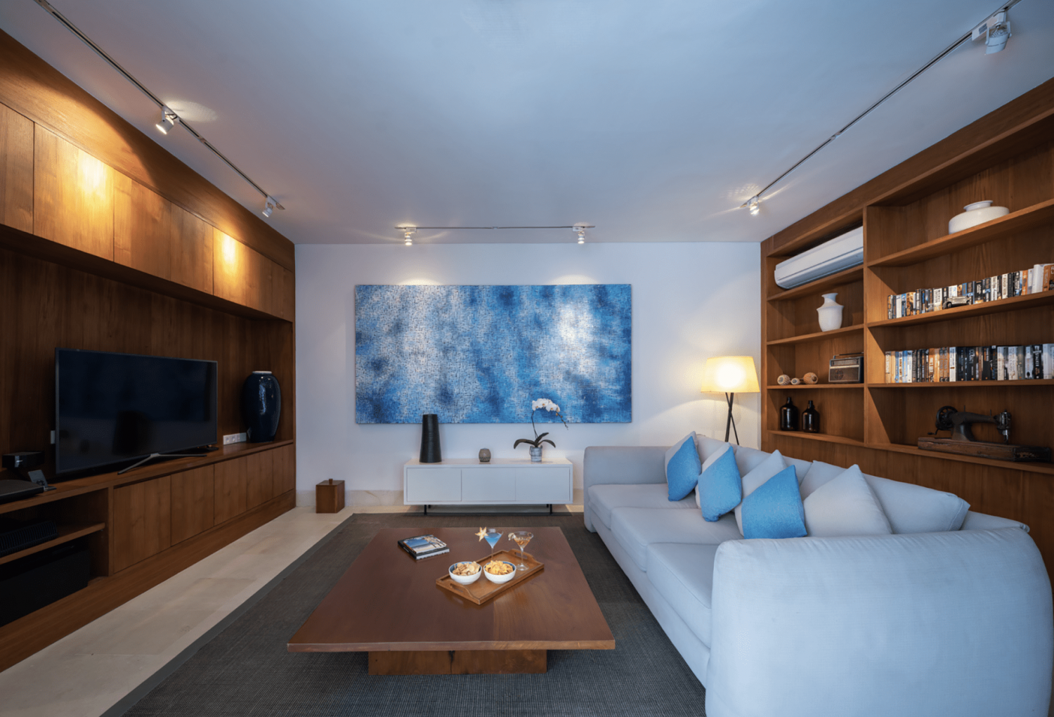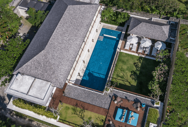 Desain berbentuk L vila membungkus kolam renang dan taman, menyatu mulus dengan alam bebas. Ruang tamu dan ruang makan, dilapisi dengan pintu kaca, terbuka ke kolam renang, menawarkan pengalaman hidup semi-outdoor.