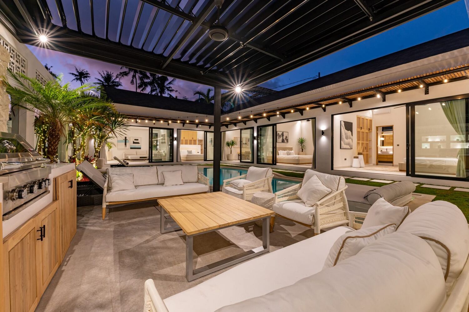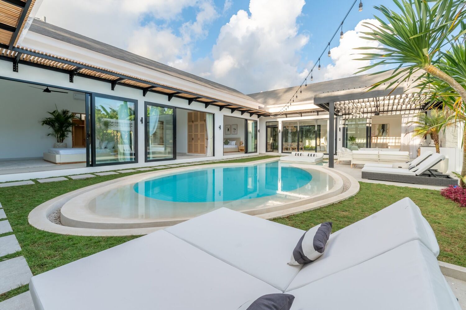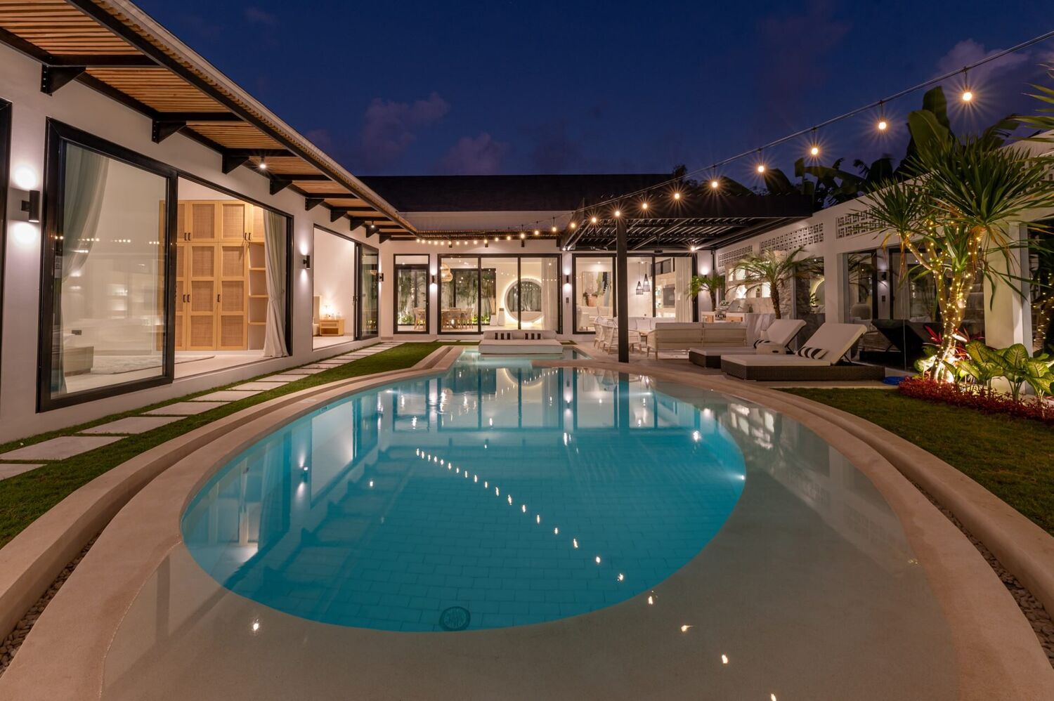 Kolam renang seluas 30 meter persegi berada di jantung ruang luar ruangan, dibingkai oleh pohon kelapa dan suasana yang tenang. Lengkap dengan carport pribadi, sistem penyaringan air penuh, dan internet serat optik berkabel, rumah ini merupakan tempat perlindungan dan investasi gaya hidup cerdas.
