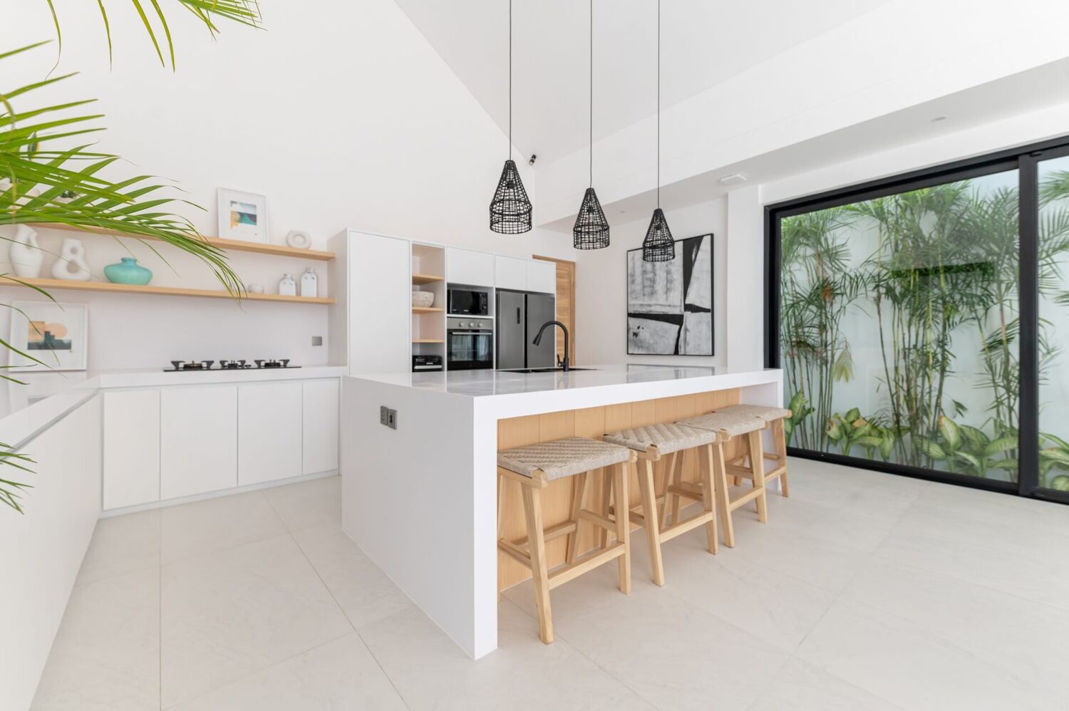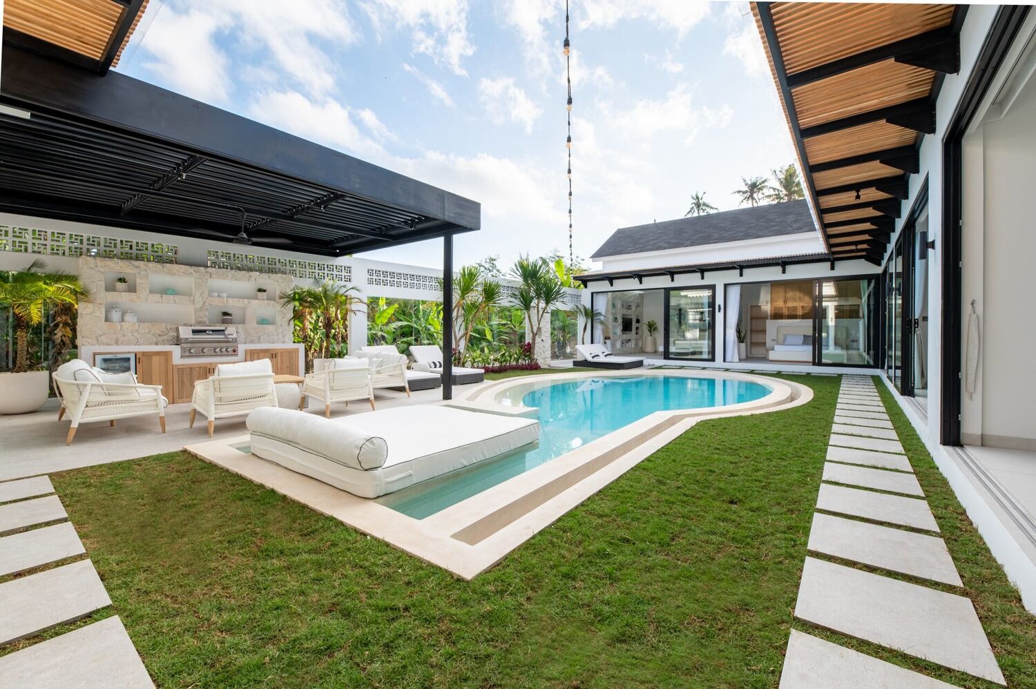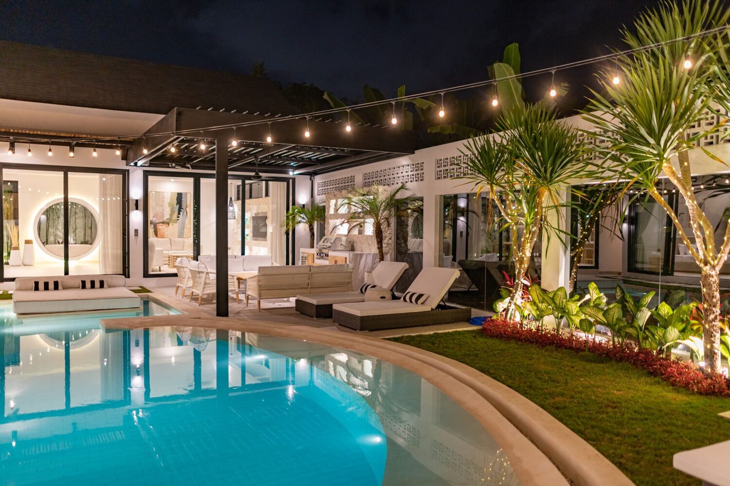 Kolam renang seluas 30 meter persegi berada di jantung ruang luar ruangan, dibingkai oleh pohon kelapa dan suasana yang tenang. Lengkap dengan carport pribadi, sistem penyaringan air penuh, dan internet serat optik berkabel, rumah ini merupakan tempat perlindungan dan investasi gaya hidup cerdas.