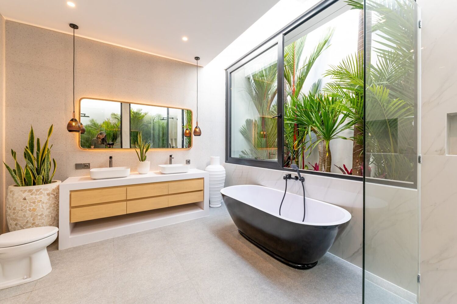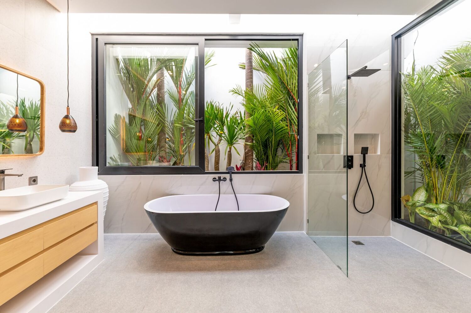 Kamar mandi marmer dengan pemandangan taman dan keran hitam