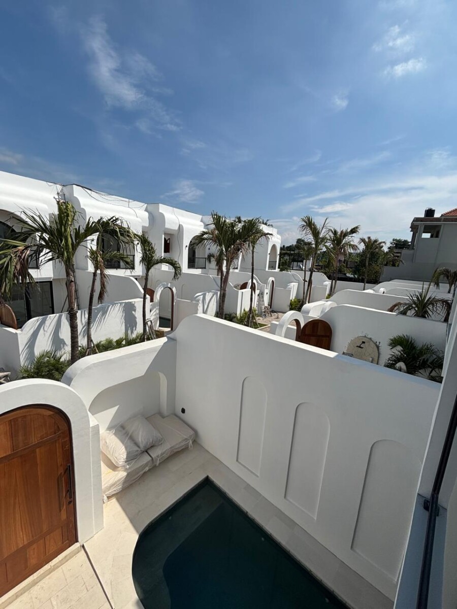 Di lantai atas, kedua kamar tidur cerah dan berangin dengan kamar mandi dalam, dan suite utama terbuka ke balkon pribadi yang menghadap ke halaman lanskap. Area atap sangat ideal untuk menghibur atau bersantai di bawah bintang-bintang. Di luar, kolam renang dan area lounge terletak di halaman pribadi, dibingkai oleh dinding putih melengkung dan tanaman hijau tropis—menciptakan tempat perlindungan yang sempurna.