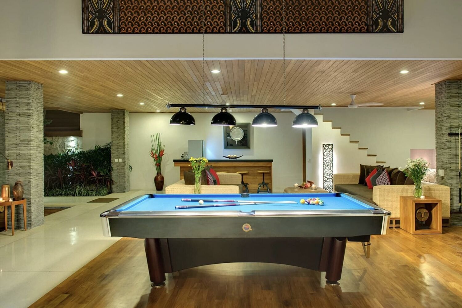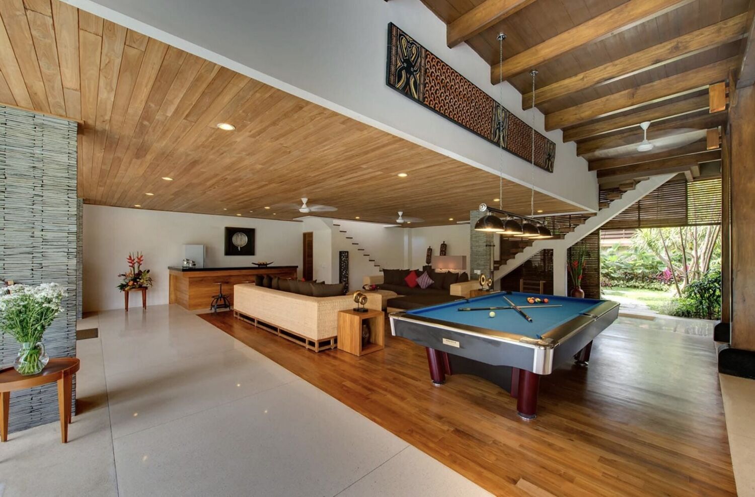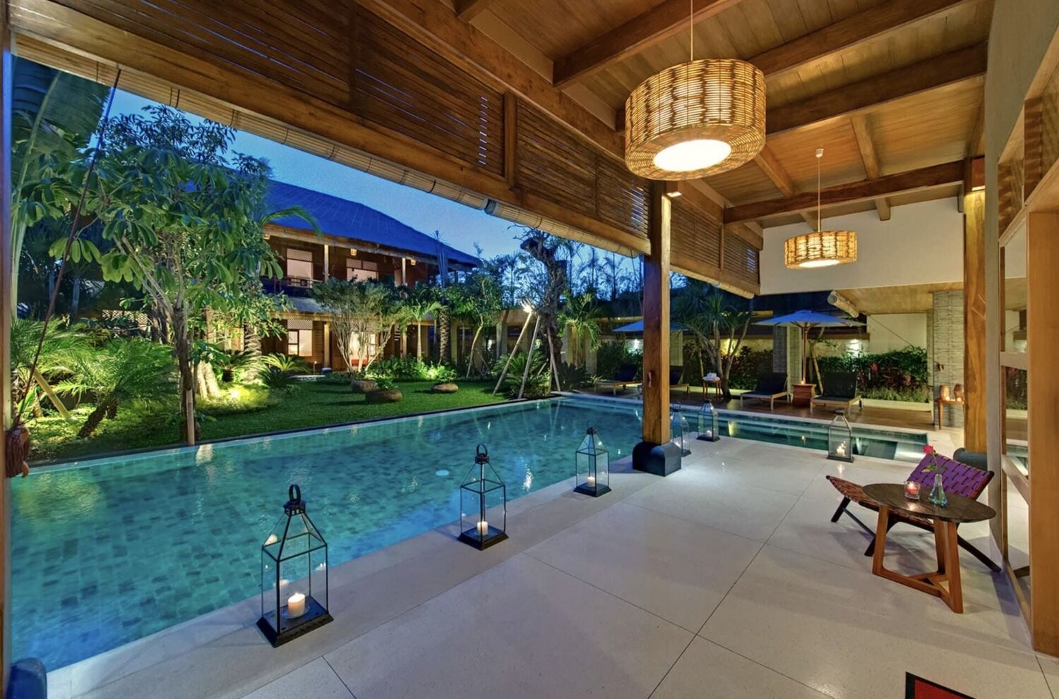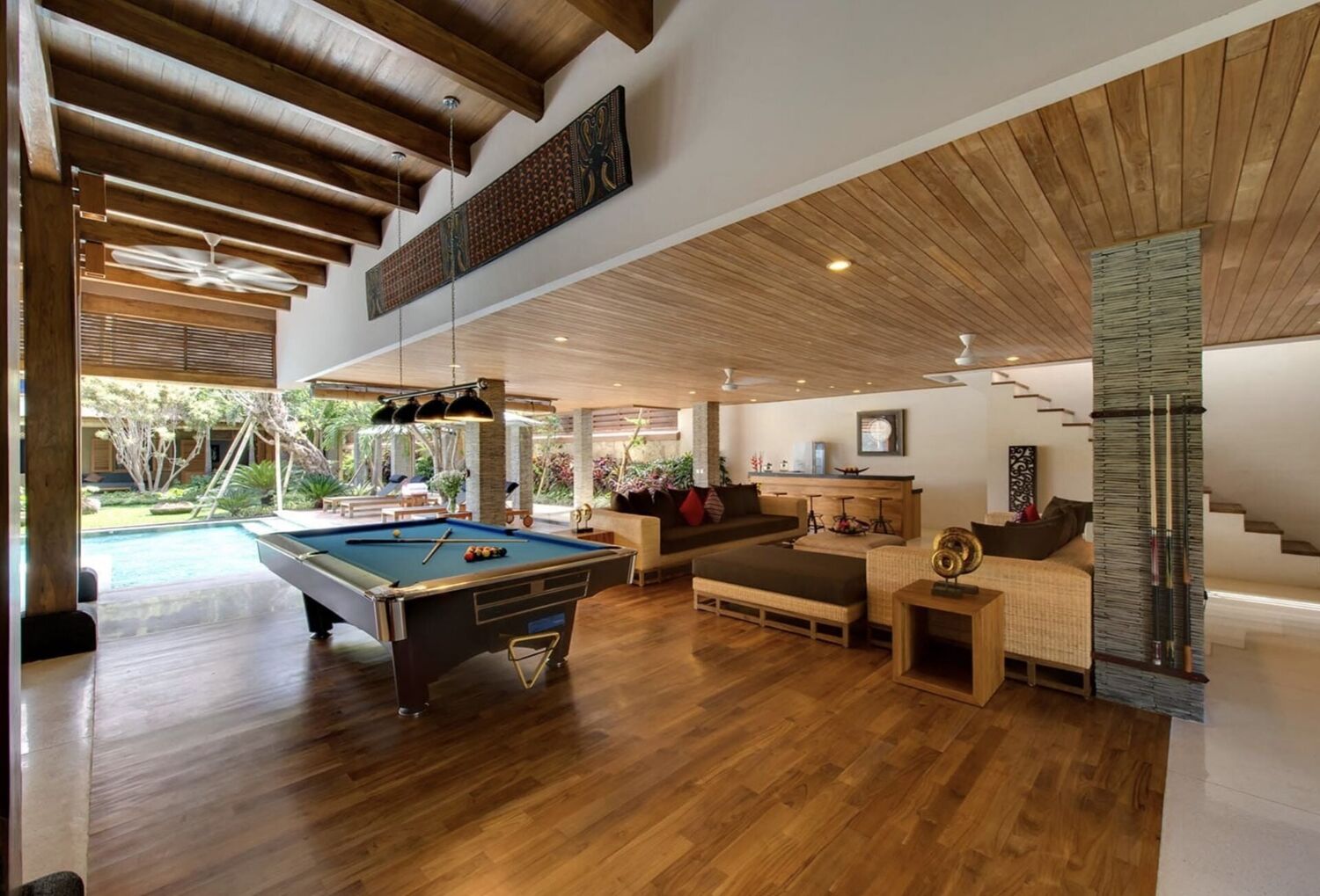 Kolam renang pribadi berbentuk L yang menakjubkan dibingkai oleh tempat berjemur besar dan oasis taman tropis, sementara ruang tamu dalam dan luar ruangan yang luas dirancang untuk rekreasi yang canggih. Kolom kayu jati yang tinggi, arsitektur terbuka, dan perabotan Bali yang dipilih dengan cermat menghadirkan rasa kemegahan dan ketenangan di seluruh rumah. Fitur-fiturnya termasuk sofa besar, ruang makan 12 tempat duduk, meja biliar, dan pengaturan bar lengkap — semuanya berperabotan lengkap dan siap pindah.