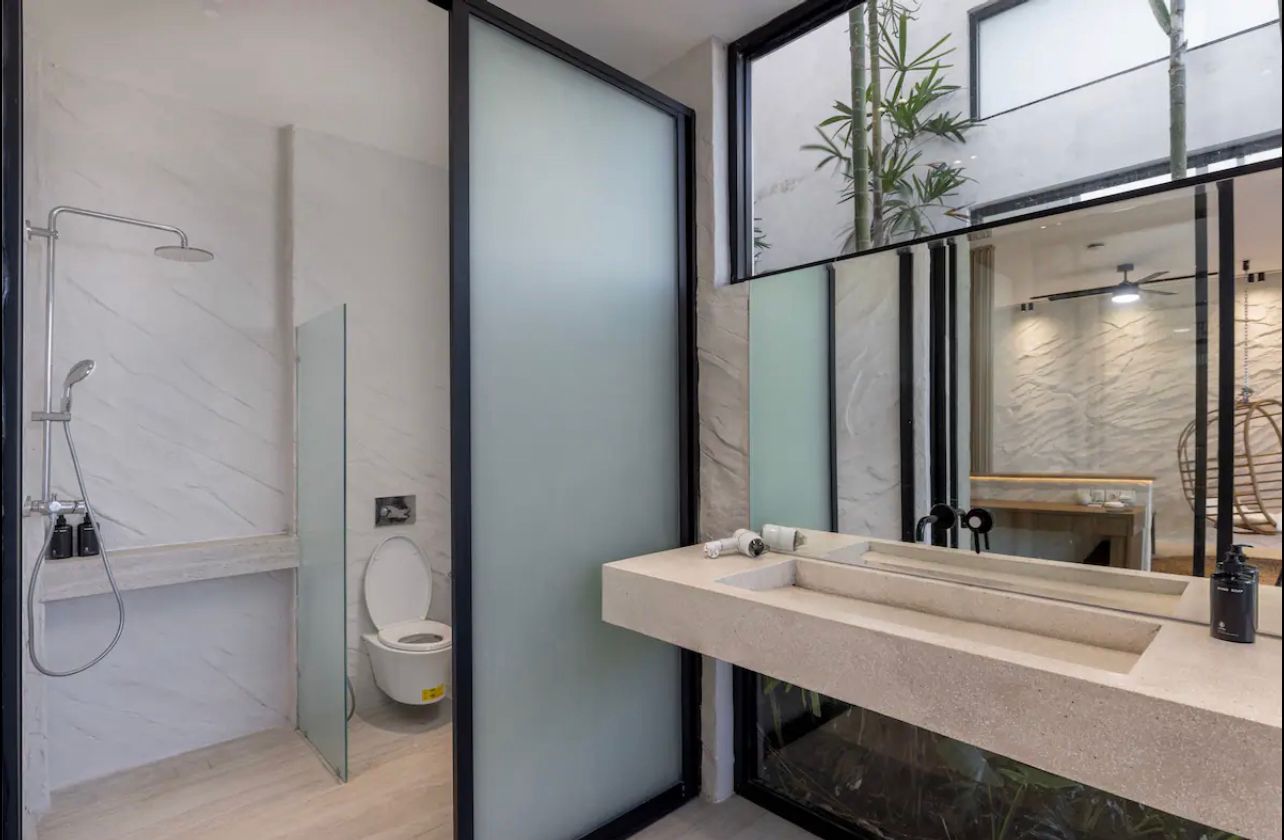 Setiap kamar tidur adalah surga relaksasi, dilengkapi dengan kamar mandi dalam yang dilengkapi dengan bak mandi dan pancuran. Ruang tamu yang luas menawarkan suasana yang mengundang untuk berkumpul, menghadap ke taman lanskap yang indah dan kolam renang pribadi — tempat peristirahatan yang sempurna untuk bersantai atau menghibur.