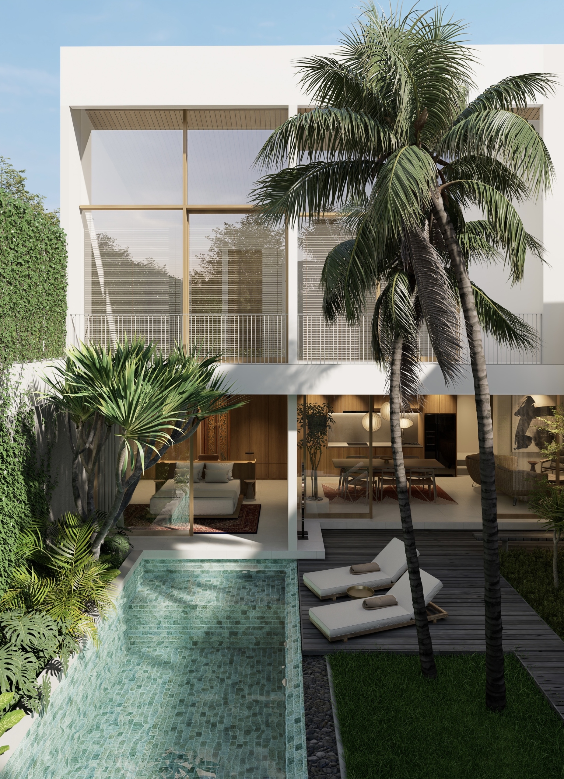 Vila ini mencakup ruang tamu dan ruang makan utama yang tertutup sepenuhnya, area tempat duduk lantai dua yang terbuka, dan kamar pelayan dengan kamar mandi sendiri, memastikan kenyamanan dan privasi. Setiap kamar tidur dipasangkan dengan kamar mandi dalam, dilengkapi dengan kamar mandi dan pancuran kolam renang. Di luar, kolam renang pribadi berukuran 2.725 x 8 meter menunggu, dikelilingi oleh lansekap rimbun dan parkir bersama hingga dua mobil.