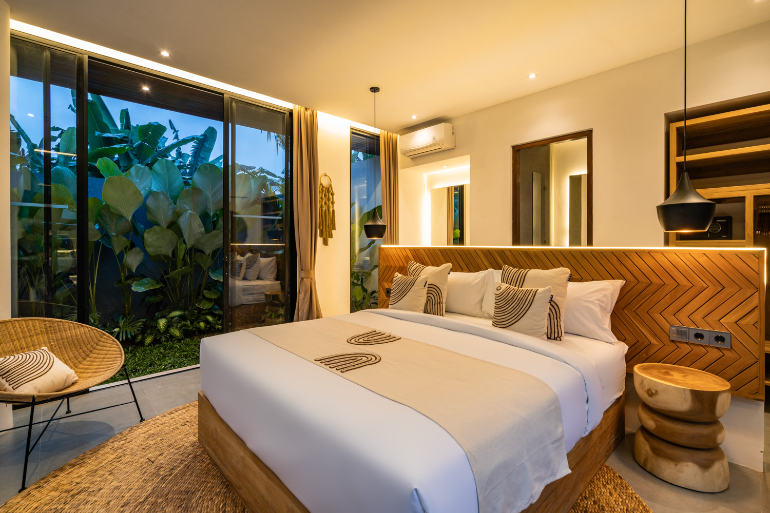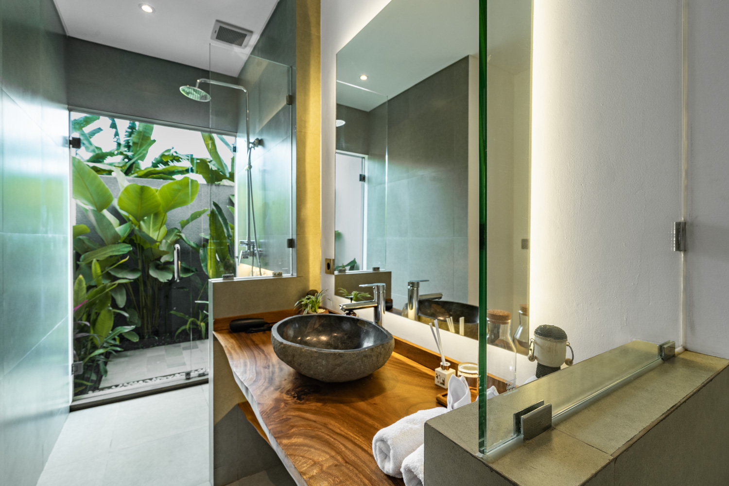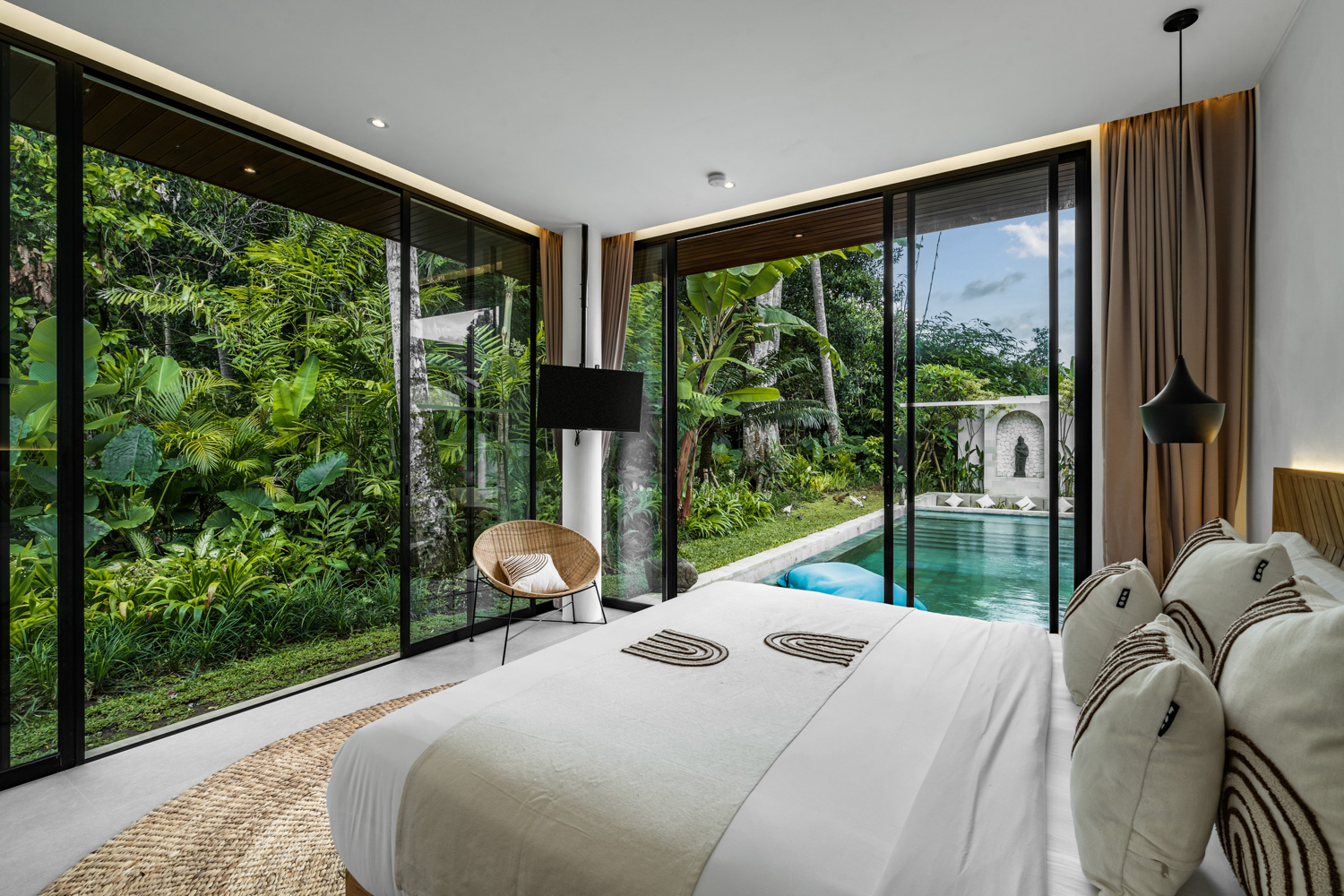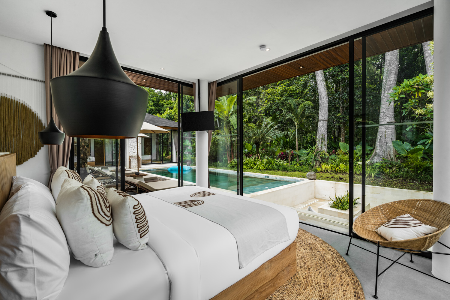 Tata letak vila diatur dengan cermat untuk privasi dan koneksi. Kamar tidur utama memiliki dinding kaca dari lantai ke langit-langit, membanjiri ruang dengan cahaya alami dan menawarkan pemandangan langsung ke taman. Pancuran luar ruangan menambahkan sentuhan tropis, memungkinkan Anda terhubung dengan alam dengan nyaman.