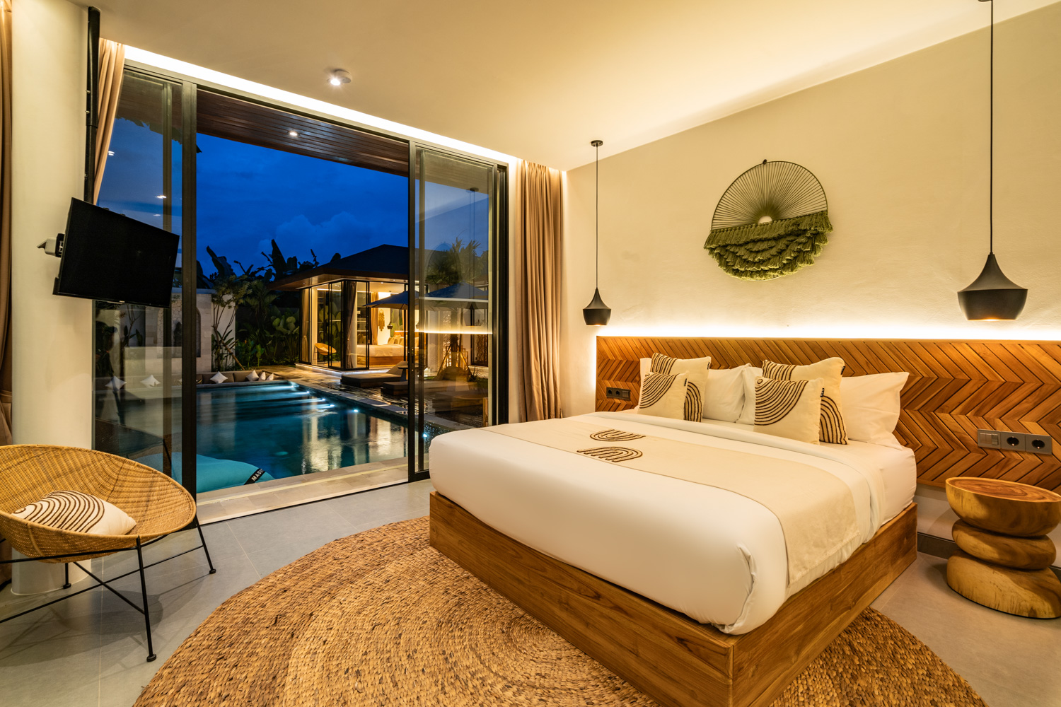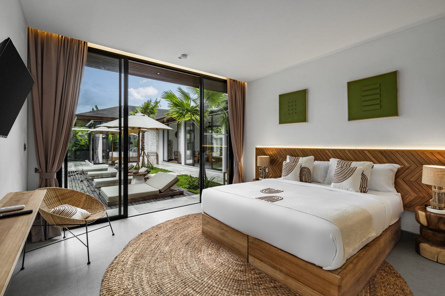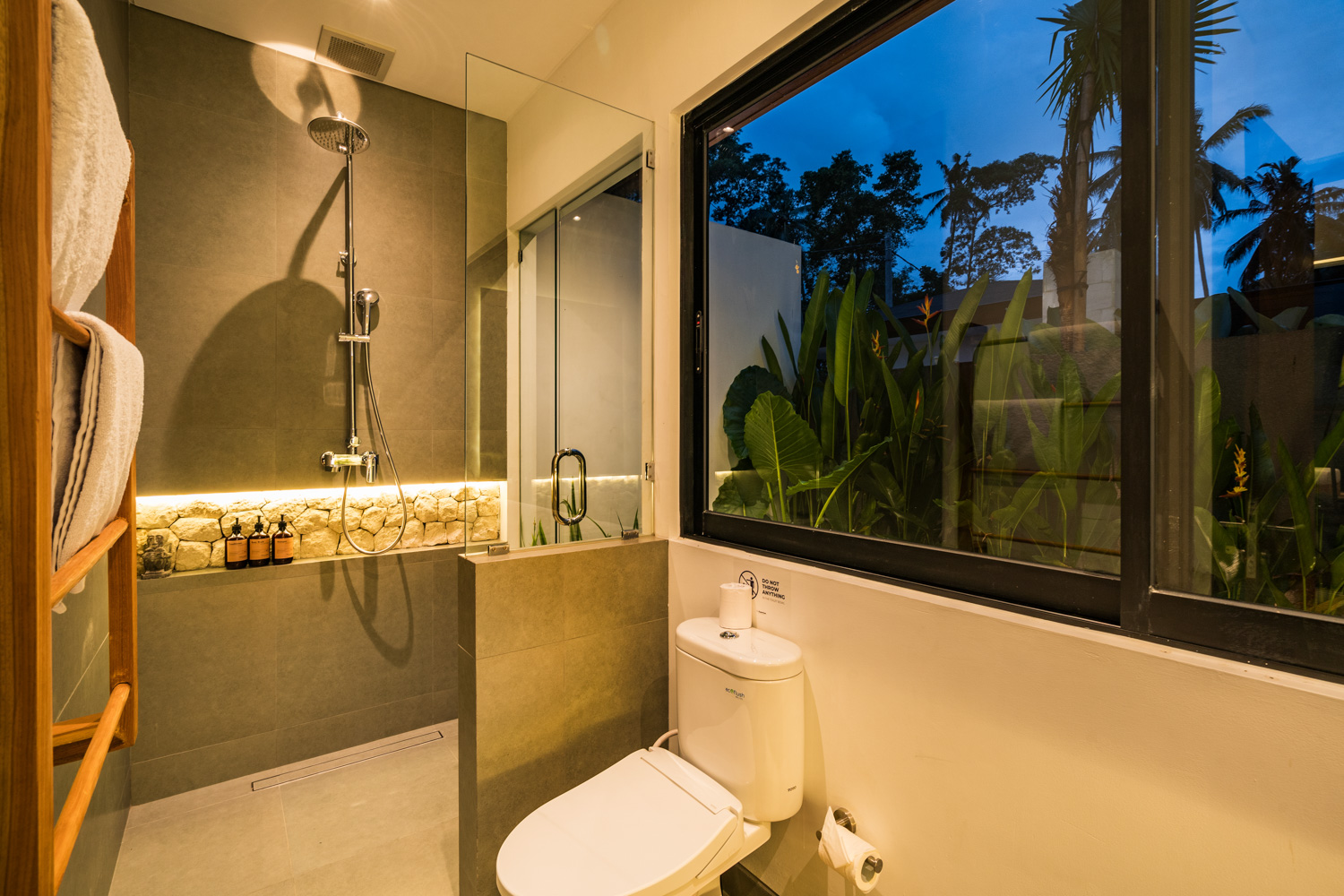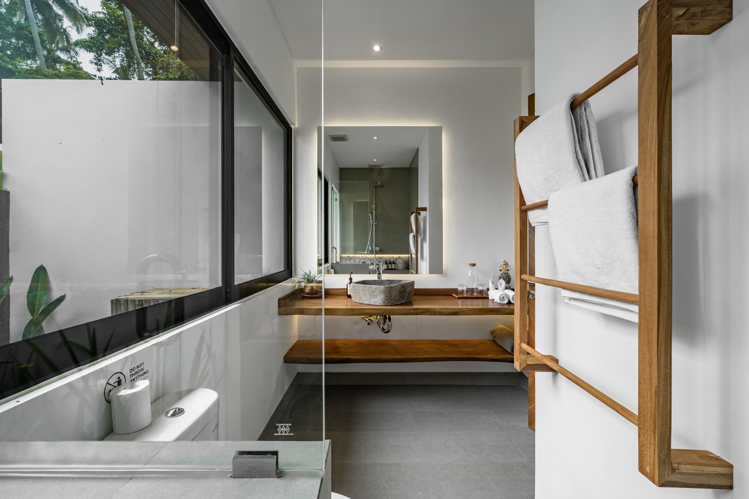 Tata letak vila diatur dengan cermat untuk privasi dan koneksi. Kamar tidur utama memiliki dinding kaca dari lantai ke langit-langit, membanjiri ruang dengan cahaya alami dan menawarkan pemandangan langsung ke taman. Pancuran luar ruangan menambahkan sentuhan tropis, memungkinkan Anda terhubung dengan alam dengan nyaman.