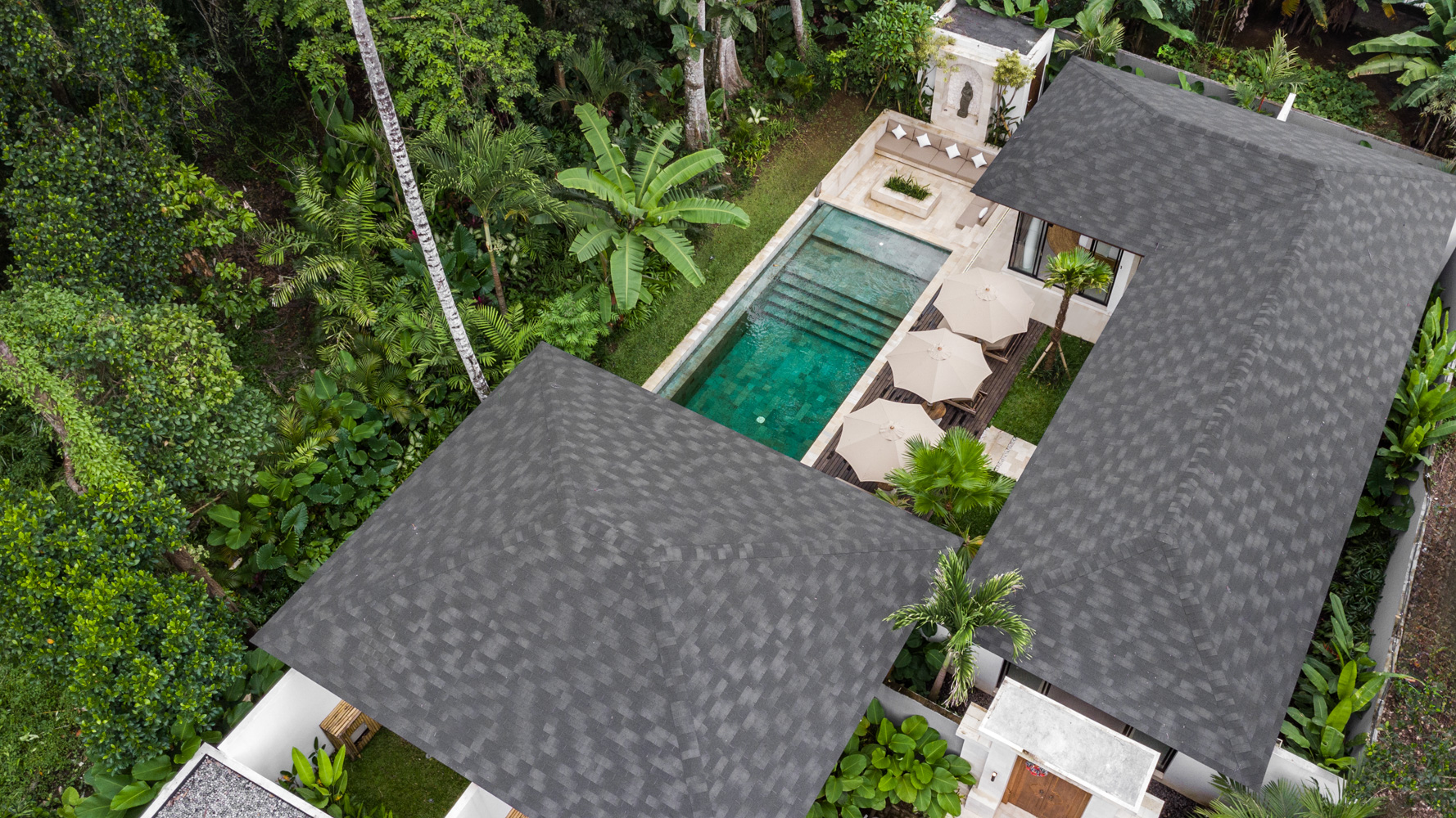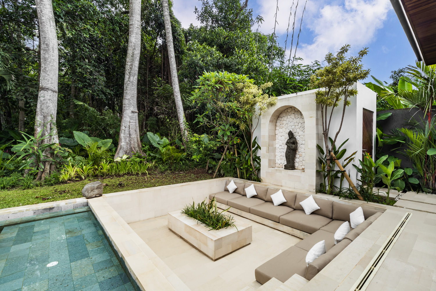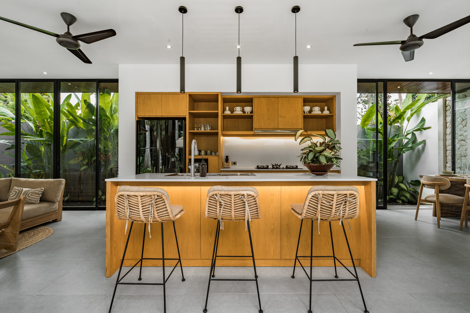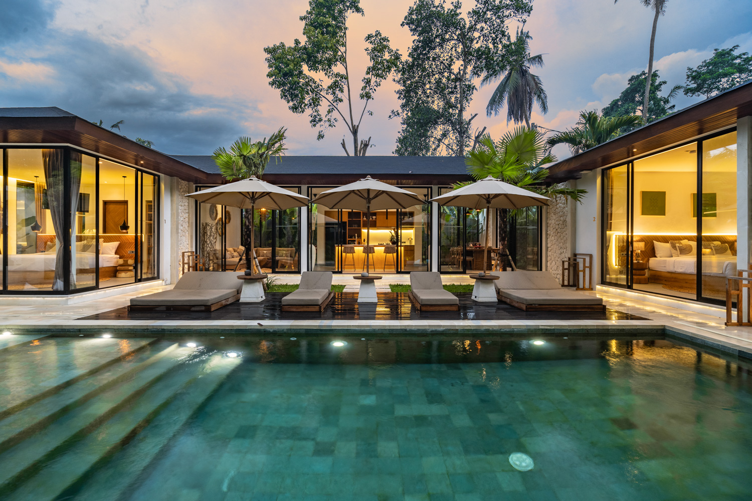 Tata letak vila diatur dengan cermat untuk privasi dan koneksi. Kamar tidur utama memiliki dinding kaca dari lantai ke langit-langit, membanjiri ruang dengan cahaya alami dan menawarkan pemandangan langsung ke taman. Pancuran luar ruangan menambahkan sentuhan tropis, memungkinkan Anda terhubung dengan alam dengan nyaman.