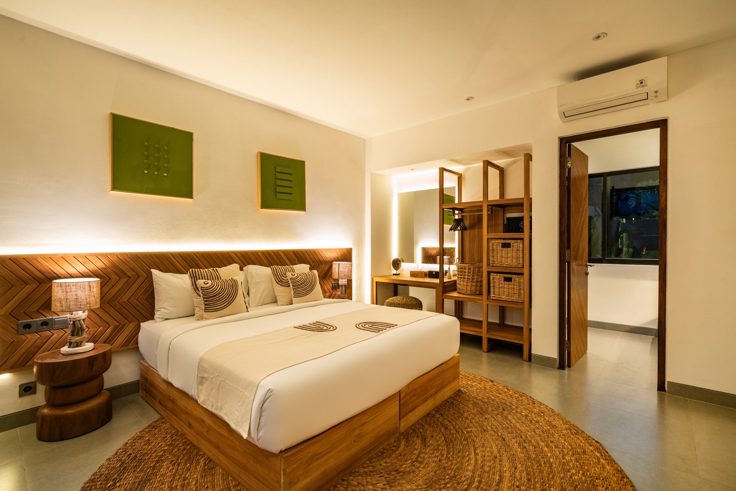 Di sisi berlawanan vila, dua kamar tidur tambahan menyediakan akomodasi yang nyaman—satu dengan tempat tidur twin, ideal untuk anak-anak atau tamu, dan yang lainnya dengan tempat tidur queen yang menghadap ke kolam renang dan taman. Semua kamar tidur dilengkapi dengan Smart TV, AC, dan kamar mandi en-suite untuk kenyamanan maksimal.