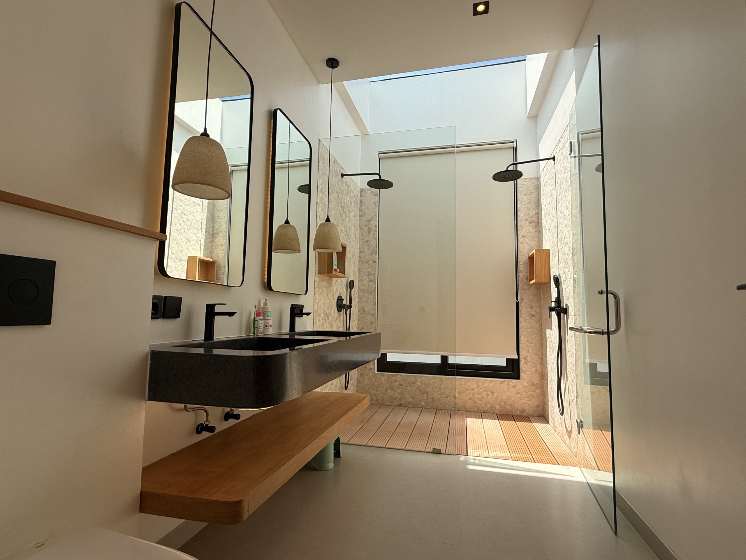 Fitur yang menonjol dari rumah ini adalah dua kolam renang pribadi dan area pancuran luar ruangan terintegrasi indah yang dikelilingi oleh taman rimbun — ideal untuk bersantai atau menghibur.