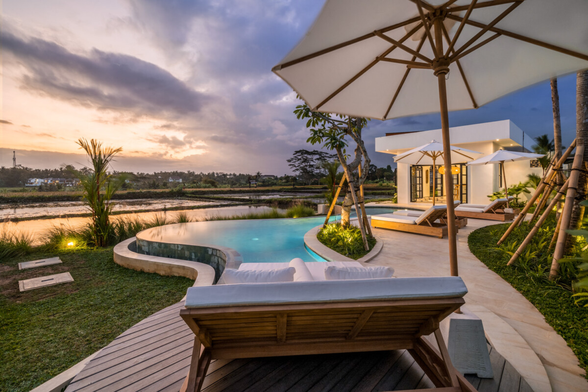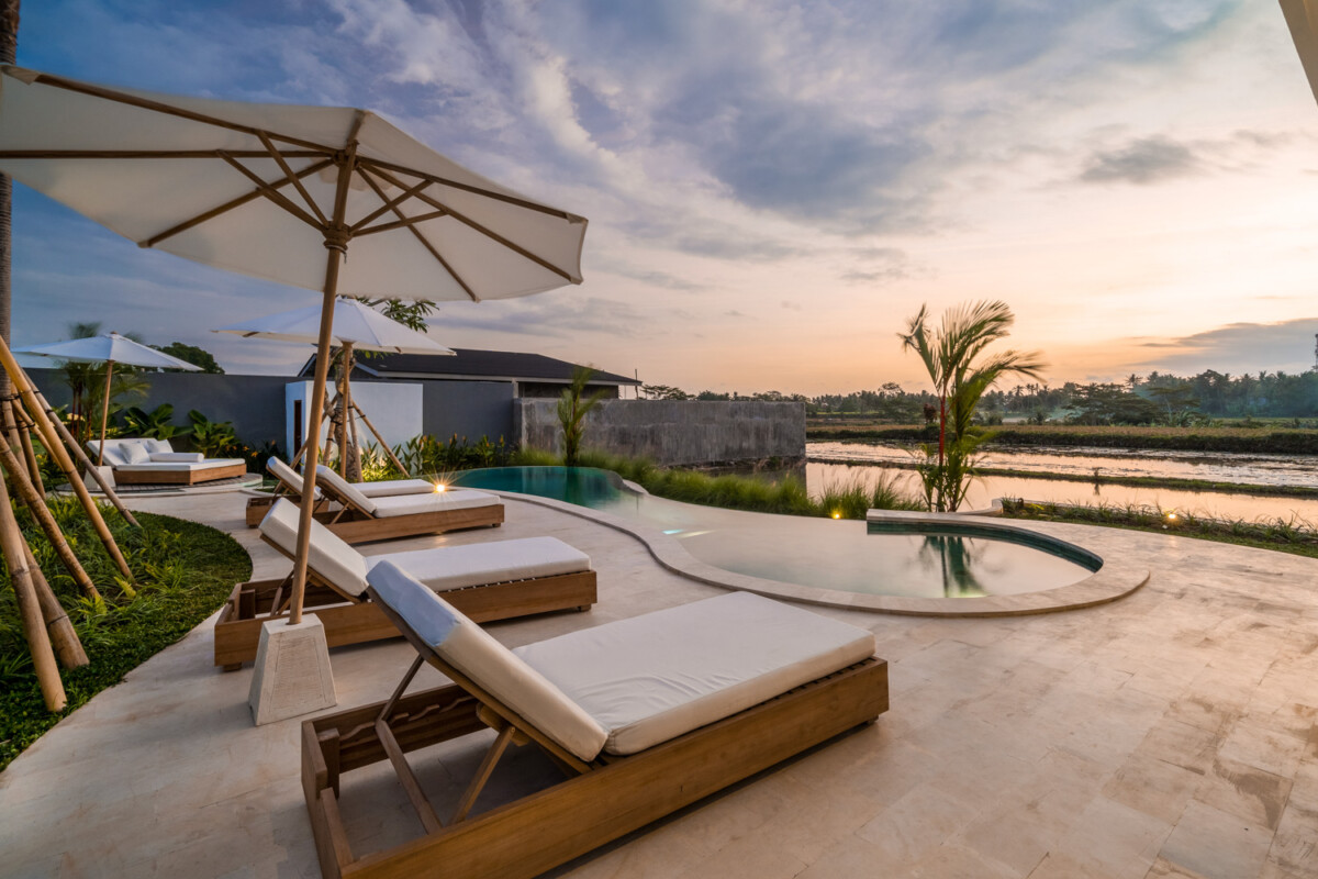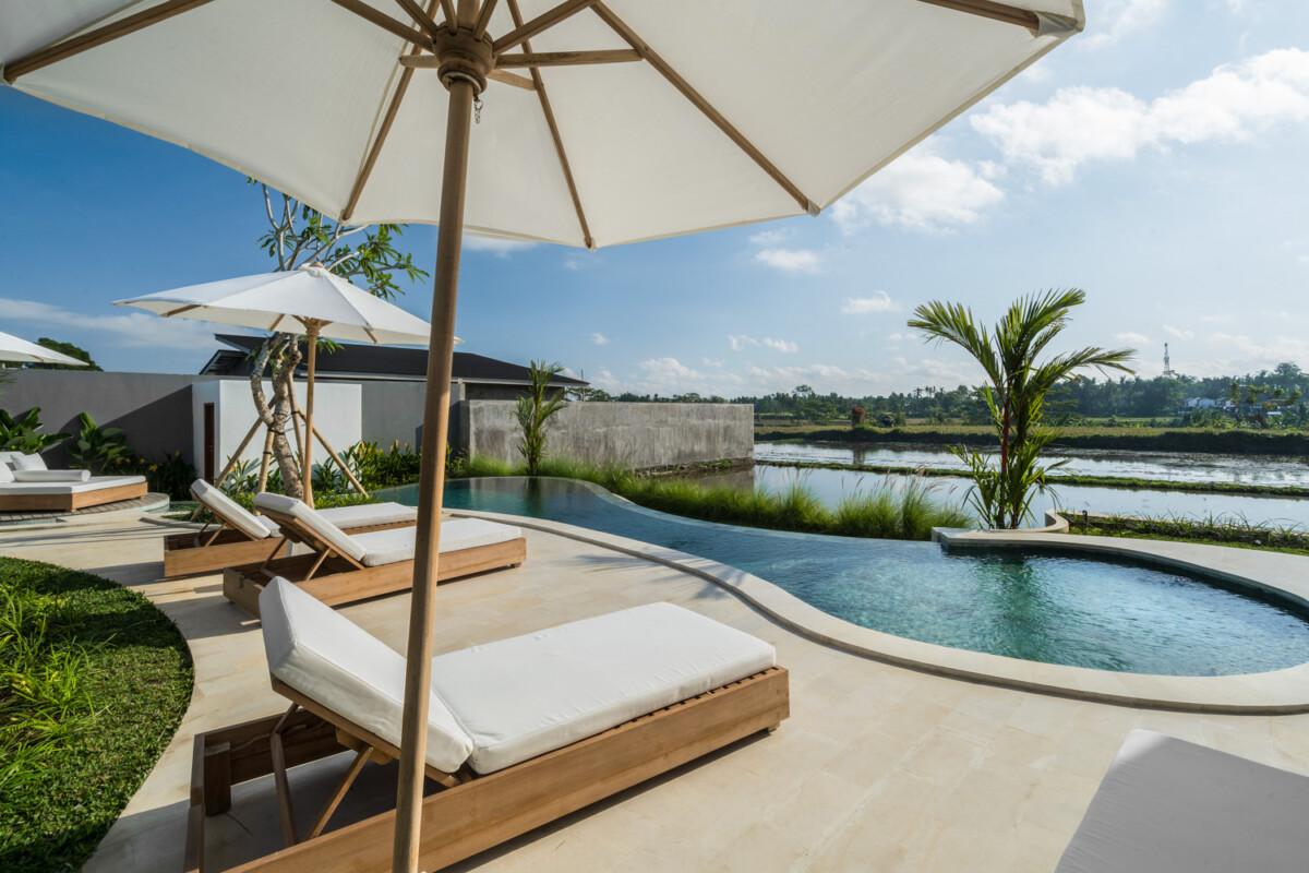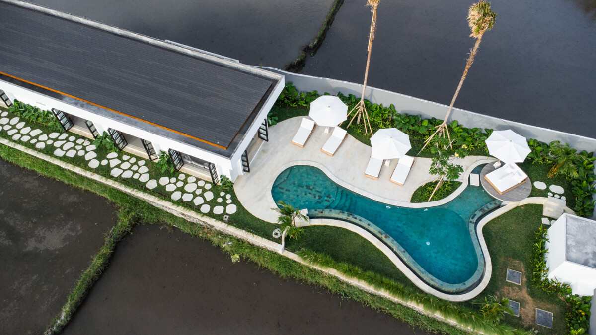 Kolam renang: Kolam berbentuk bulat dengan pemandangan sawah