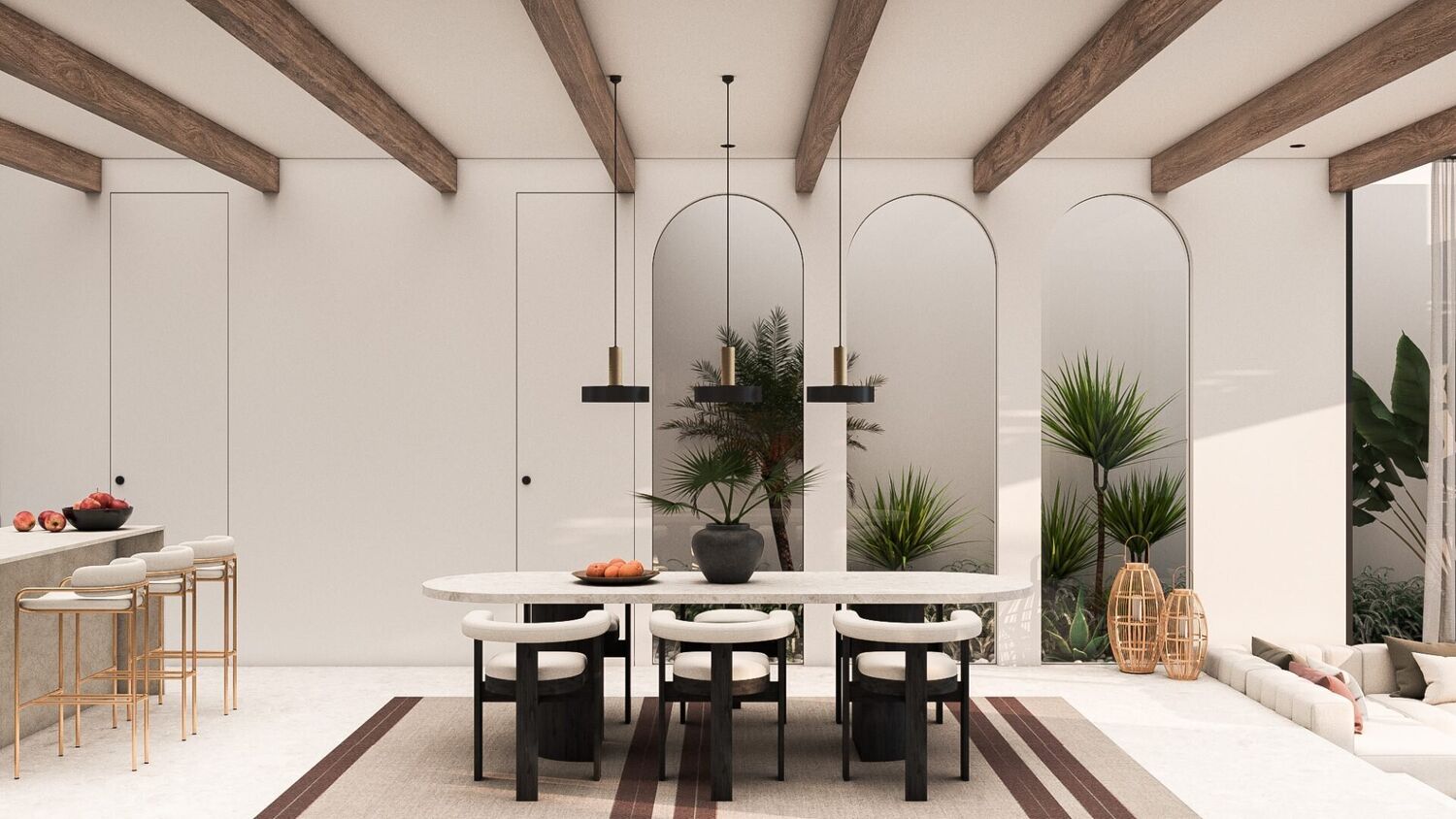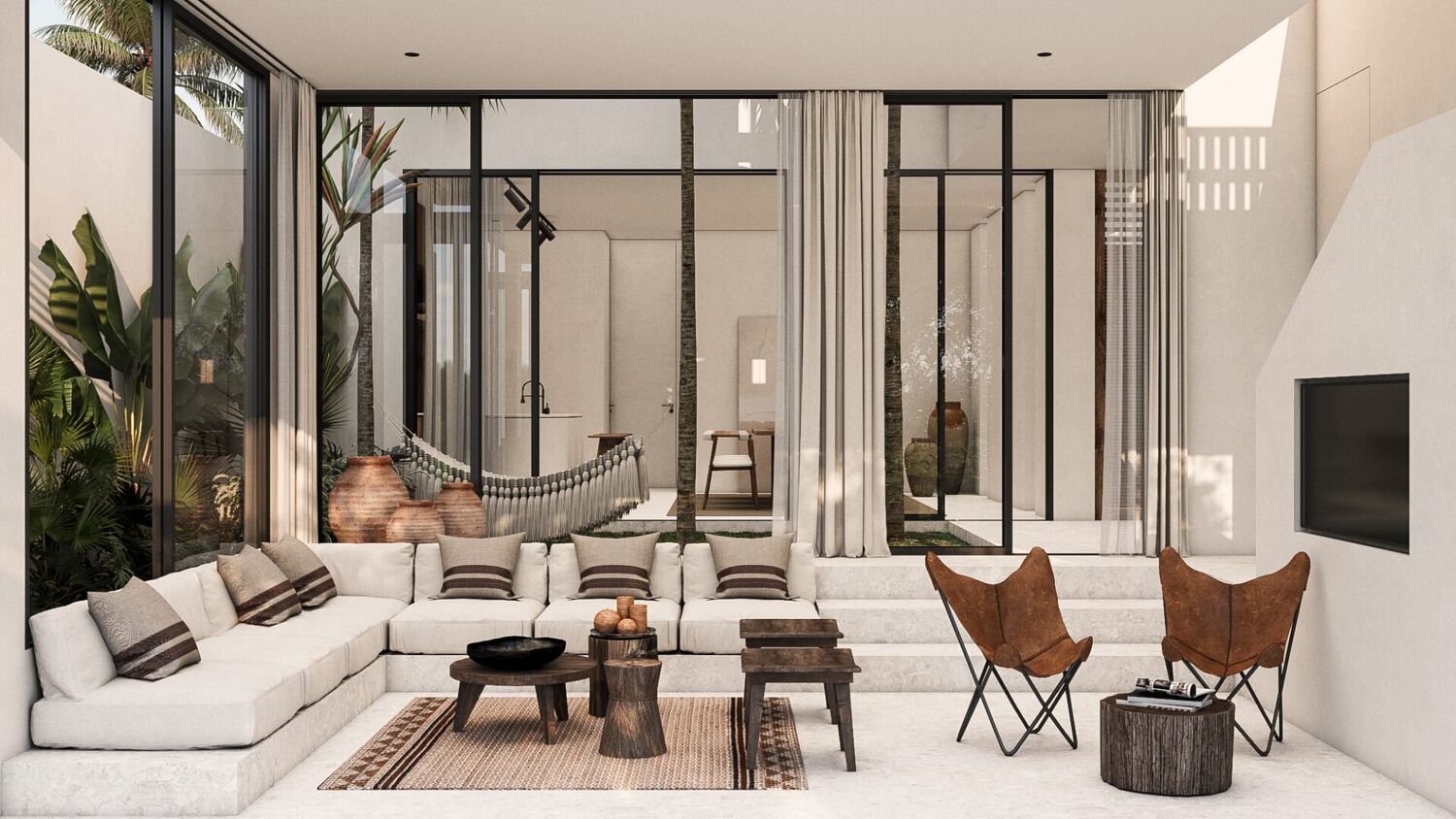 - Desain Mediterania kontemporer dengan ruang tamu tertutup