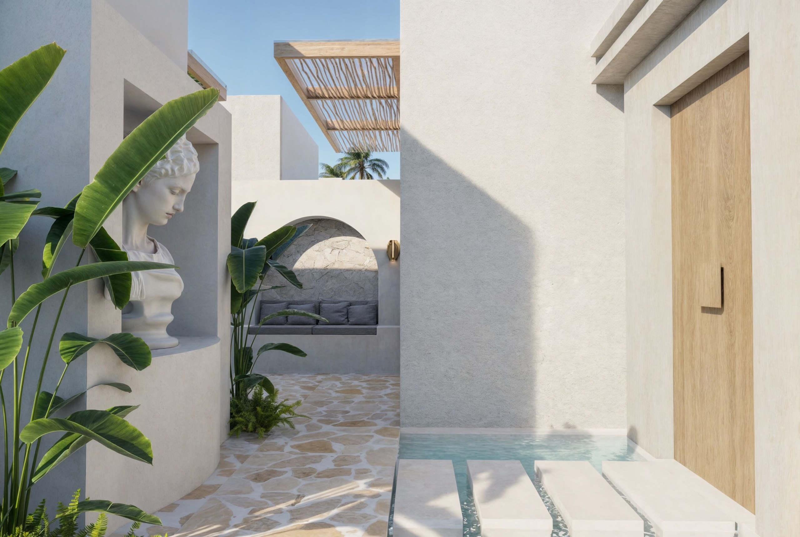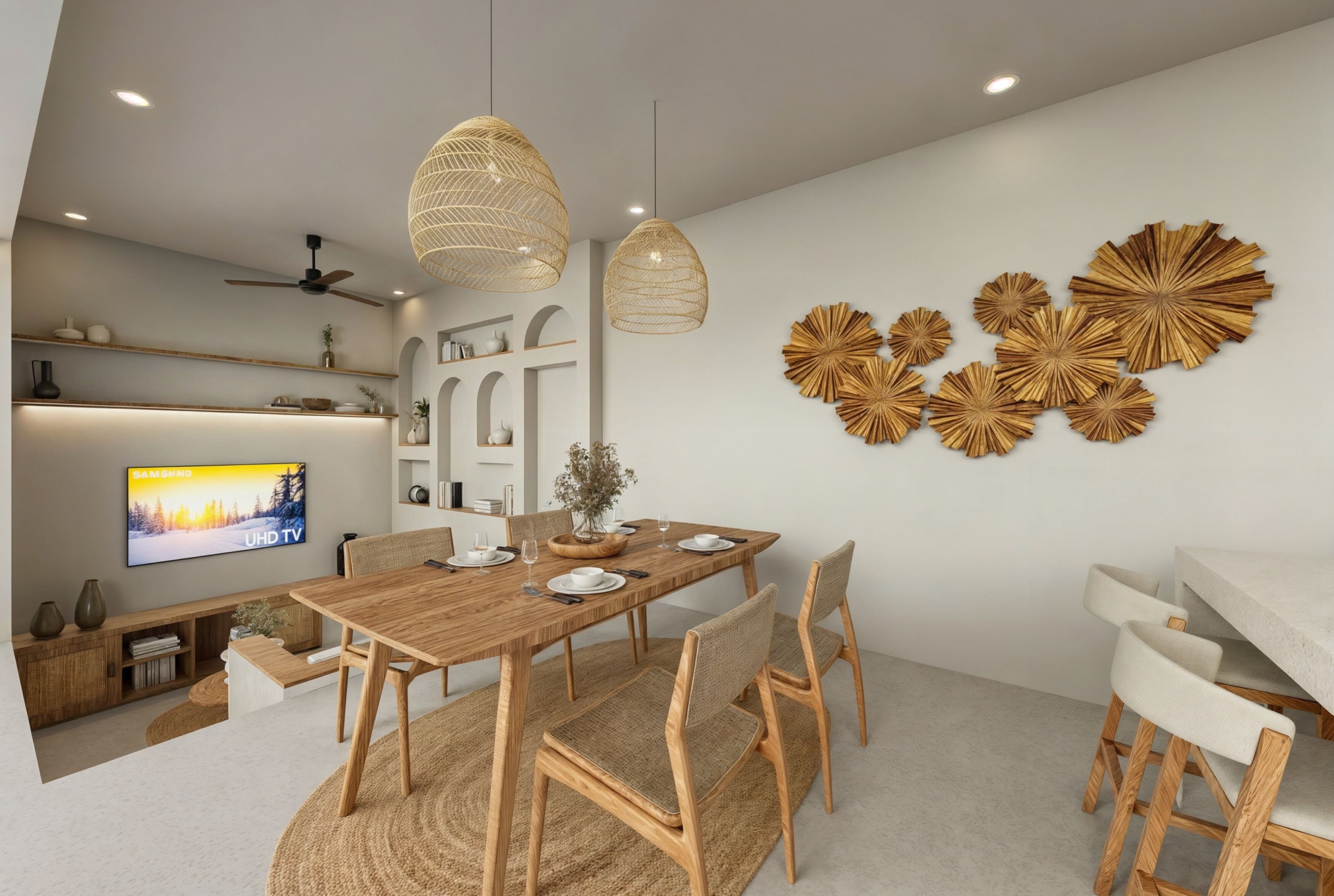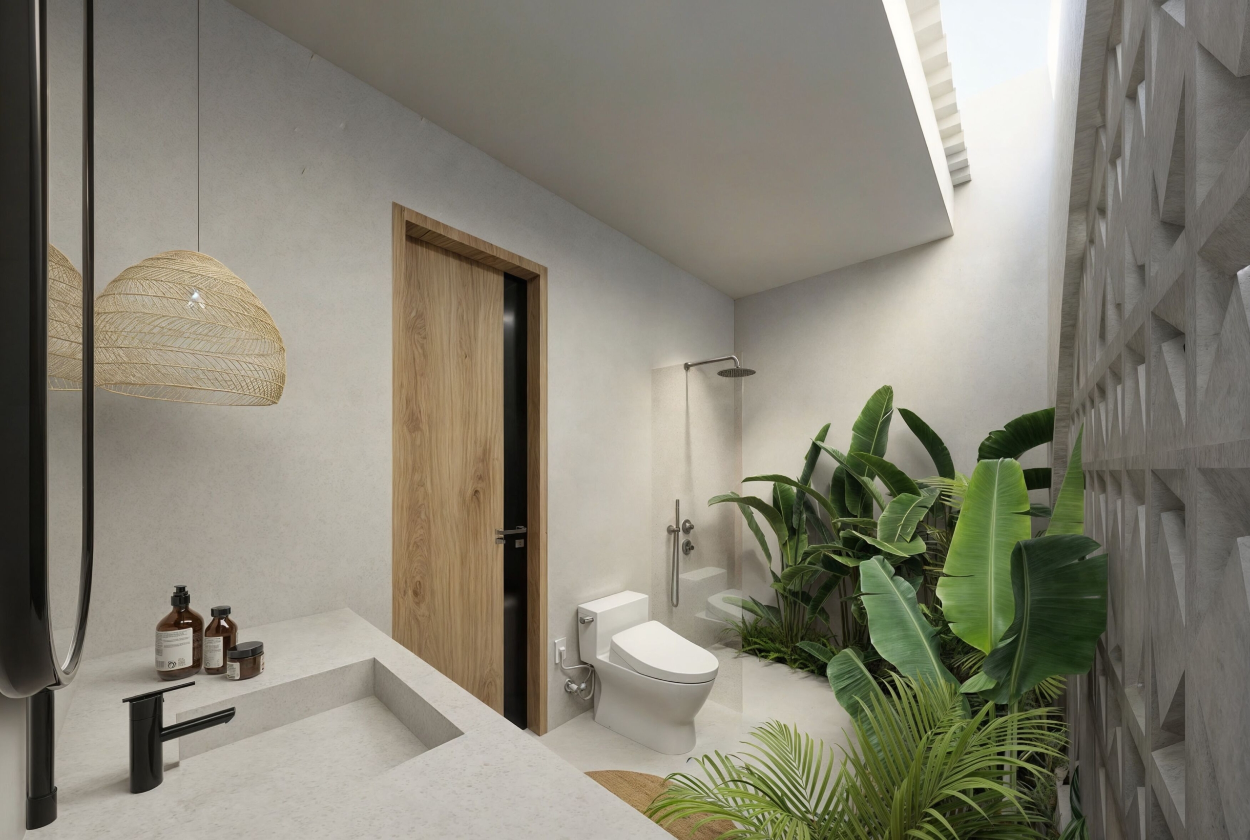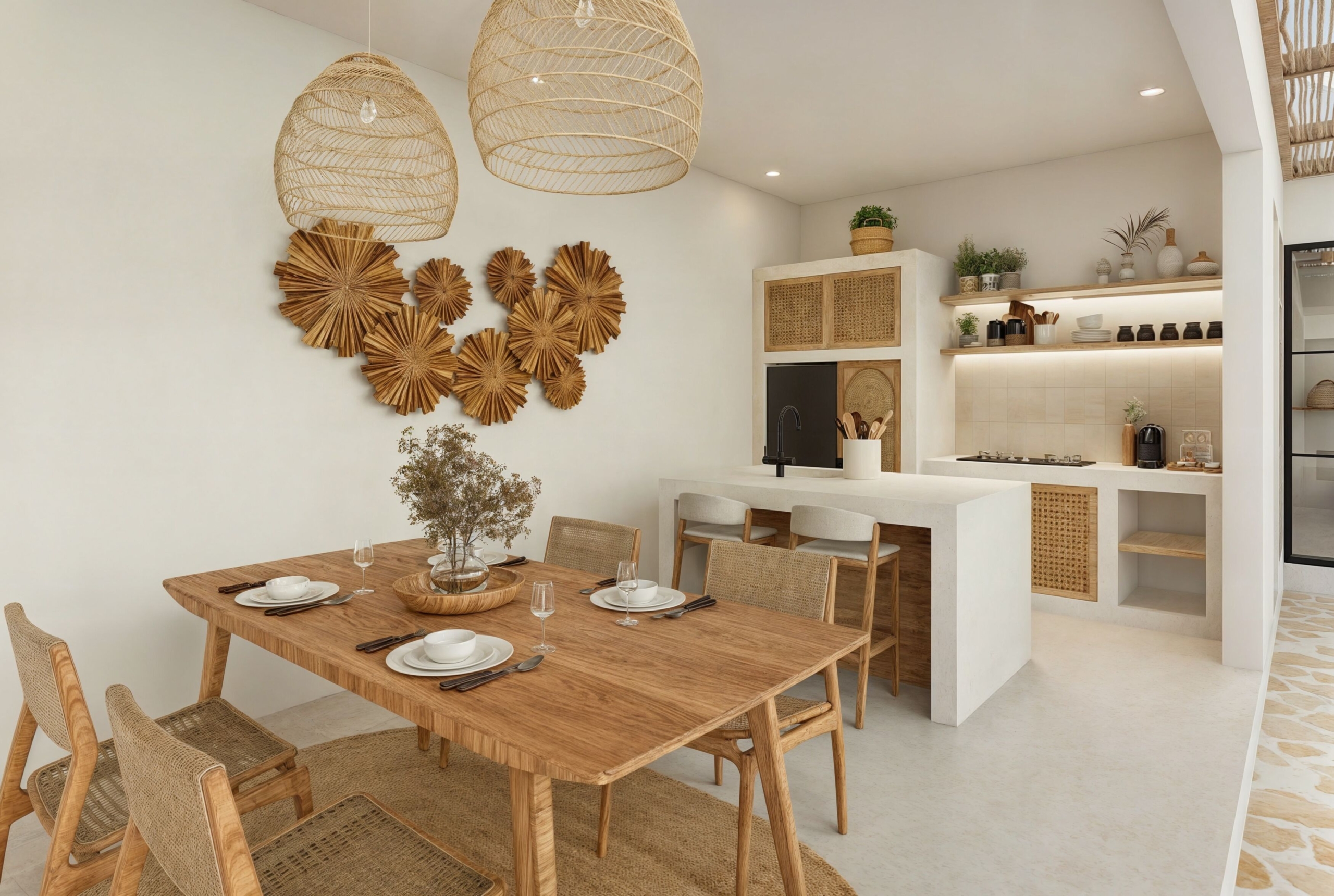 - Gaya: Konsep tropis Mediterania dengan hasil akhir yang halus dan bahan alami