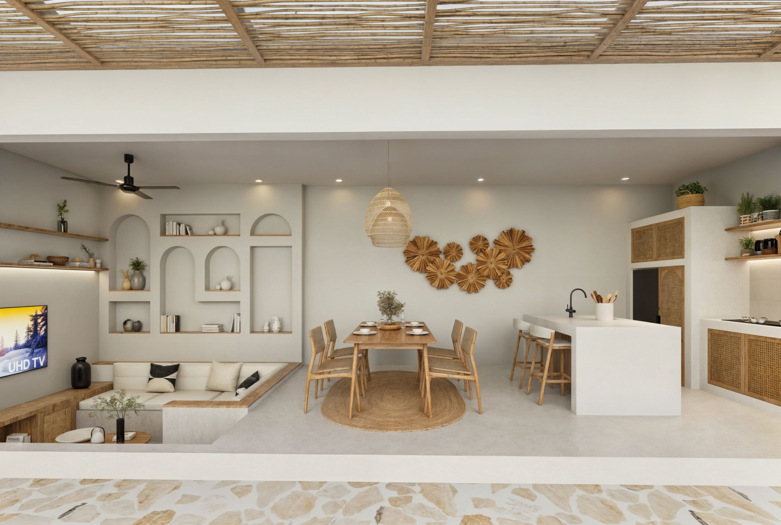 - Ruang Tamu: Desain konsep terbuka dengan area lounge cekung built-in untuk nuansa kontemporer