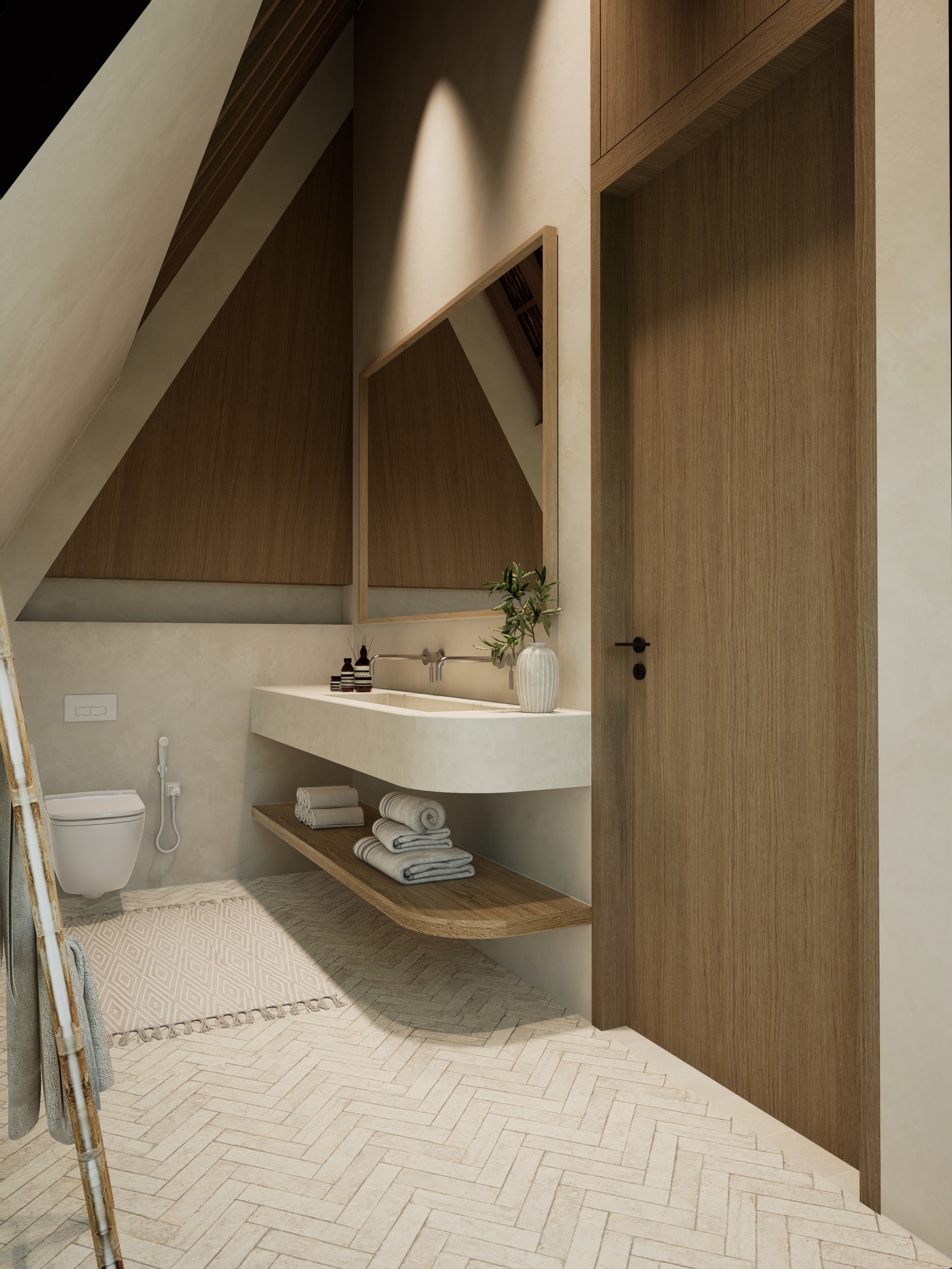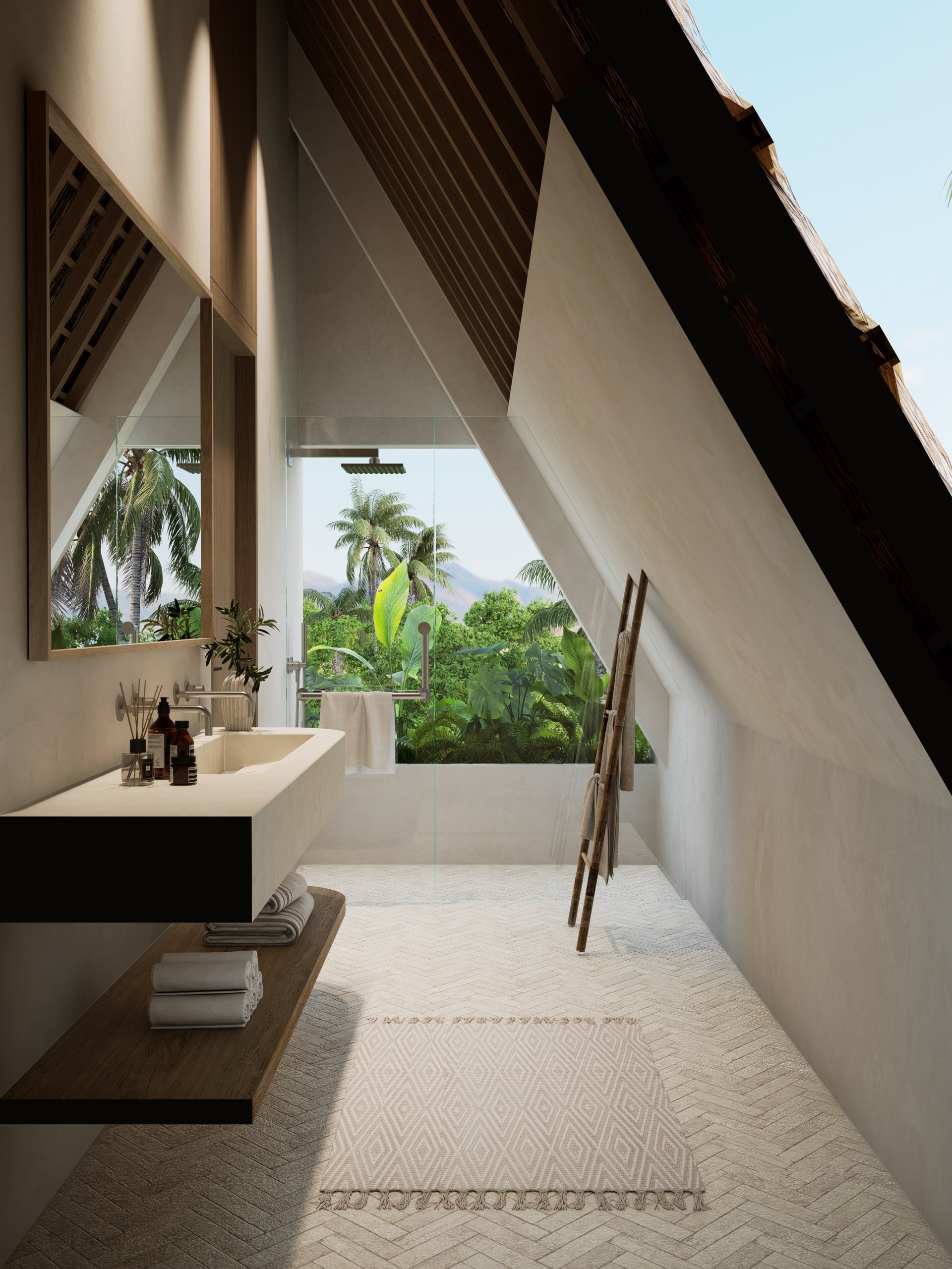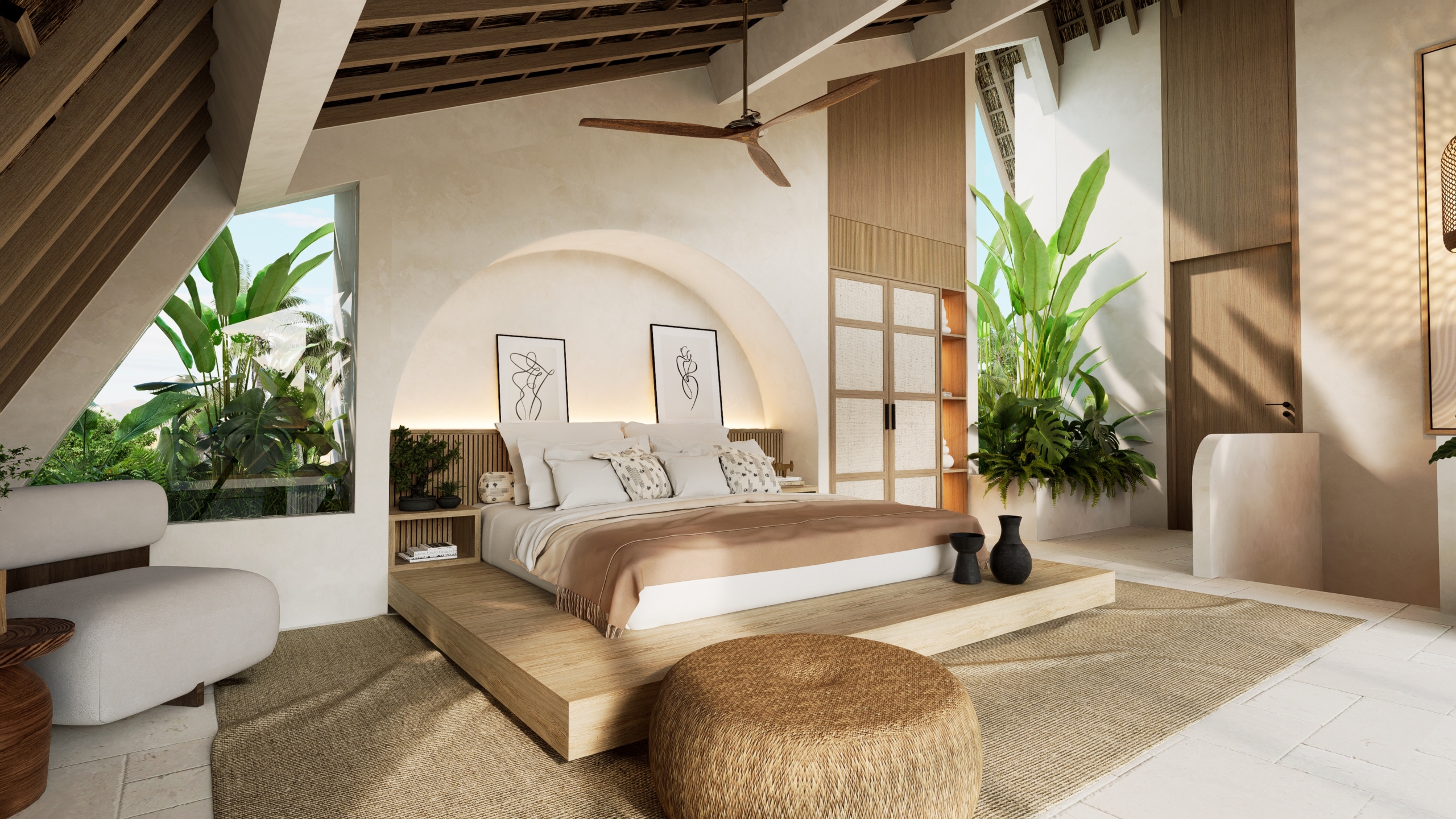 - Kamar tidur utama dengan atap miring, jendela besar, dan kamar mandi en-suite