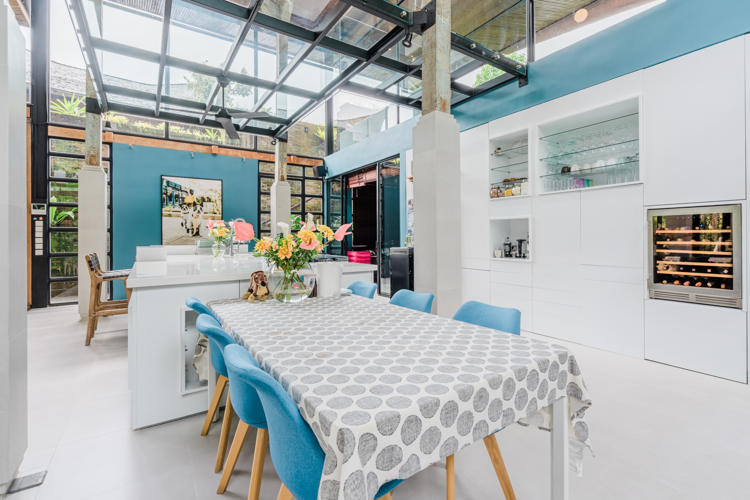 Dapur desainer berkonsep terbuka dan lengkap mencakup pulau dan lemari es anggur. Properti ini telah dirawat dan ditingkatkan dengan cermat, memastikannya terasa baru.