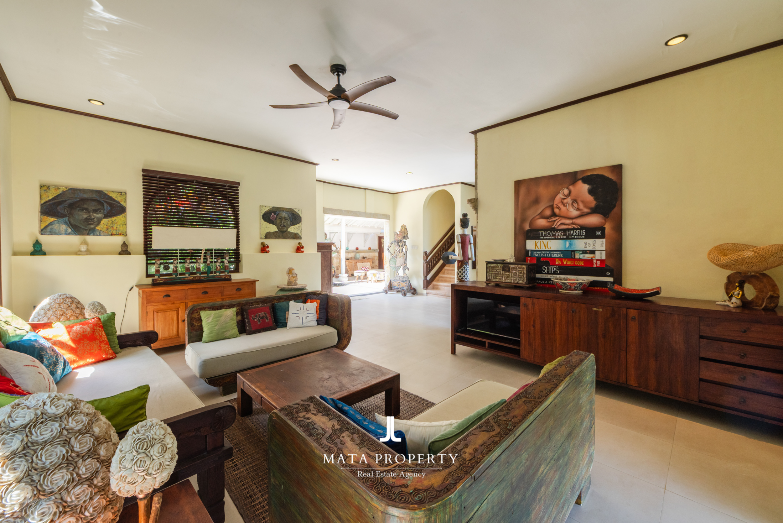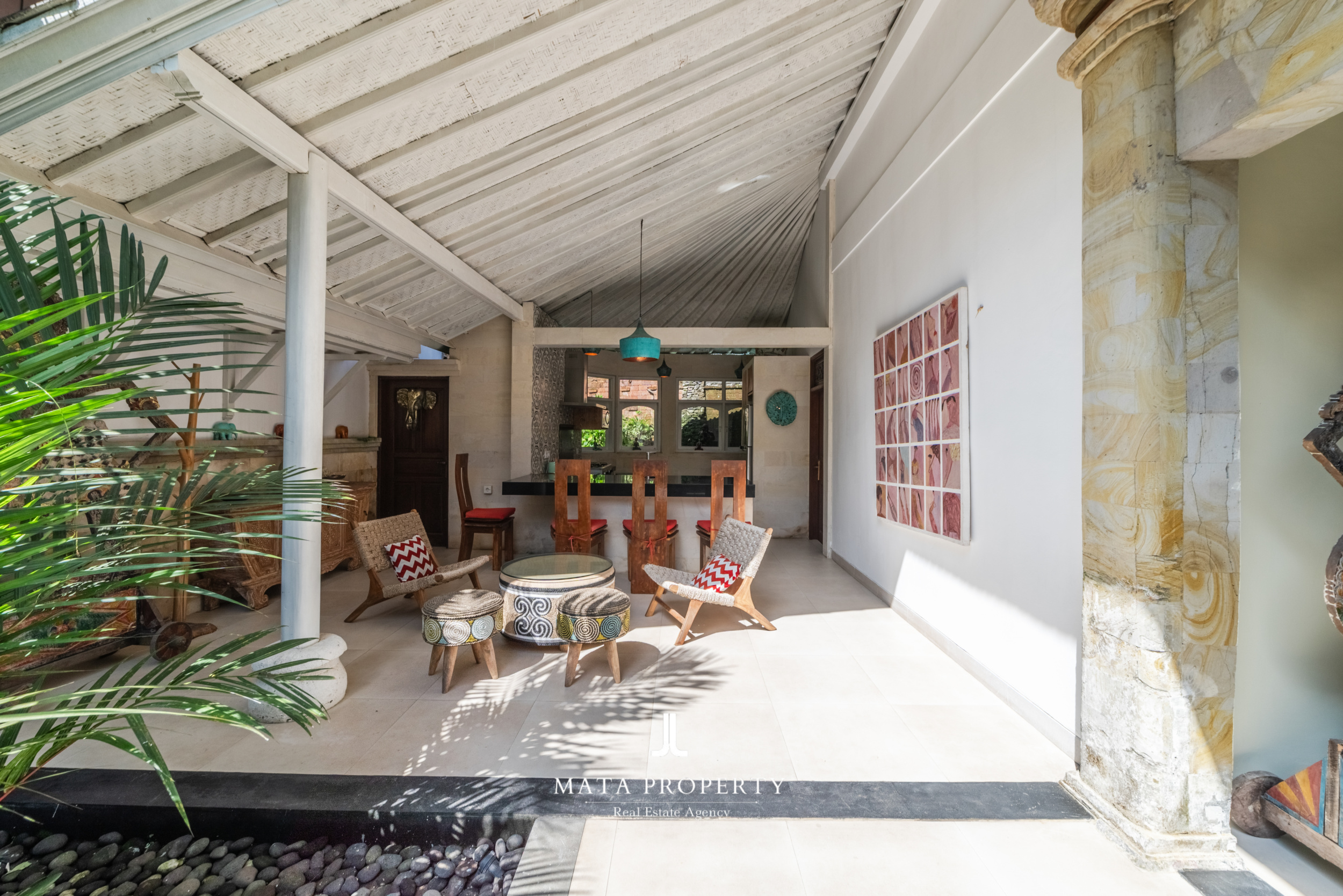 Terletak dengan latar belakang sawah yang indah, vila dua lantai yang elegan ini memadukan pesona Bali dengan kenyamanan modern. Direnovasi pada tahun 2023, properti ini terletak di atas tanah seluas 680 meter persegi dan menawarkan ruang tamu seluas 200 meter persegi yang dirancang untuk relaksasi dan hiburan.