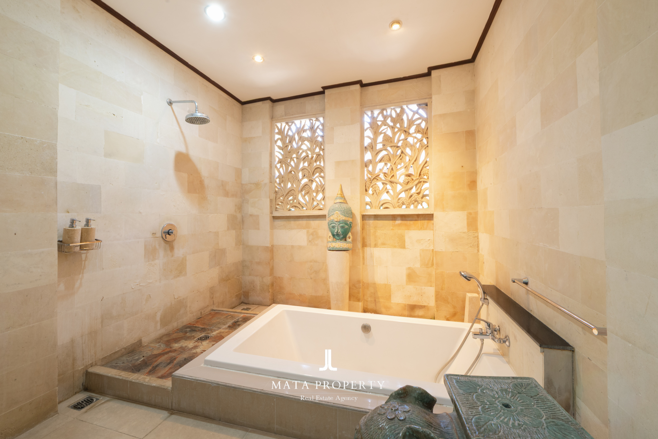 Vila ini memiliki 4 kamar tidur yang luas dan 3 kamar mandi, dilengkapi dengan ruang tamu terbuka dan tertutup yang memadukan kehidupan dalam dan luar ruangan. Kolam renang tak terbatas membentang di sepanjang teras, menyediakan pengaturan yang sempurna untuk bersantap dan bersantai dengan pemandangan yang luar biasa.