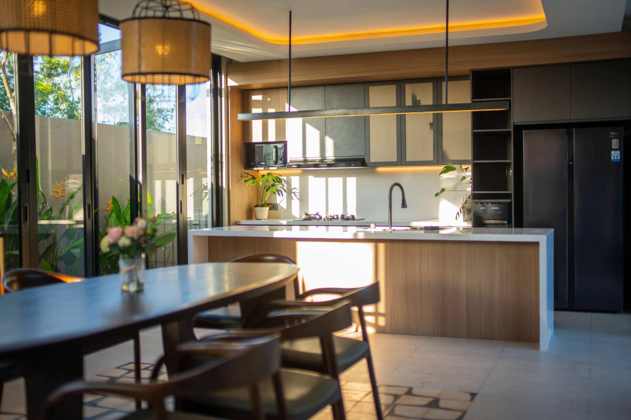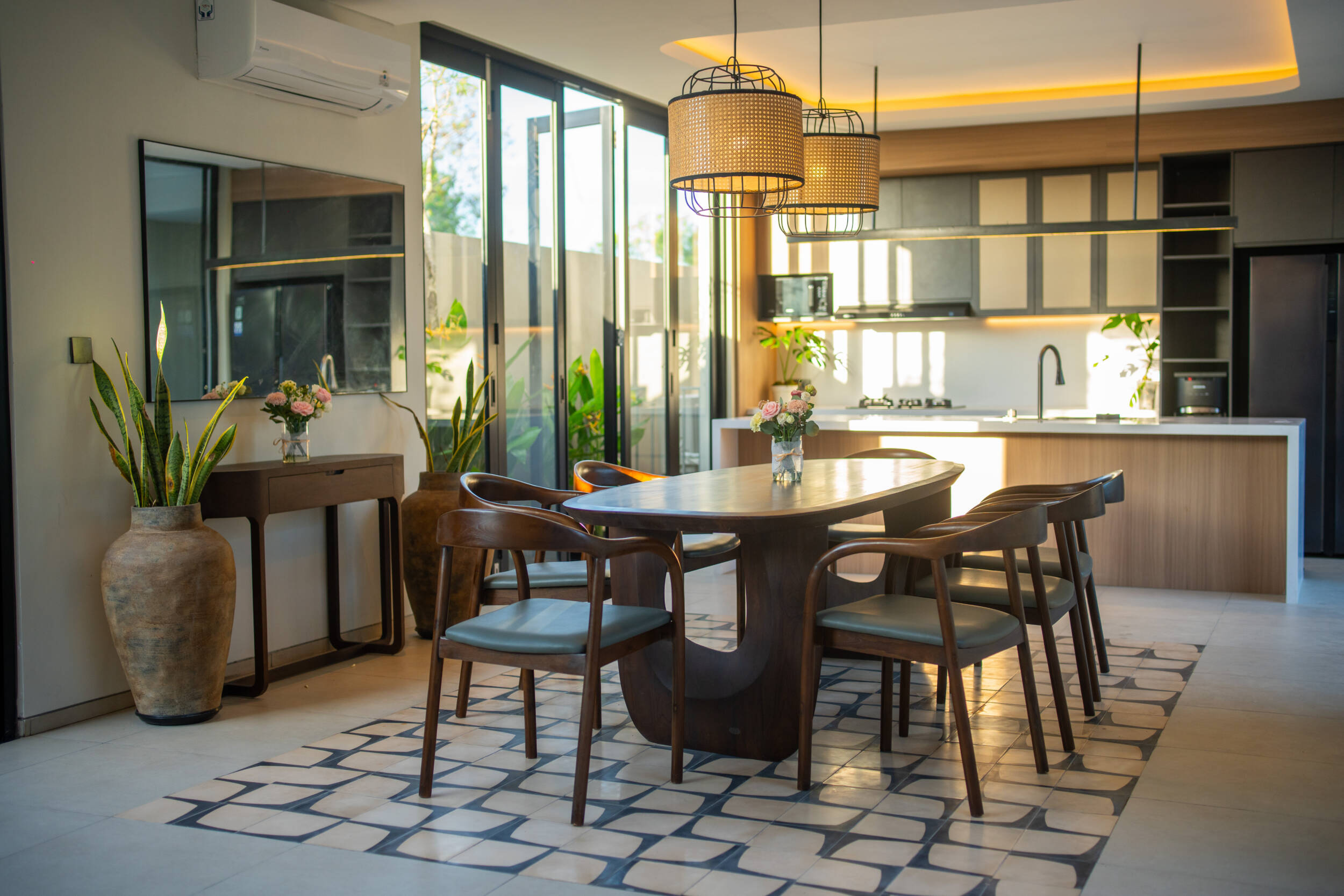 The fully equipped kitchen comes with complete appliances and solid surface countertops, seamlessly connected to a dining area accommodating up to 8 guests. Outdoor living is elevated with a 4 x 10 meter private swimming pool with waterfall, surrounded by a landscaped garden with an automatic watering system.