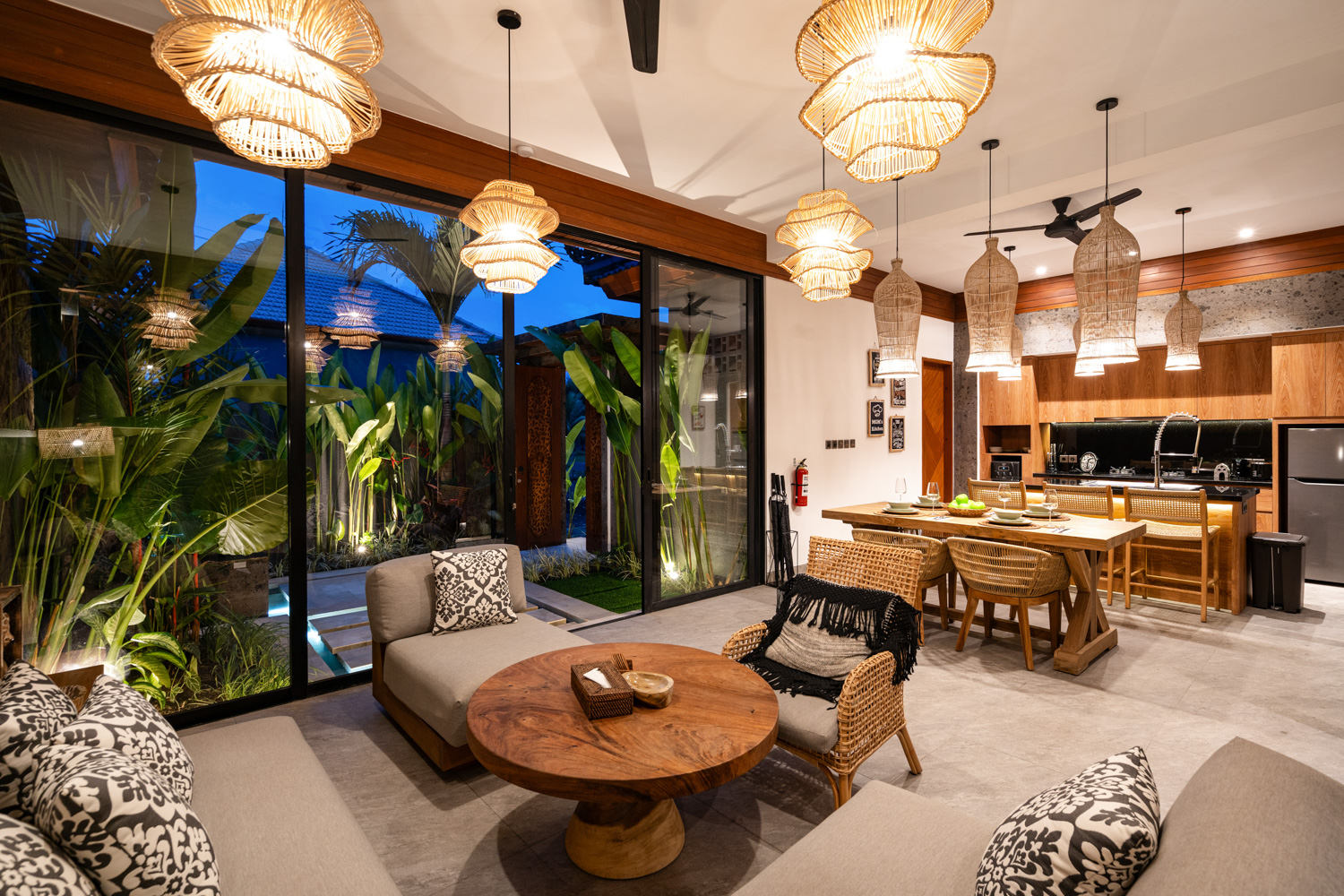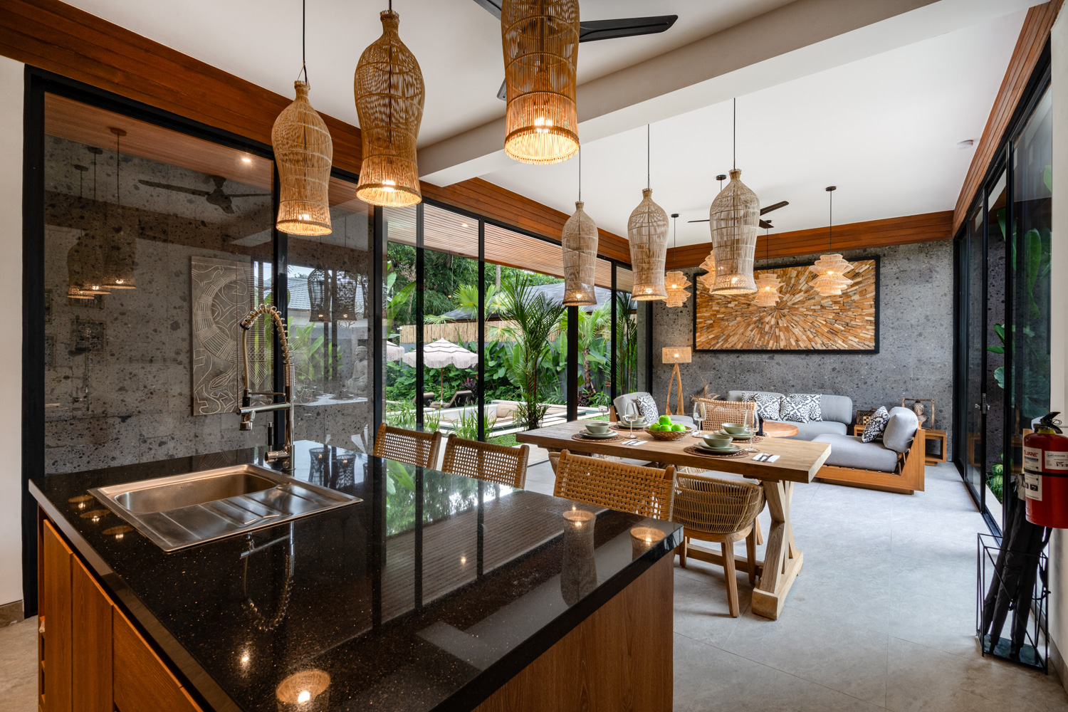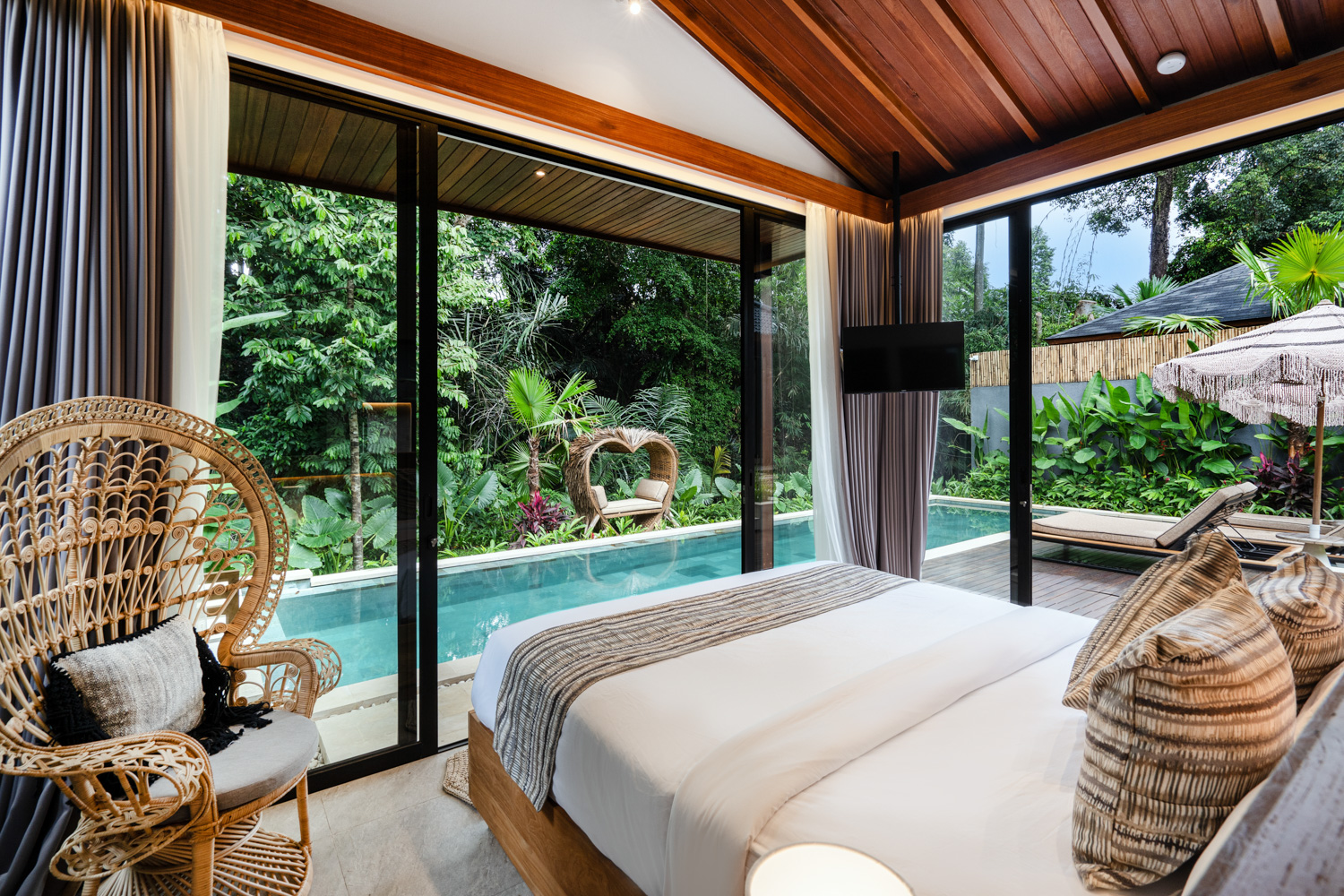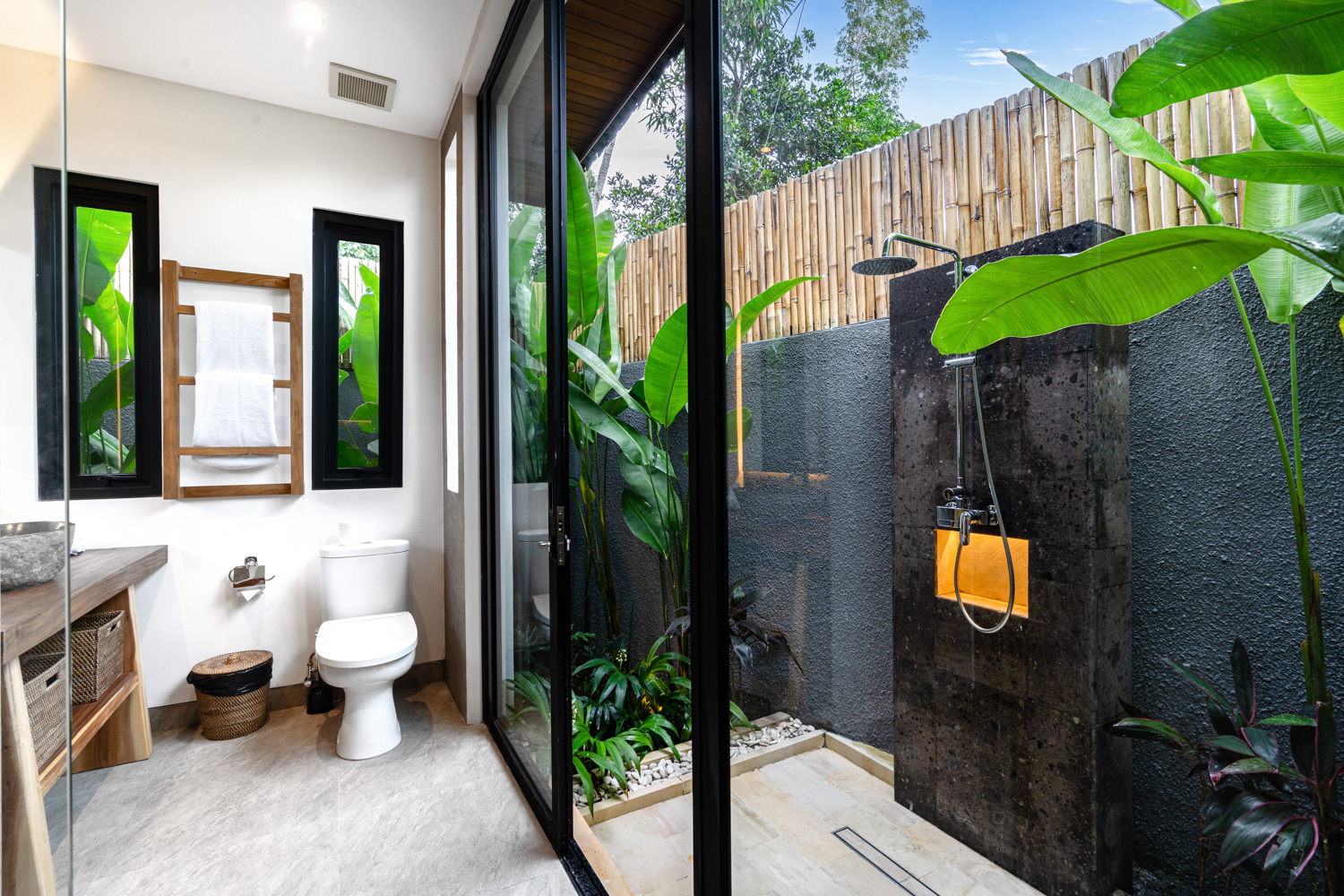 Both bedrooms are equipped with queen-size beds, Smart TVs, and en-suite bathrooms. The first bedroom offers flexibility with a bed convertible to two twins, a large mirror, a cozy reading chair, and an outdoor shower amidst lush greenery. The second bedroom boasts a queen-size bed overlooking the pool and an outdoor bathtub, accessible through an elegant door. The open living area is bathed in natural light, featuring two ceiling fans and a large bay window. The dining area fosters intimate gatherings, while the well-equipped kitchen caters to all culinary needs. A dedicated storage room adds convenience to the property.