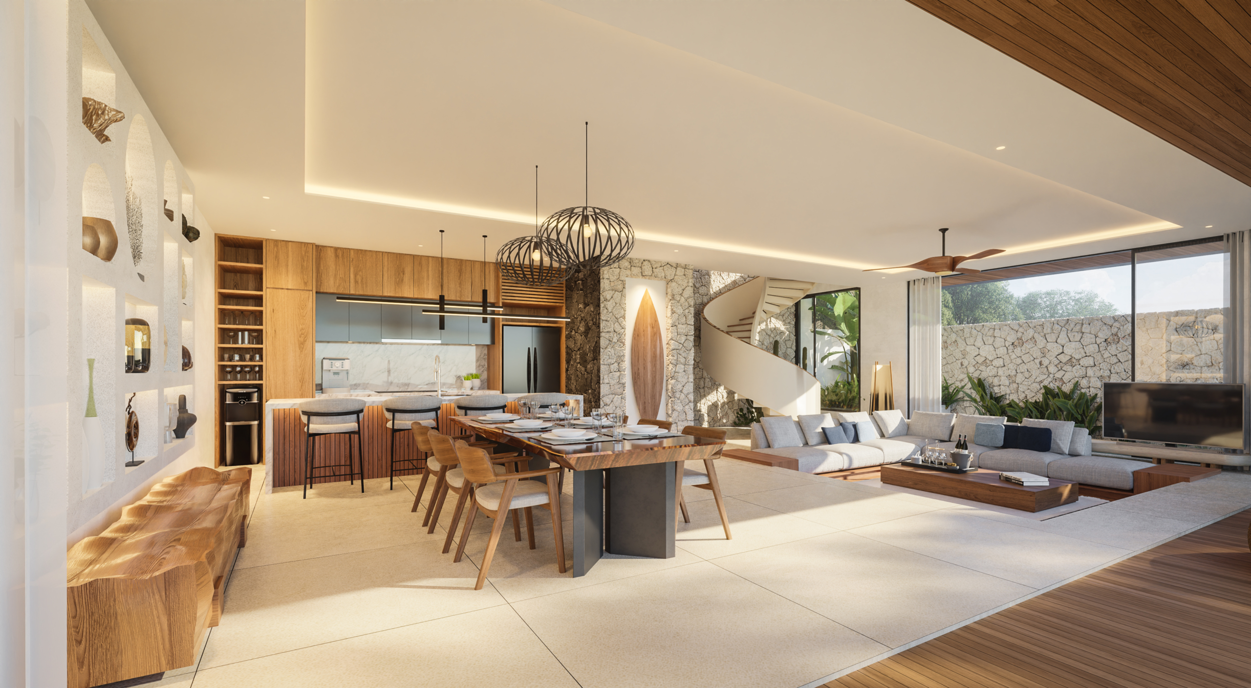 A spacious haven spans over 159 sqm with a private tropical garden, a pirate terrace with swimming pool, and an open plan kitchen.