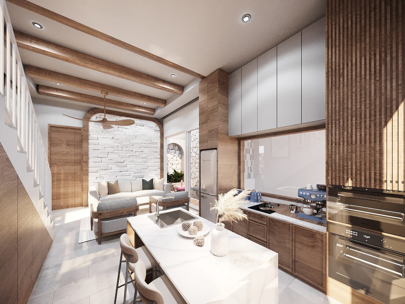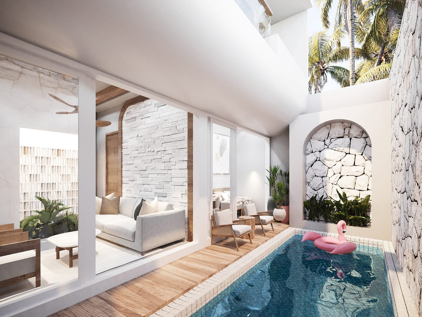 The design blends tropical contemporary aesthetics with smart functionality. Inside, you’ll find a bright open-plan living area, a custom kitchen with island, and three bedrooms—all with ensuite bathrooms. The master suite includes a bathtub and double vanity. Outdoors, the 6.5 x 2.1 m pool is finished in Bali green natural stone, and a carport is included.