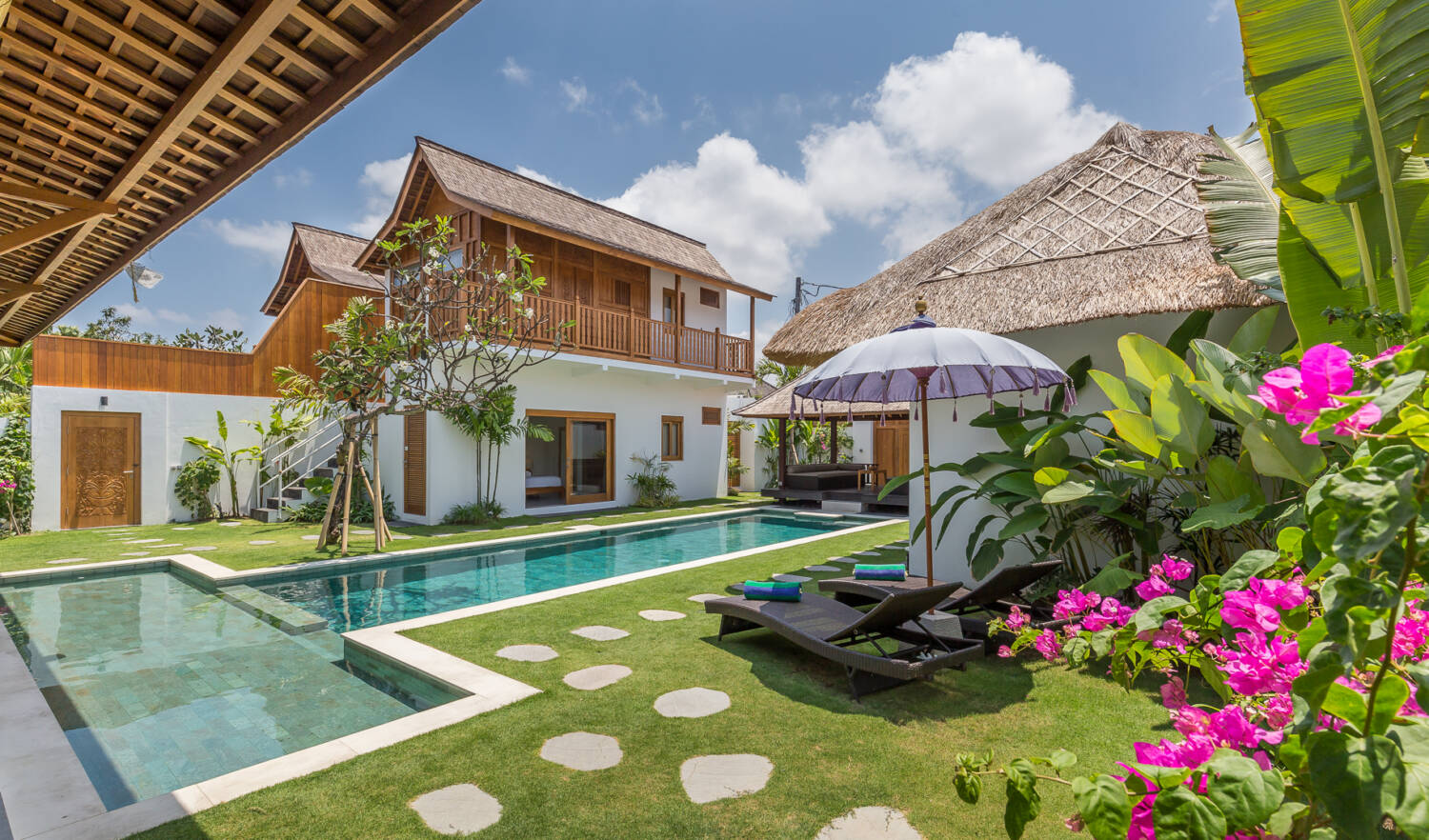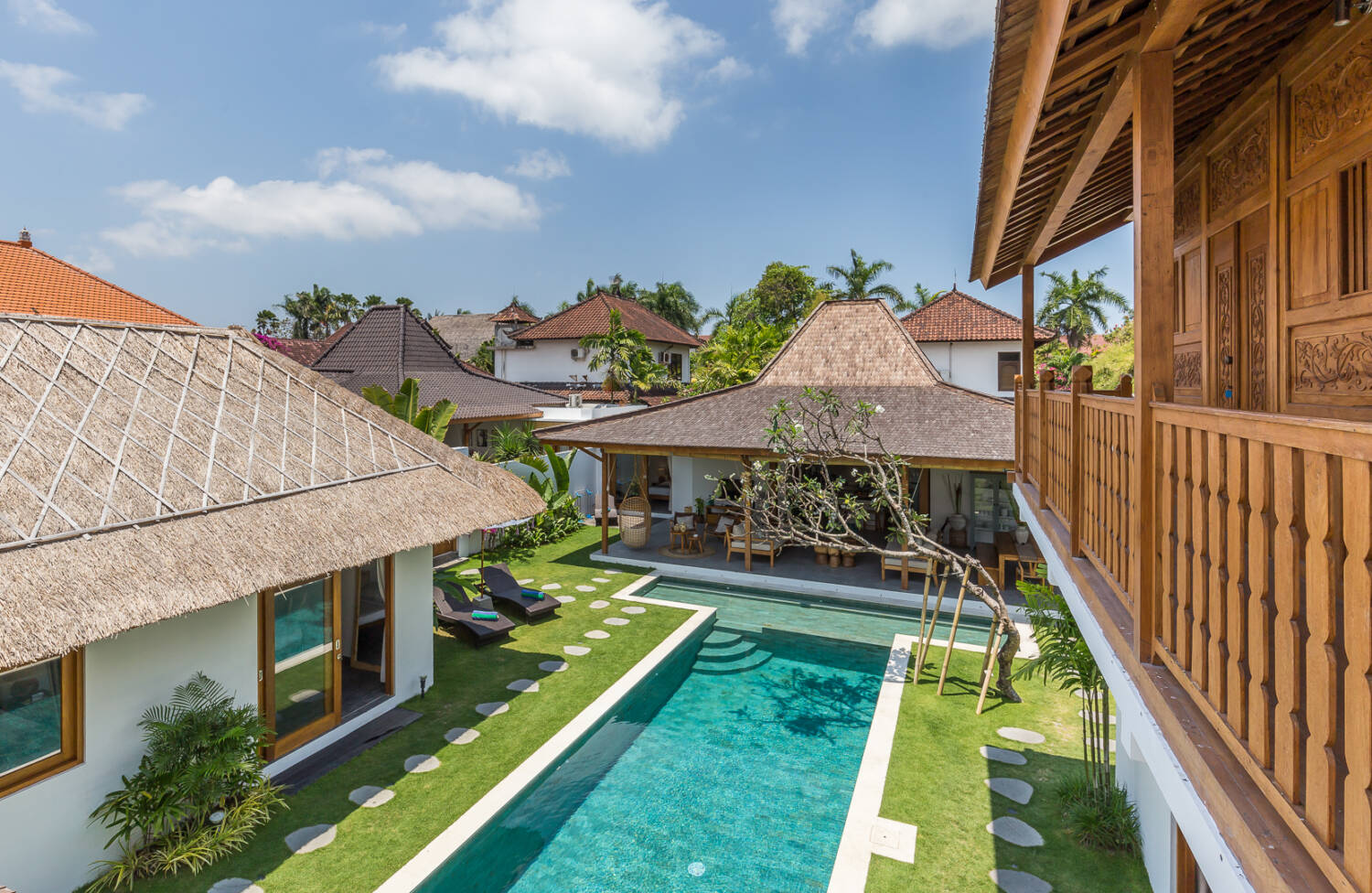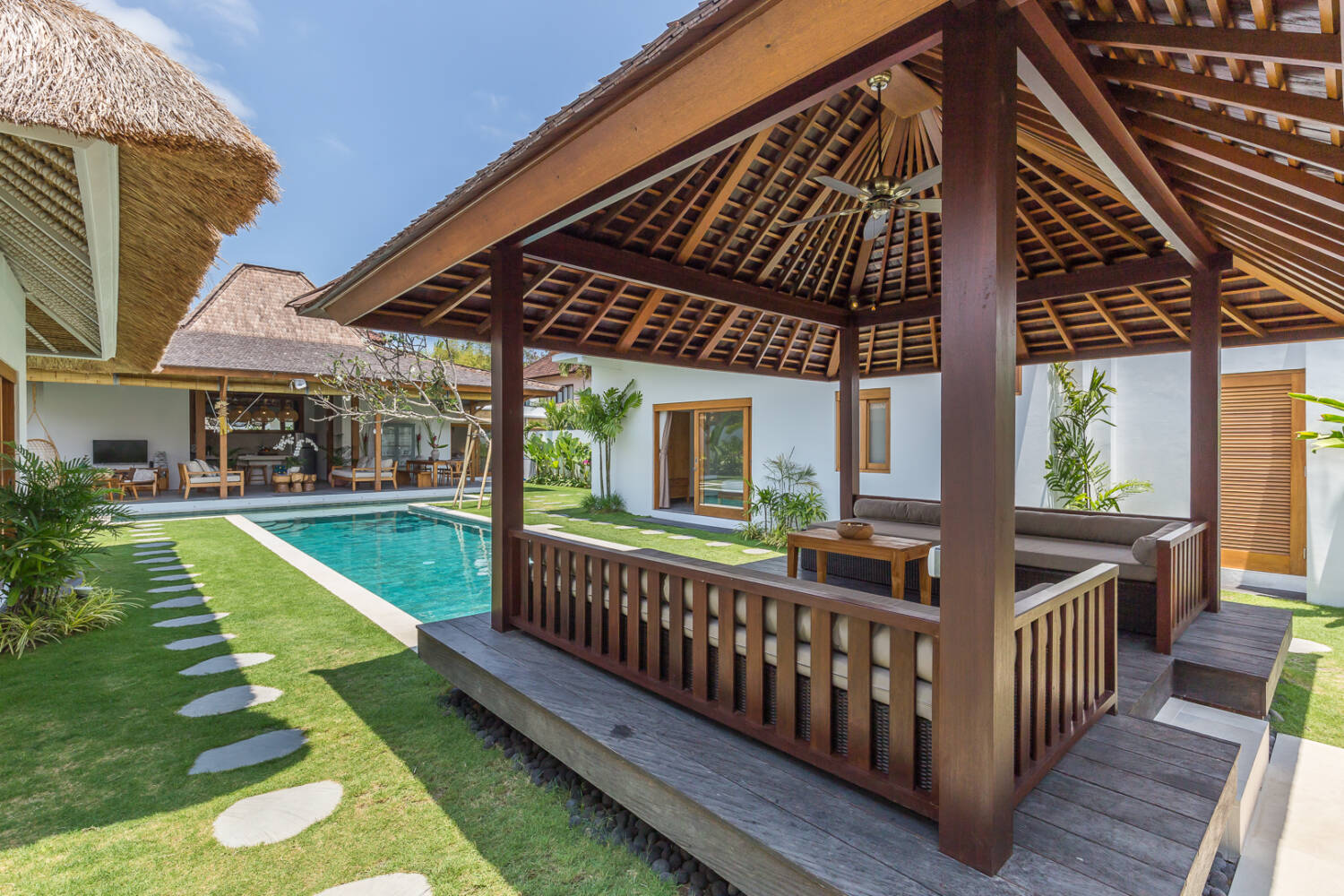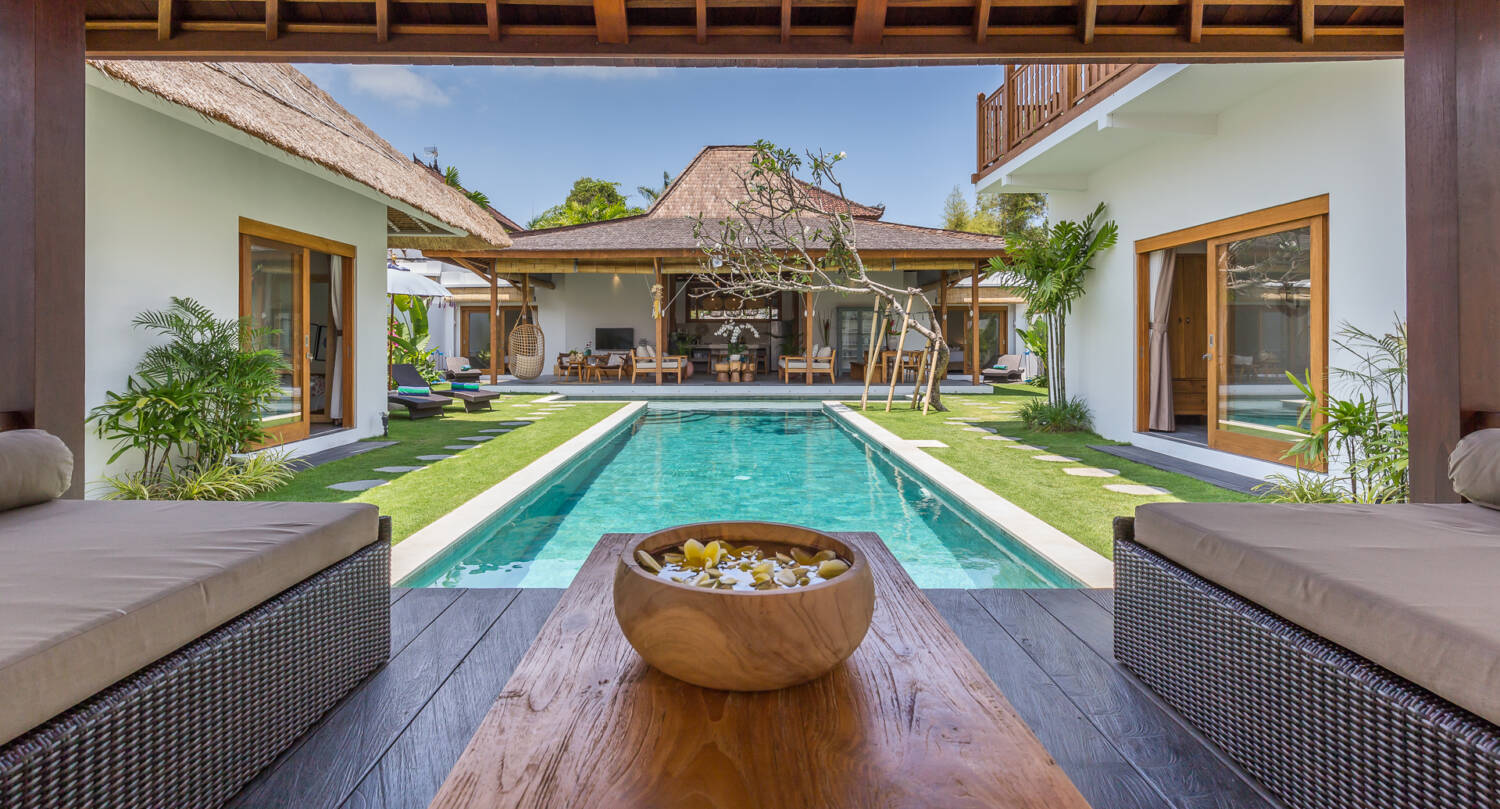 Despite being right in the heart of the action, the villa feels private and secure. Built around a 14-meter T-shaped swimming pool and lush tropical garden, the property blends Joglo architecture with Gladak teak wood structures, creating a timeless tropical atmosphere.