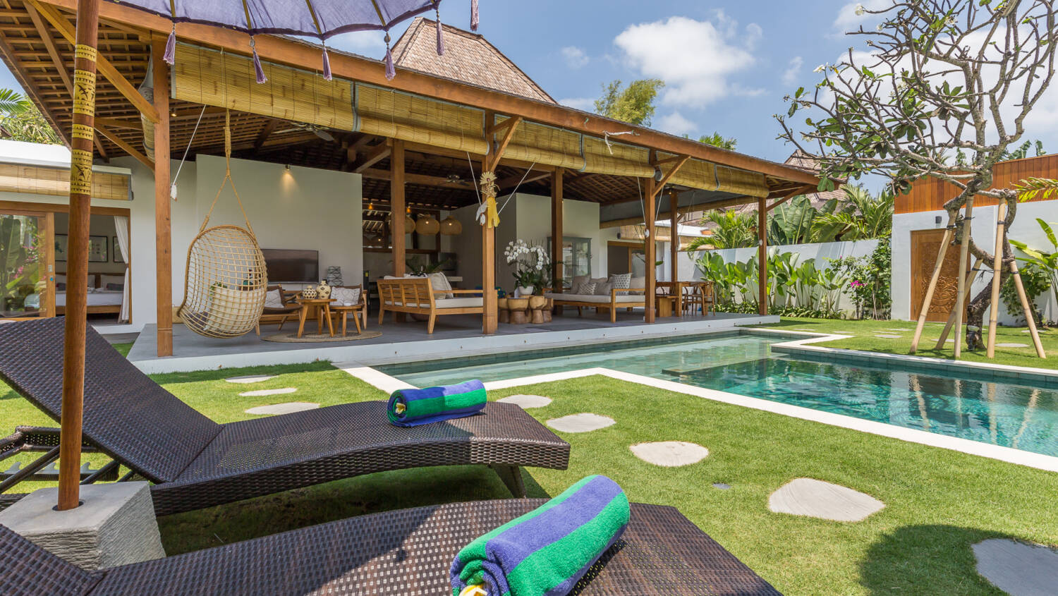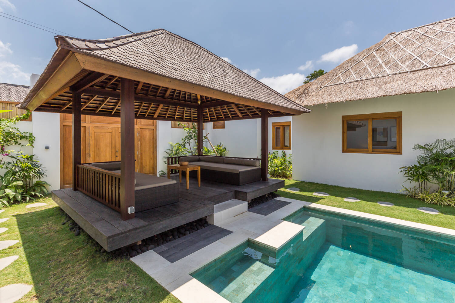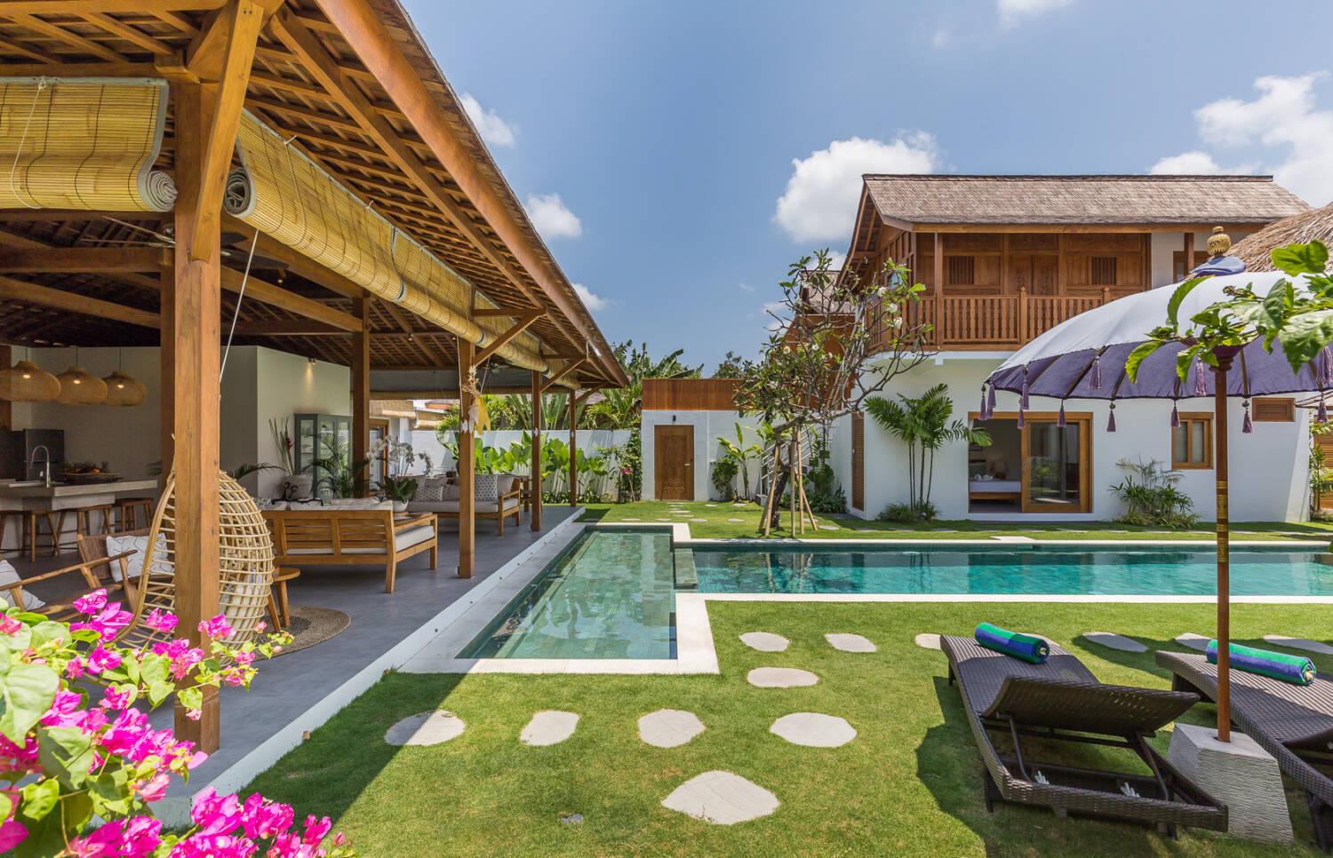 Despite being right in the heart of the action, the villa feels private and secure. Built around a 14-meter T-shaped swimming pool and lush tropical garden, the property blends Joglo architecture with Gladak teak wood structures, creating a timeless tropical atmosphere.