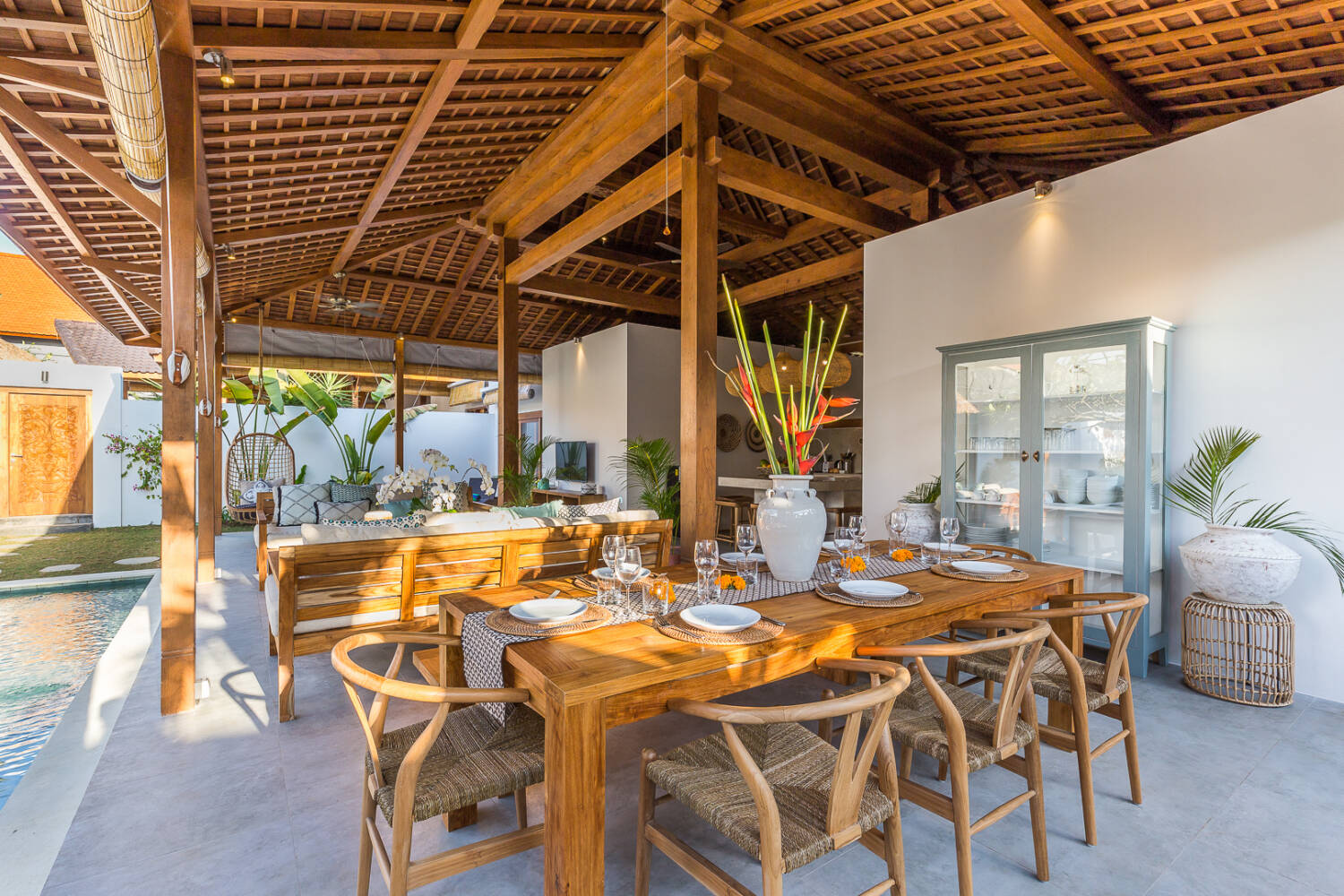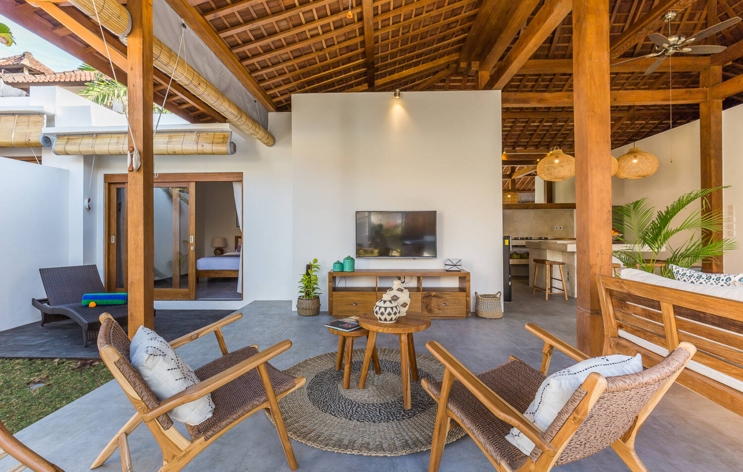 The Joglo pavilion serves as the main living and dining area. It features a fully equipped kitchen, dining table, bar and TV lounge. The semi-open design overlooks the 14-meter private pool and garden, allowing constant airflow and natural light.