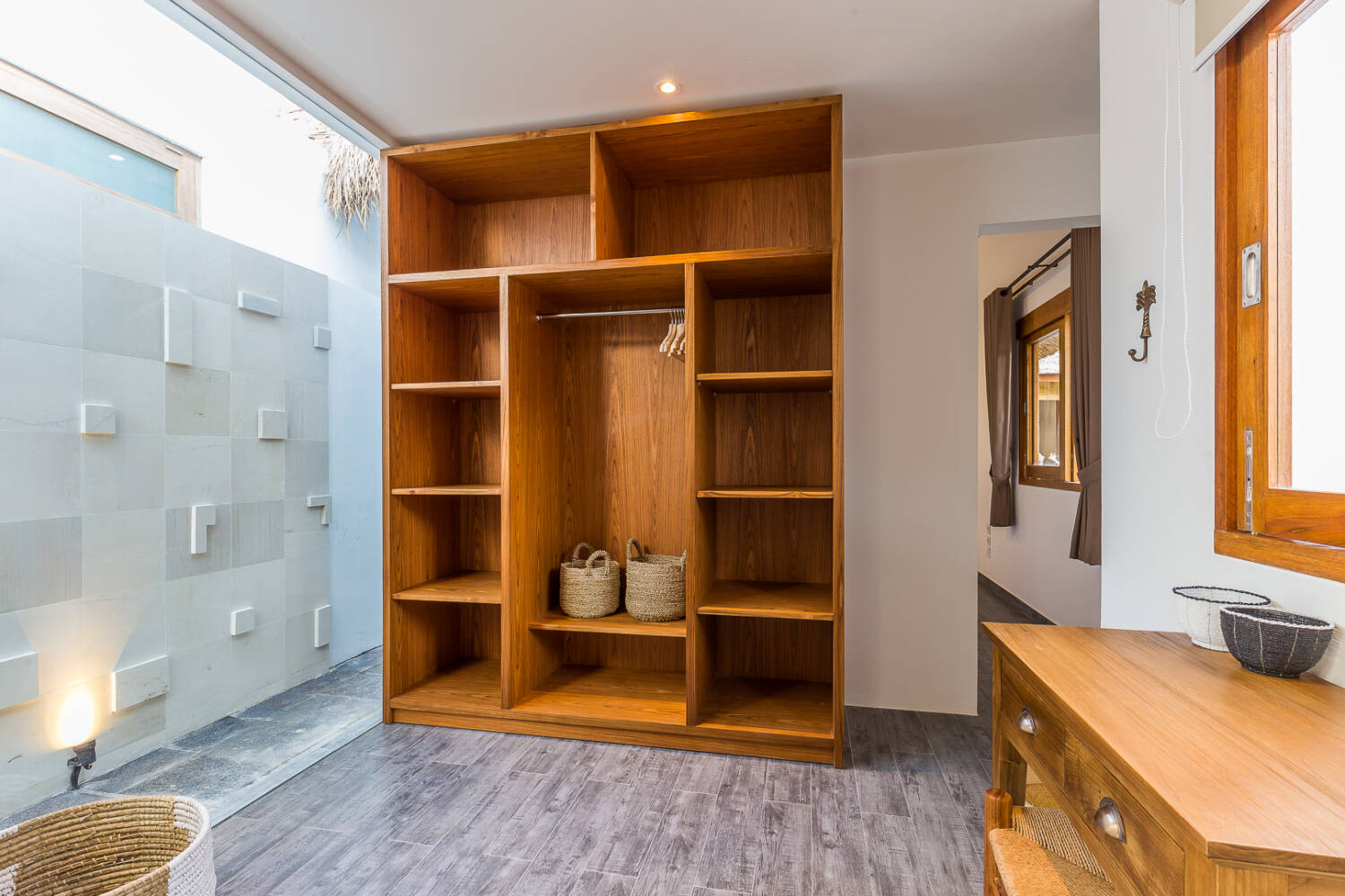 • Semi-open living area (ceiling fans, no AC in common space)