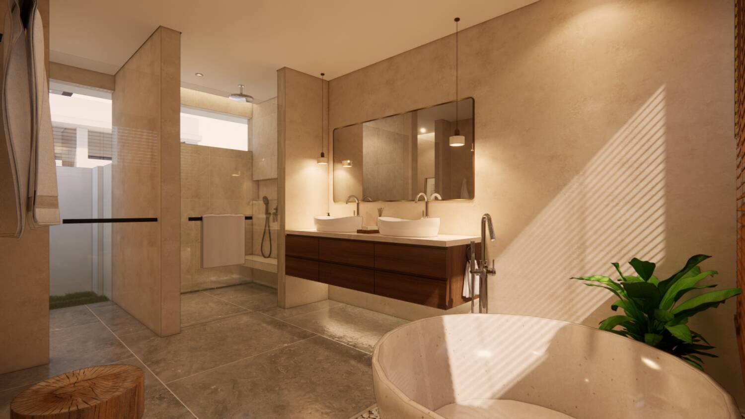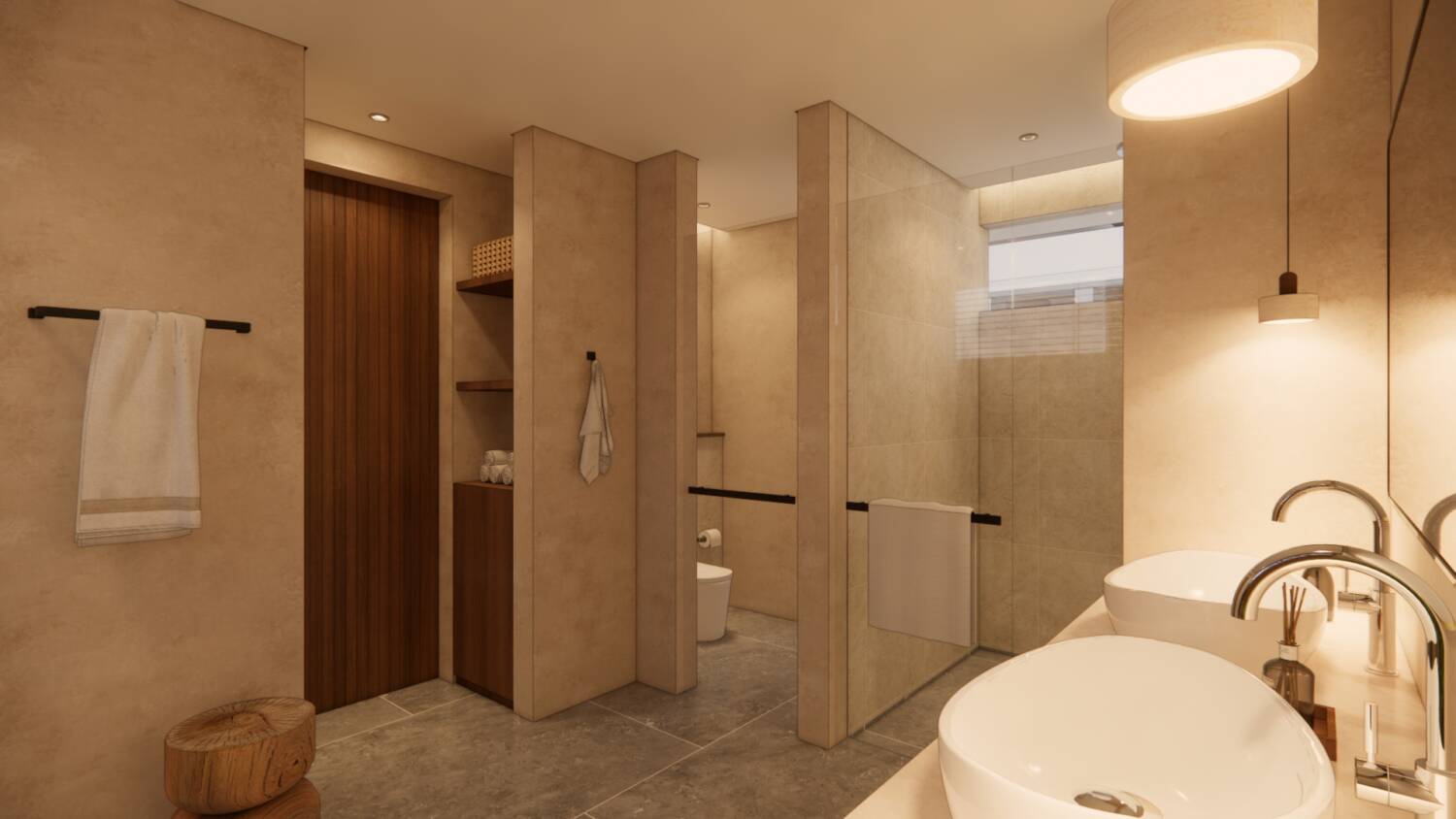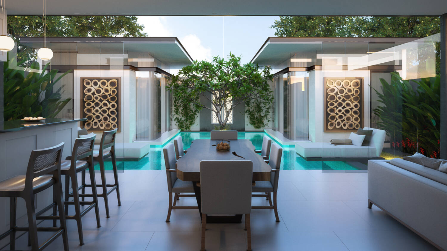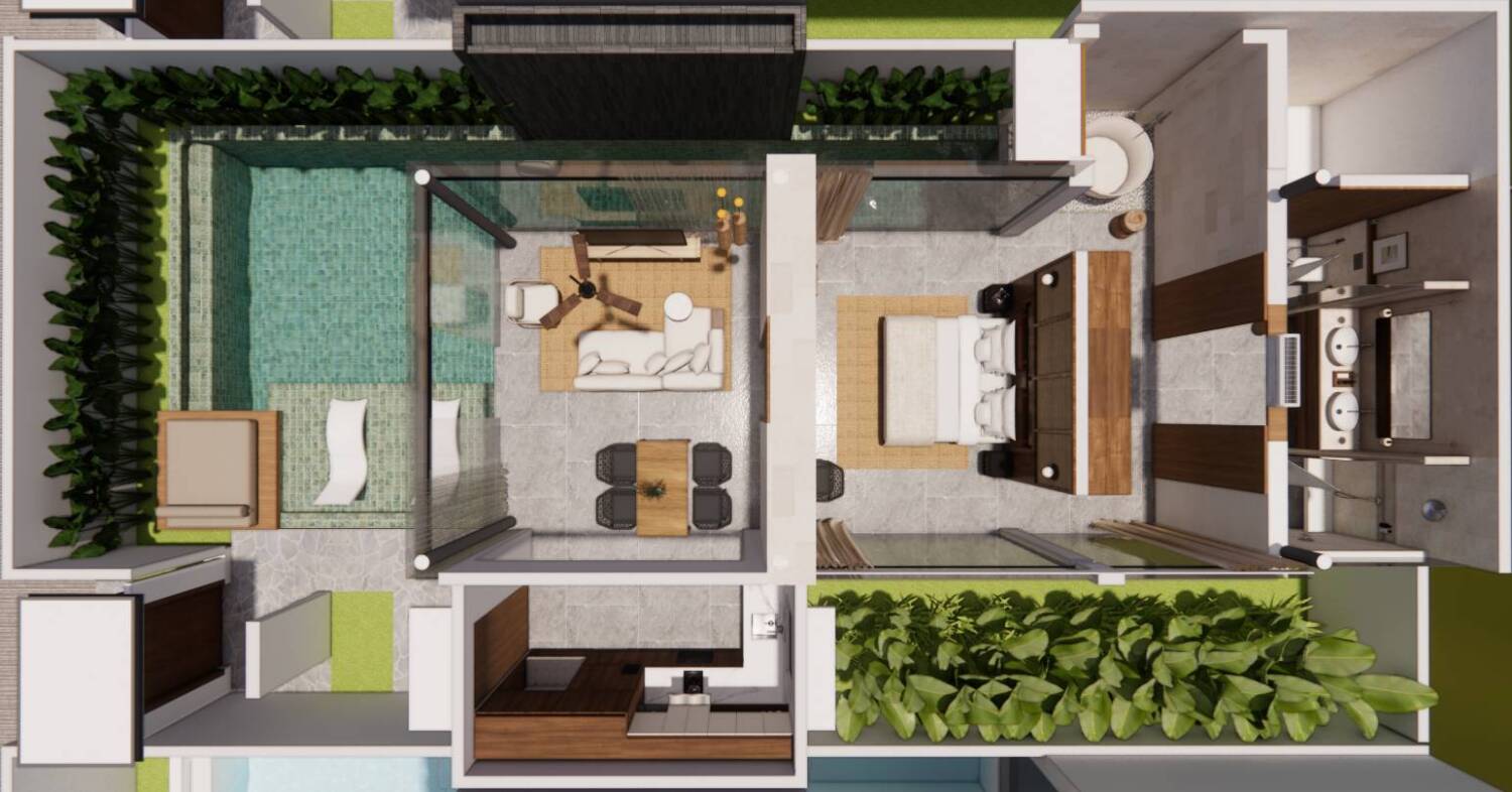 Each villa features private pools, open indoor–outdoor living, natural materials, full kitchens, and direct bedroom-to-pool flow. The design focuses on calm interiors, privacy, and natural ventilation, using Jogja stone, terrazzo and ulin wood to create a timeless architectural style