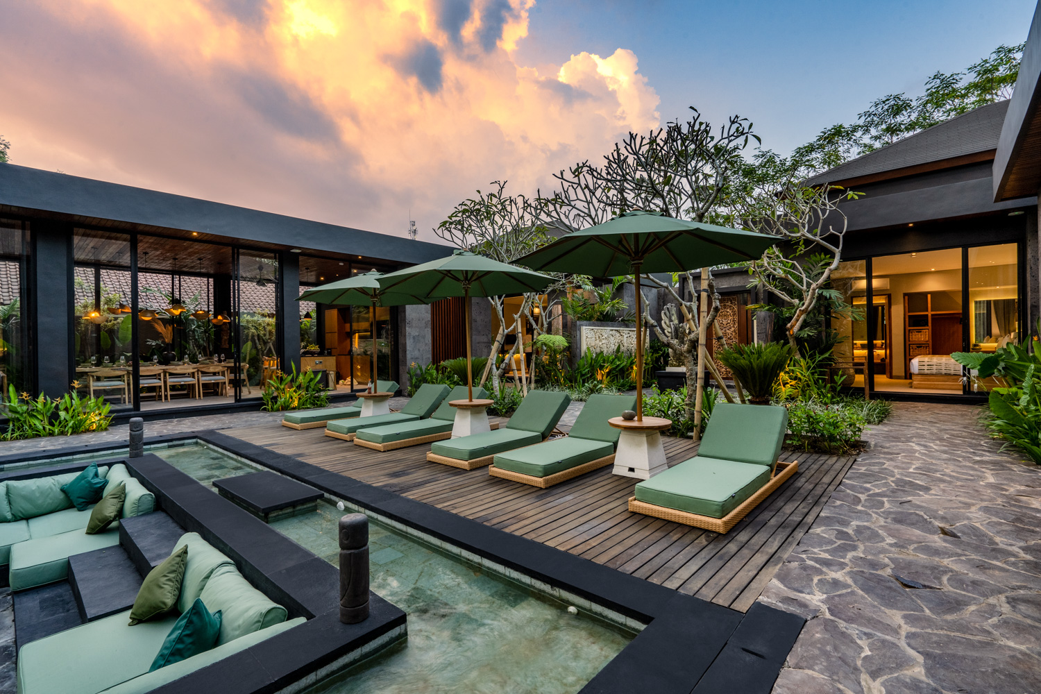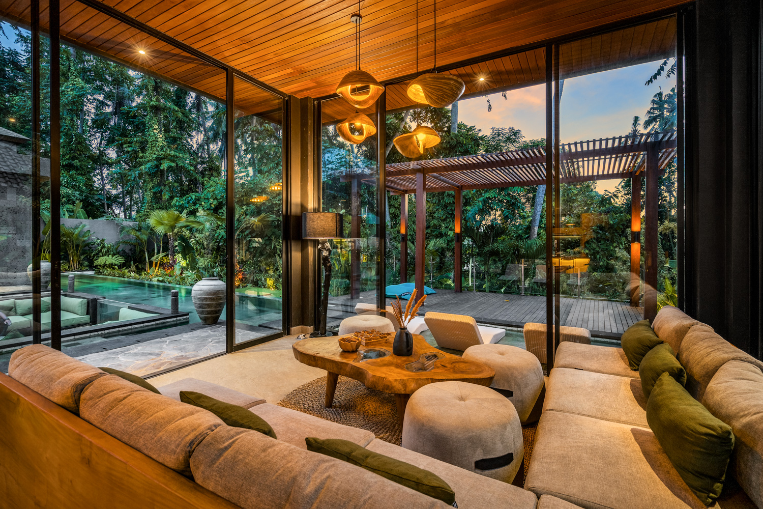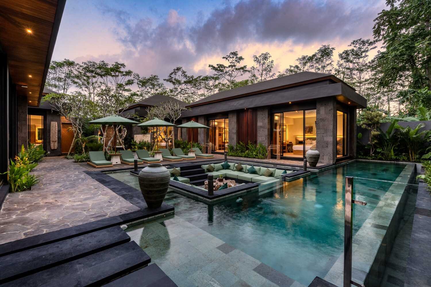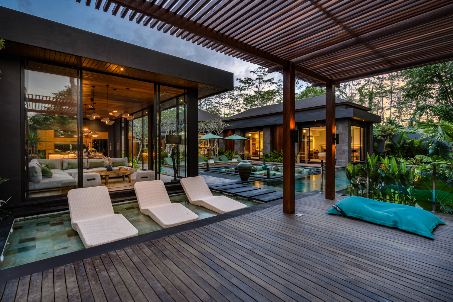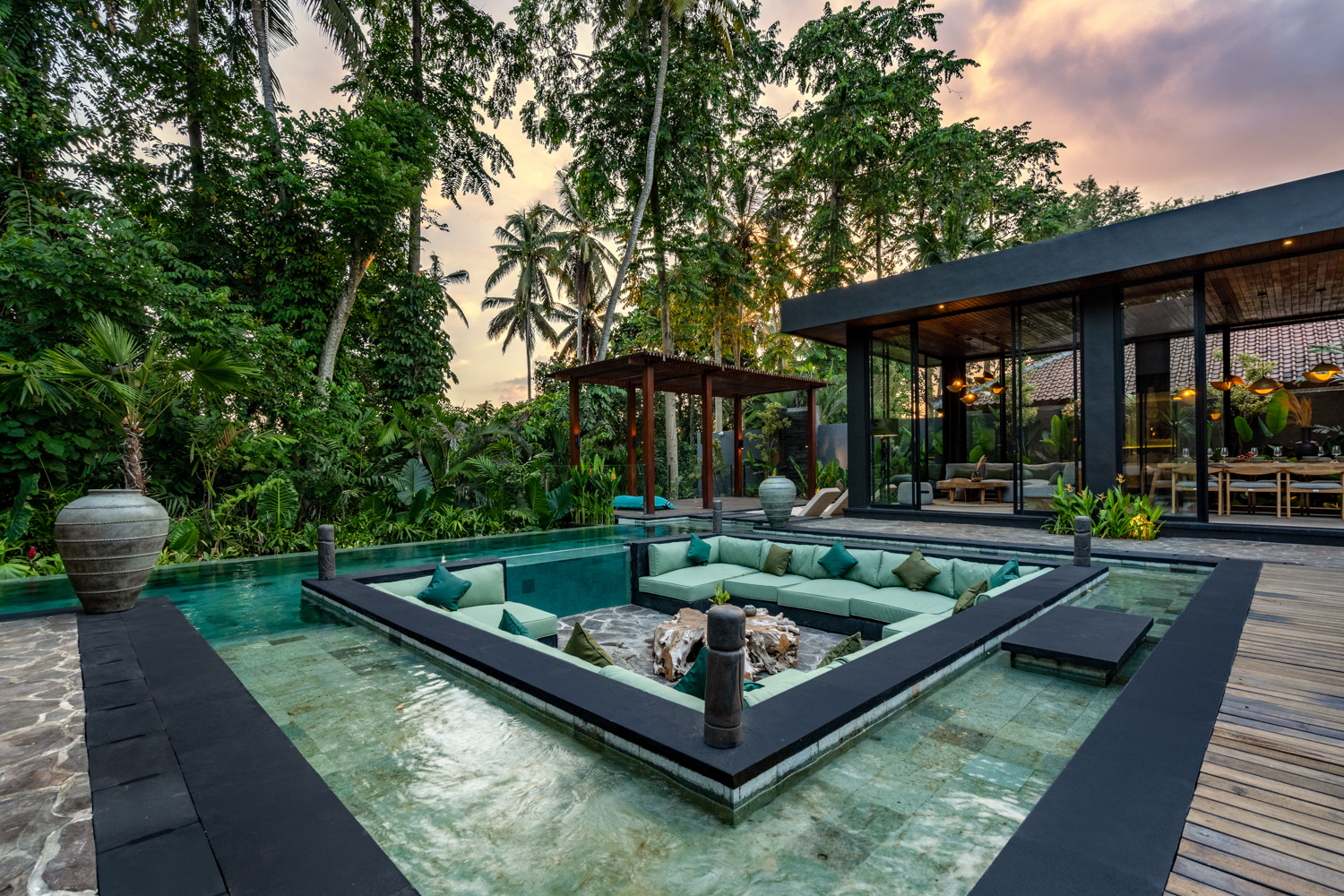 The highlight of this villa is the large pool on the edge to nature with a sunken lounge area. The sunken lounge area in the pool is the perfect place to come together with your loved ones. The indirect lightening under the seating as well as the pool lights are making it also the perfect spot in the evening
