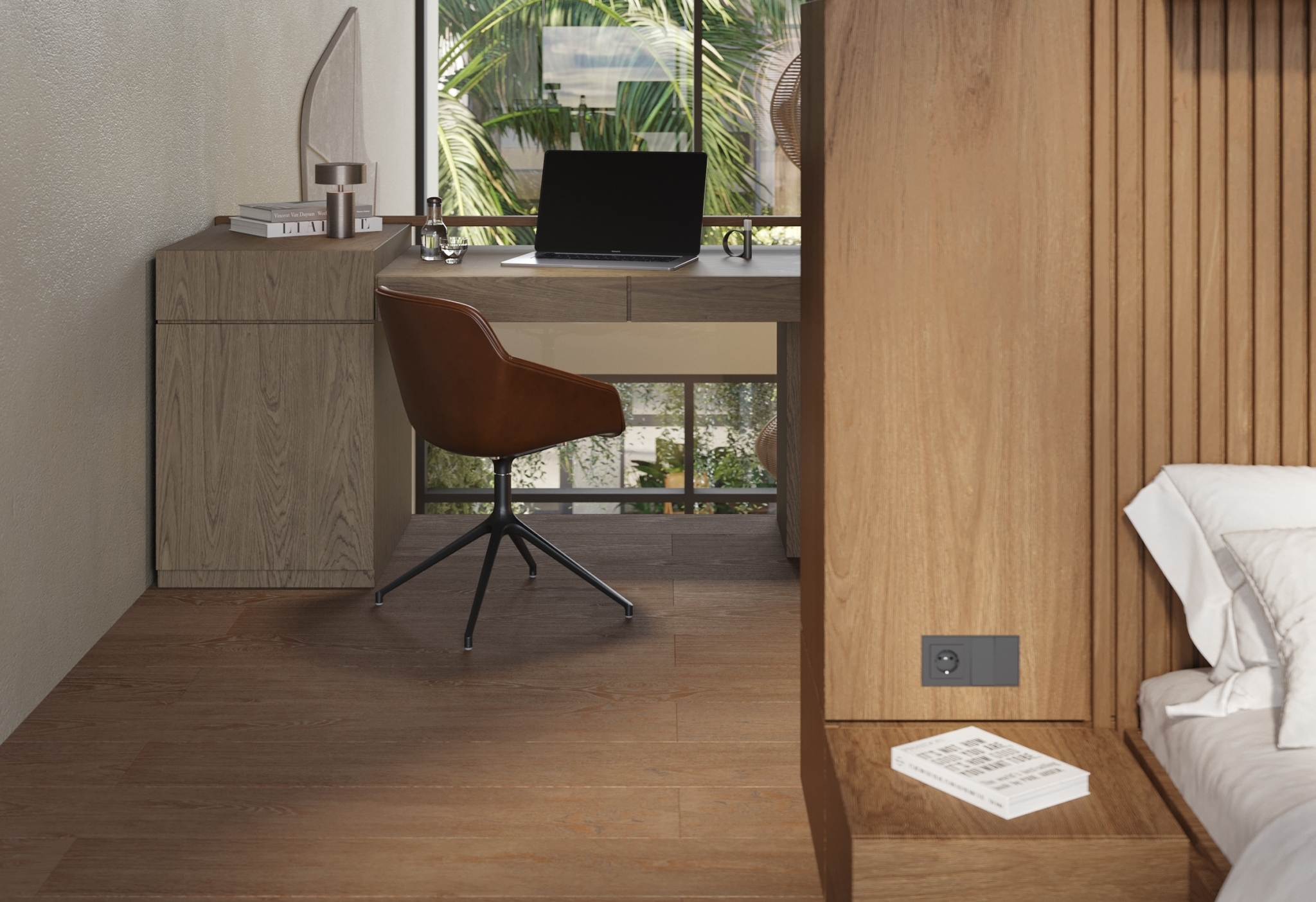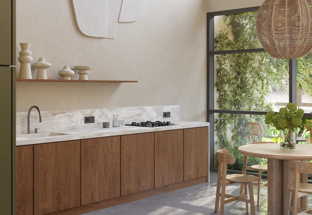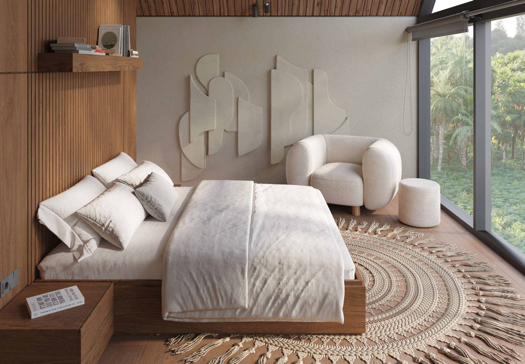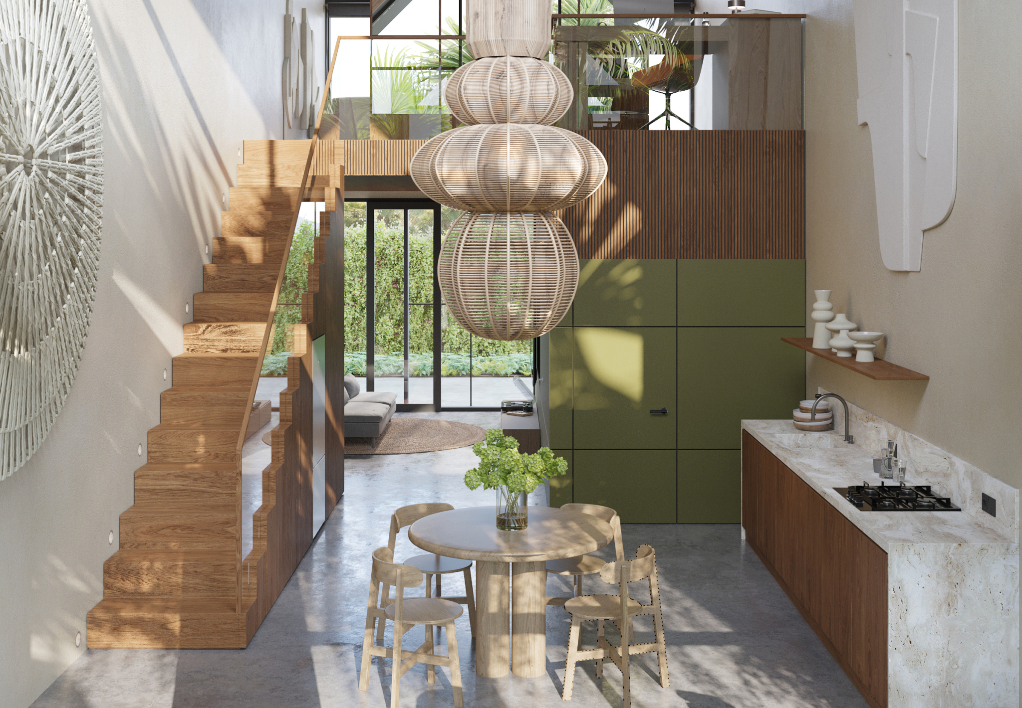 The thoughtfully designed interior features neutral tones and soft finishes, creating a serene atmosphere perfect for both living and investment. The sunlit living room opens to a garden, while the mezzanine-level bedroom offers a peaceful retreat with stunning views of the surrounding landscape.