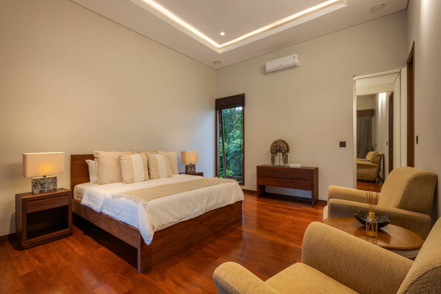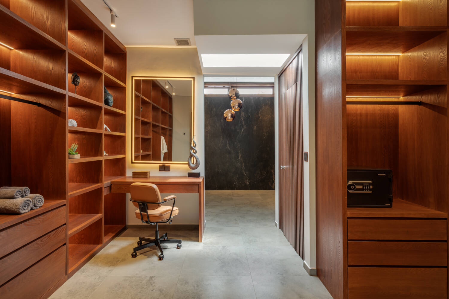 The villa is intelligently divided into two wings and designed for both private living and high-end rental performance. All six bedrooms are oversized and feature wooden floors, walk-in wardrobes, spacious ensuite bathrooms, AC, ceiling fans, ventilation systems, and dedicated desk areas.