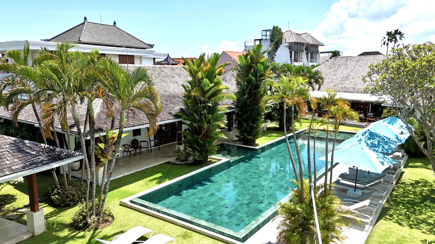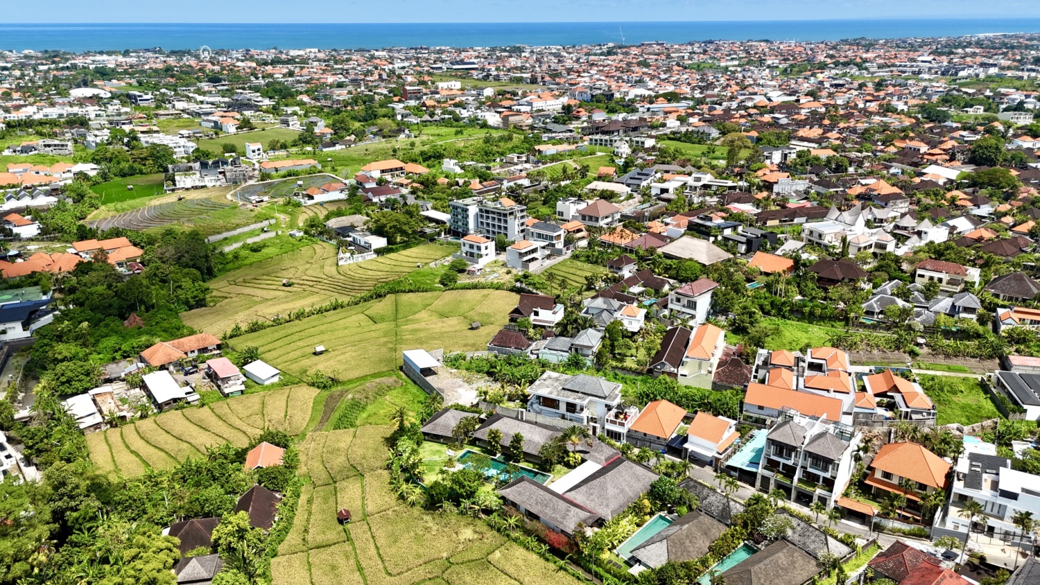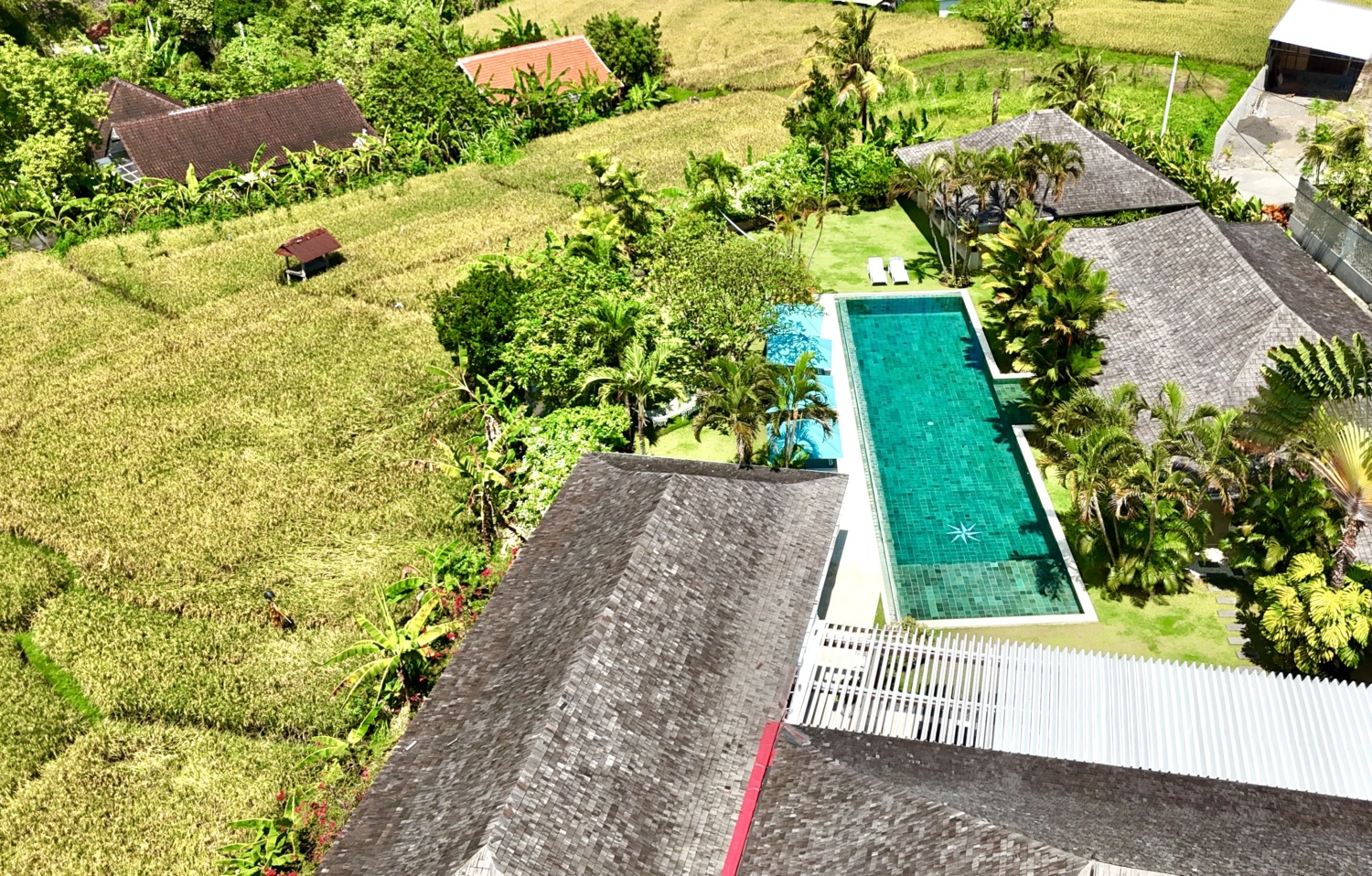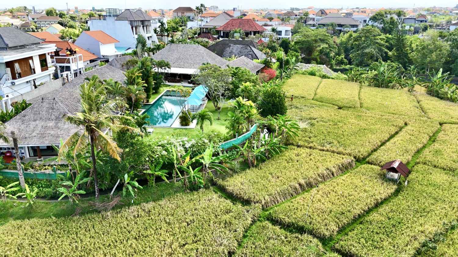 Tucked away at the end of a peaceful residential street in the heart of Canggu, this luxury five-bedroom villa offers an extraordinary blend of tropical serenity and elegant design. Surrounded by lush rice fields protected by green zone regulations, you are guaranteed uninterrupted panoramic views — no risk of future developments disrupting your private paradise.