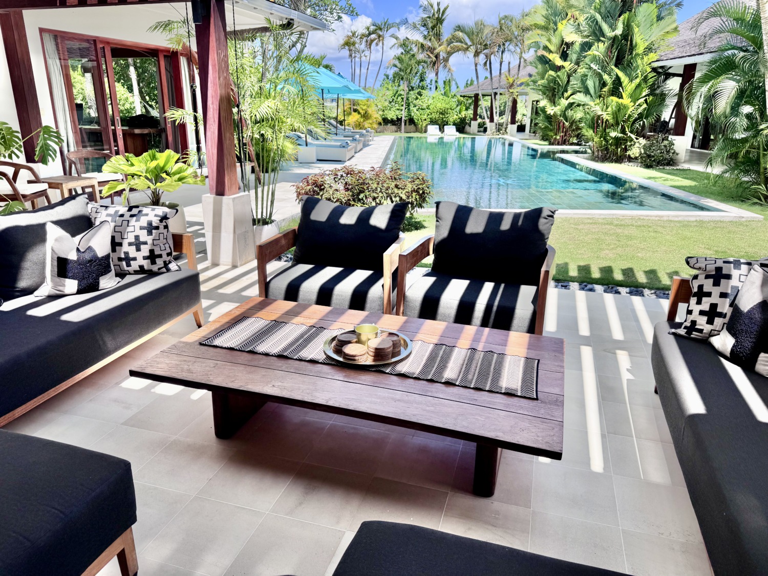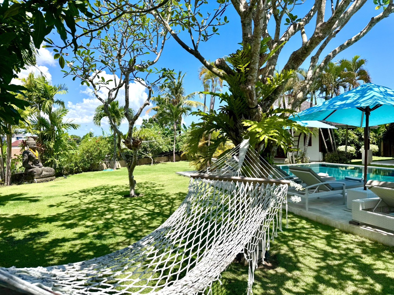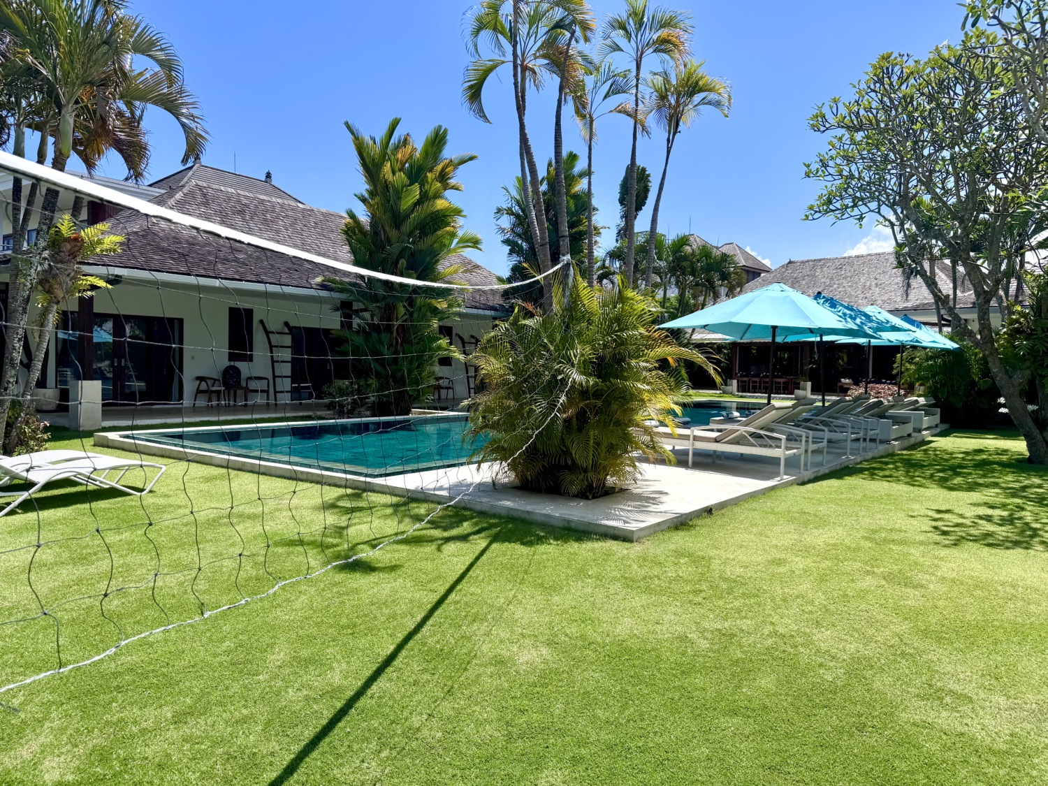 The highlight of the property is the magnificent 24-meter-long swimming pool, nestled within a beautifully landscaped tropical garden that transforms into a magical oasis at night with ambient lighting. A volleyball net, hammock area, and small gym corner enhance the outdoor experience, making it ideal for families, group gatherings, or private retreats.