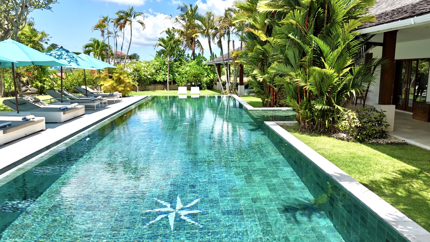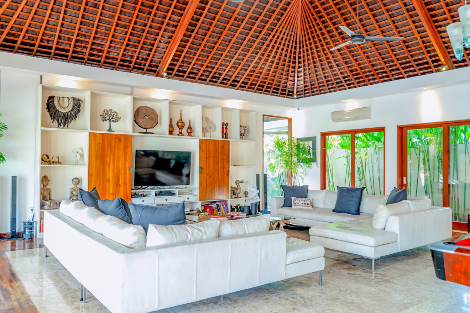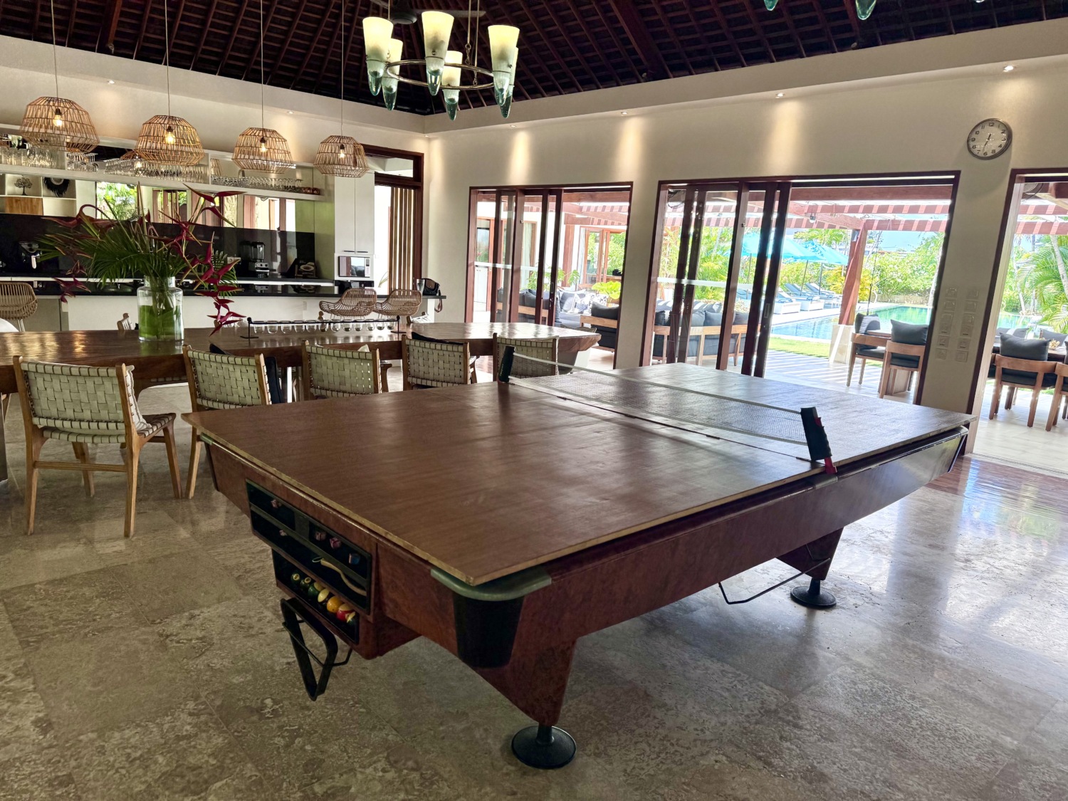 Set on a generous 1,700 sqm plot and featuring 500 sqm of well-planned living space, the villa boasts a wide enclosed living area with soaring joglo-style wooden ceilings, seamlessly connecting indoor luxury with outdoor beauty. The oversized living room is an entertainer’s dream, complete with a pool table, ping pong table, and expansive lounging zones, all framed by a stunning chandelier centerpiece.