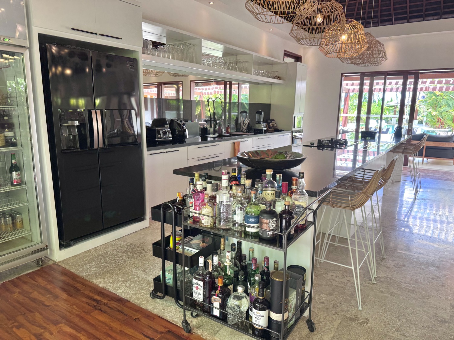 The kitchen is fully equipped and features high quality material and amenities. An additional outdoor kitchen near the master bedroom creates a charming setting for casual barbecues and alfresco dining.
