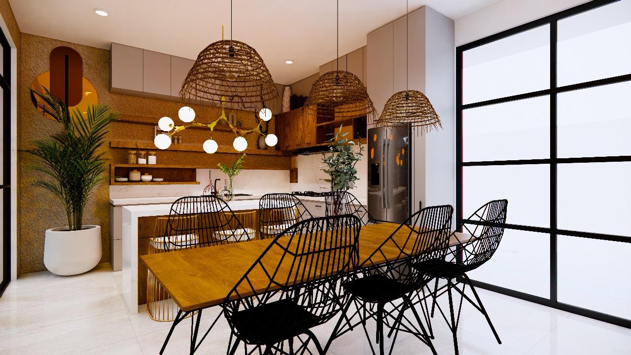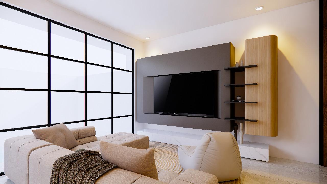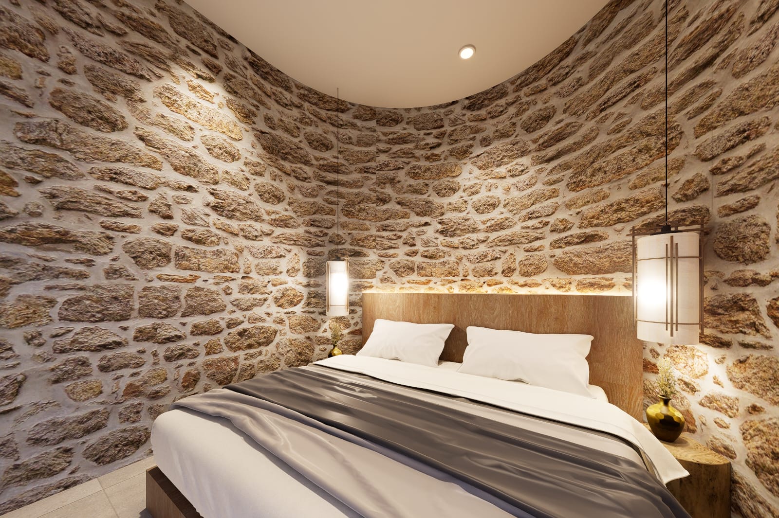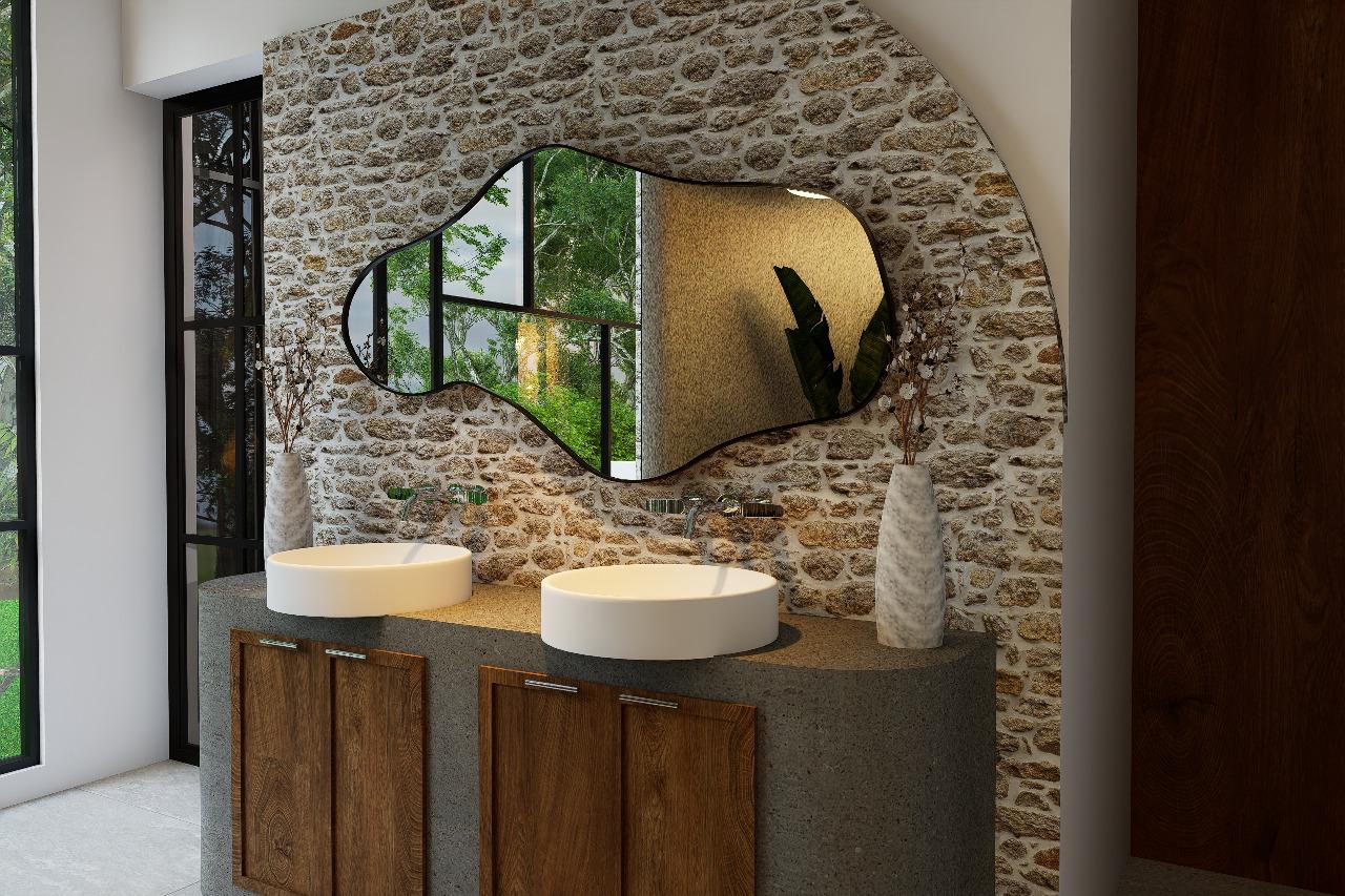 The interior layout is thoughtfully designed to balance openness and comfort. Three spacious bedrooms, each with its own ensuite bathroom, provide private retreats, while an additional guest powder room enhances everyday convenience. Natural textures, soft curves, and warm finishes define the living spaces, allowing light and airflow to move effortlessly throughout the home.