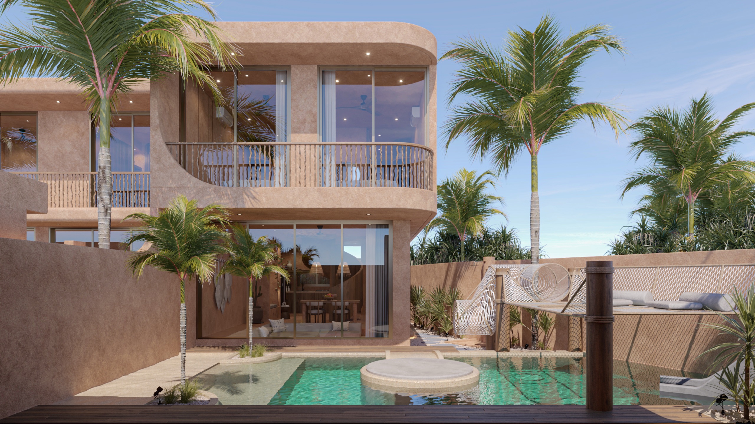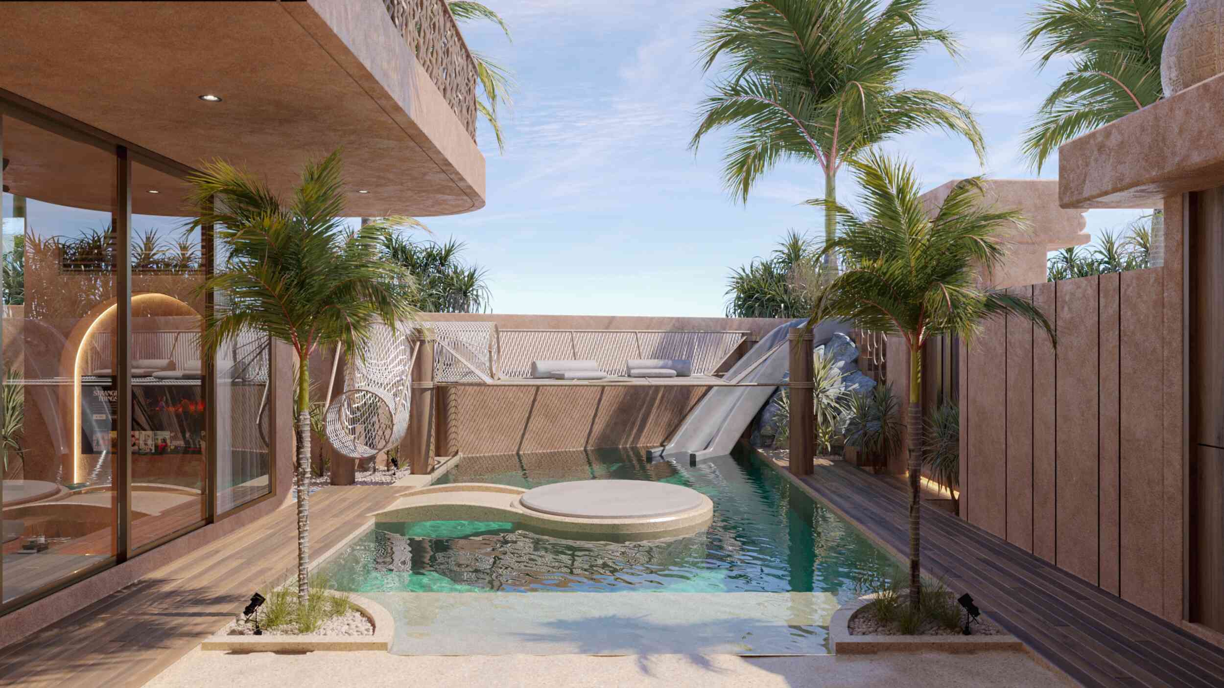 This contemporary townhouse villa sits in one of Tumbak Bayuh’s strongest investment pockets, just minutes from Pererenan and its beaches. It’s designed as a comfortable, practical home with a playful outdoor layout that stands out in the market. The villa includes a net over the pool and a small slide that leads directly into the water — a rare feature that makes it especially attractive for families and for rental demand. The outdoor area is compact but well planned, making it easy to maintain while creating the right tropical feel.